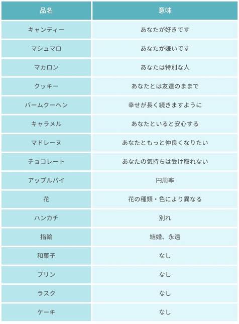 昔からホワイトデーのお返しは『キャンディーは本命』『ハンカチはお断り』なんて言われていましたが、最近じゃあお菓子にしろ小物にしろ物凄い種類の意味を持たされているそうです