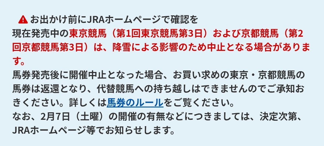 東京8R以降は積雪のため取りやめになりました