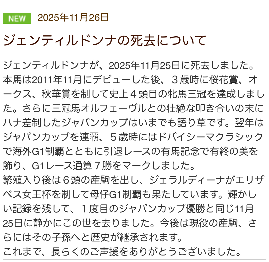 直近で母ハルーワスウィートに息子のブラヴァス、ライバルだったメイショウマンボそして今回ジェンティルドンナまで旅立ってしまったけど現役時代みたいなド根性で生き抜いて欲しいよ