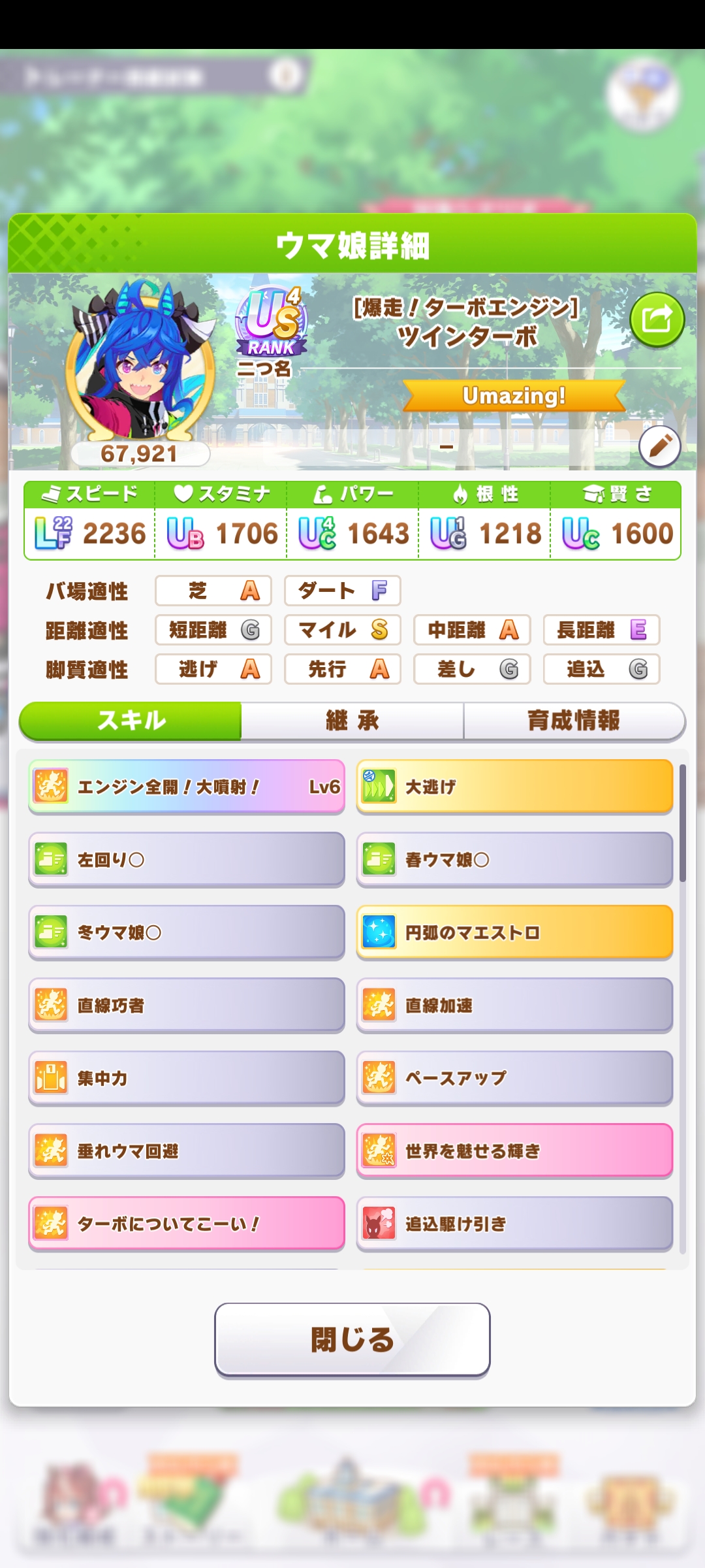 先日ふとダート専用の因子無かったなぁ…と、思って作ったら白因子90(ほぼダートスキル+汎用)が誕生したけど需要あるかなあ…