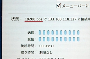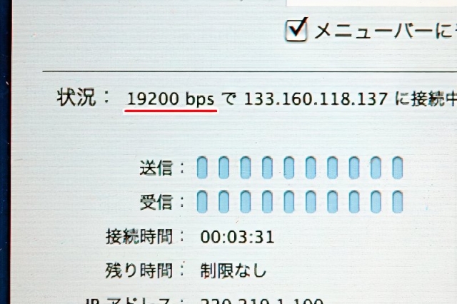通信速度はアナログモデムでは最高56kbps、ISDNでは64kbps〜128kbps