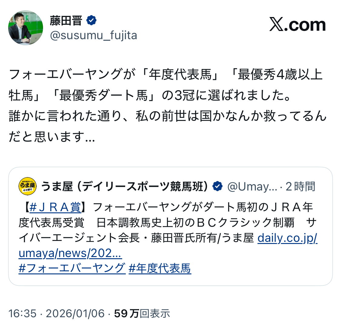 JRAの年度代表馬 フォーエバーヤングが受賞