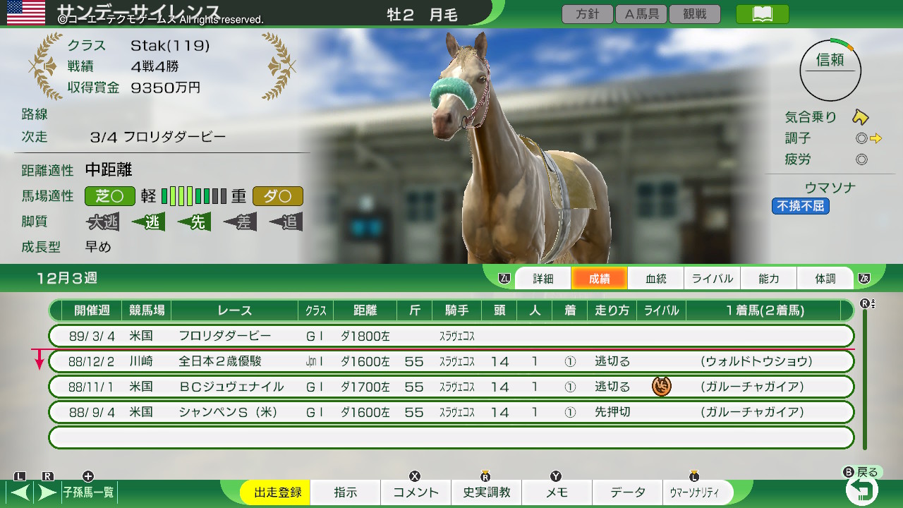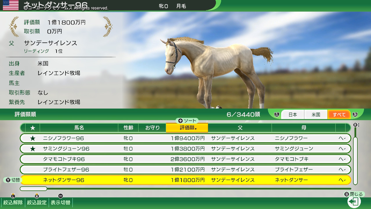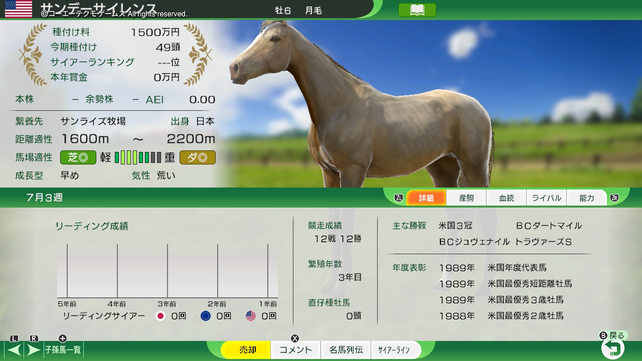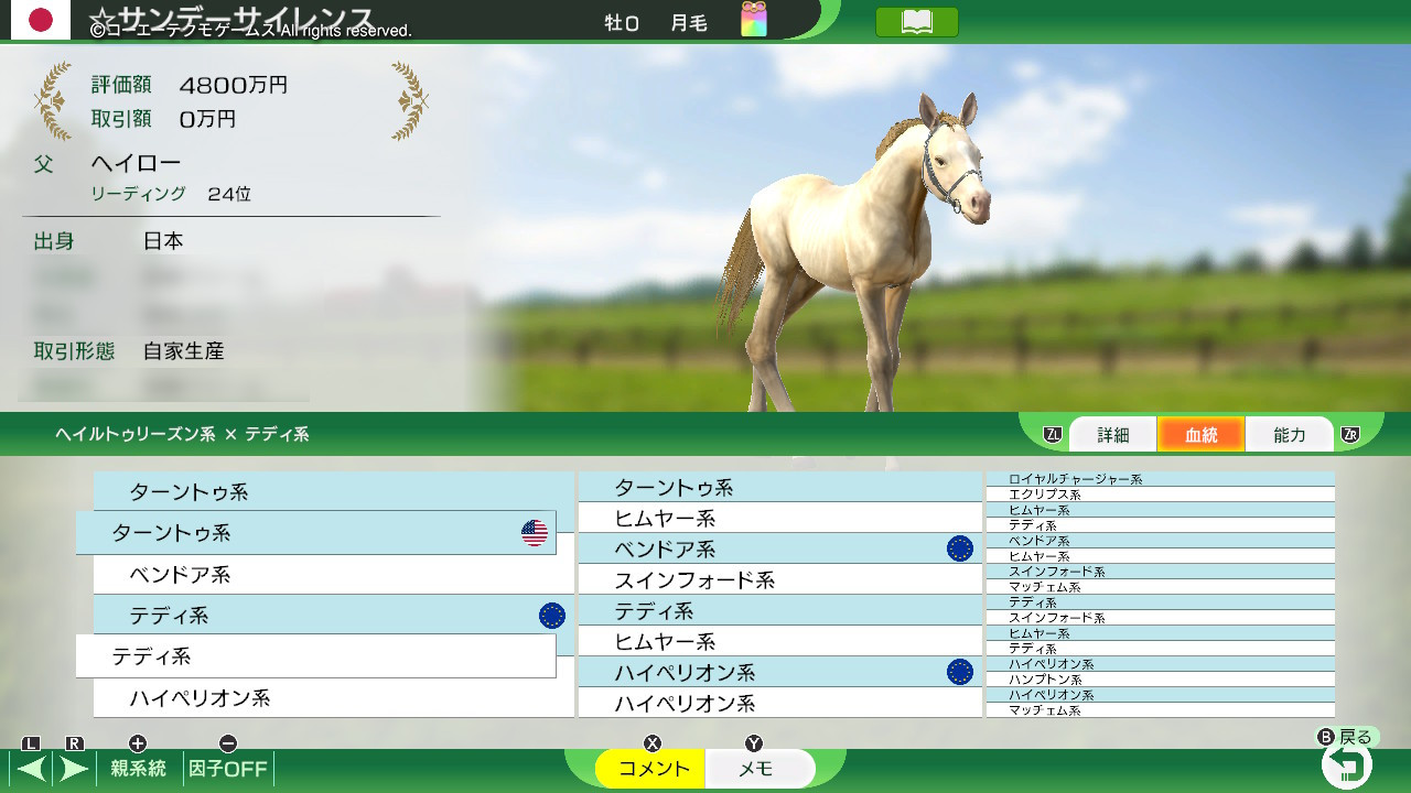 サンデーサイレンスの毛色を月毛にして生産します。あとは勝手に繁栄していくから月毛ちゃんがいっぱい出てきたらいいな……