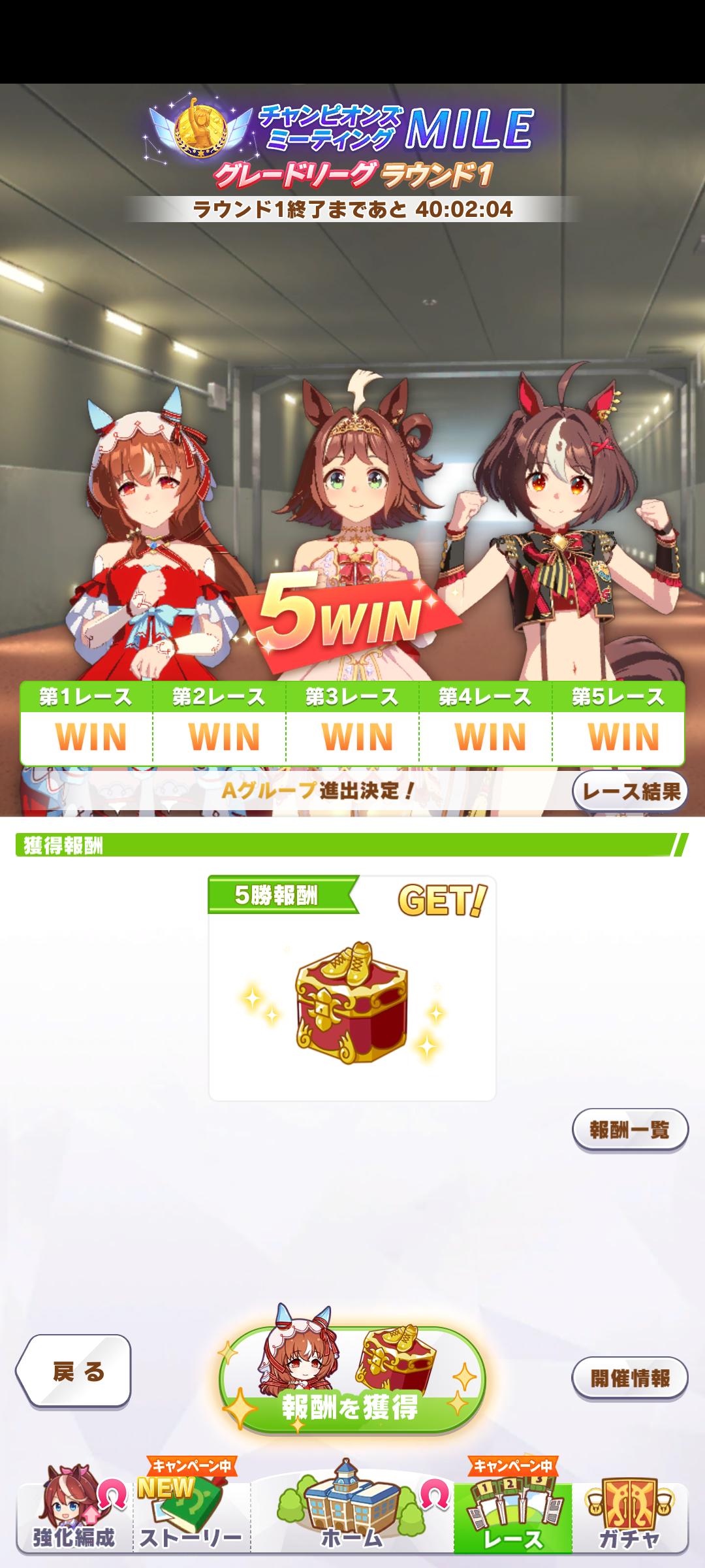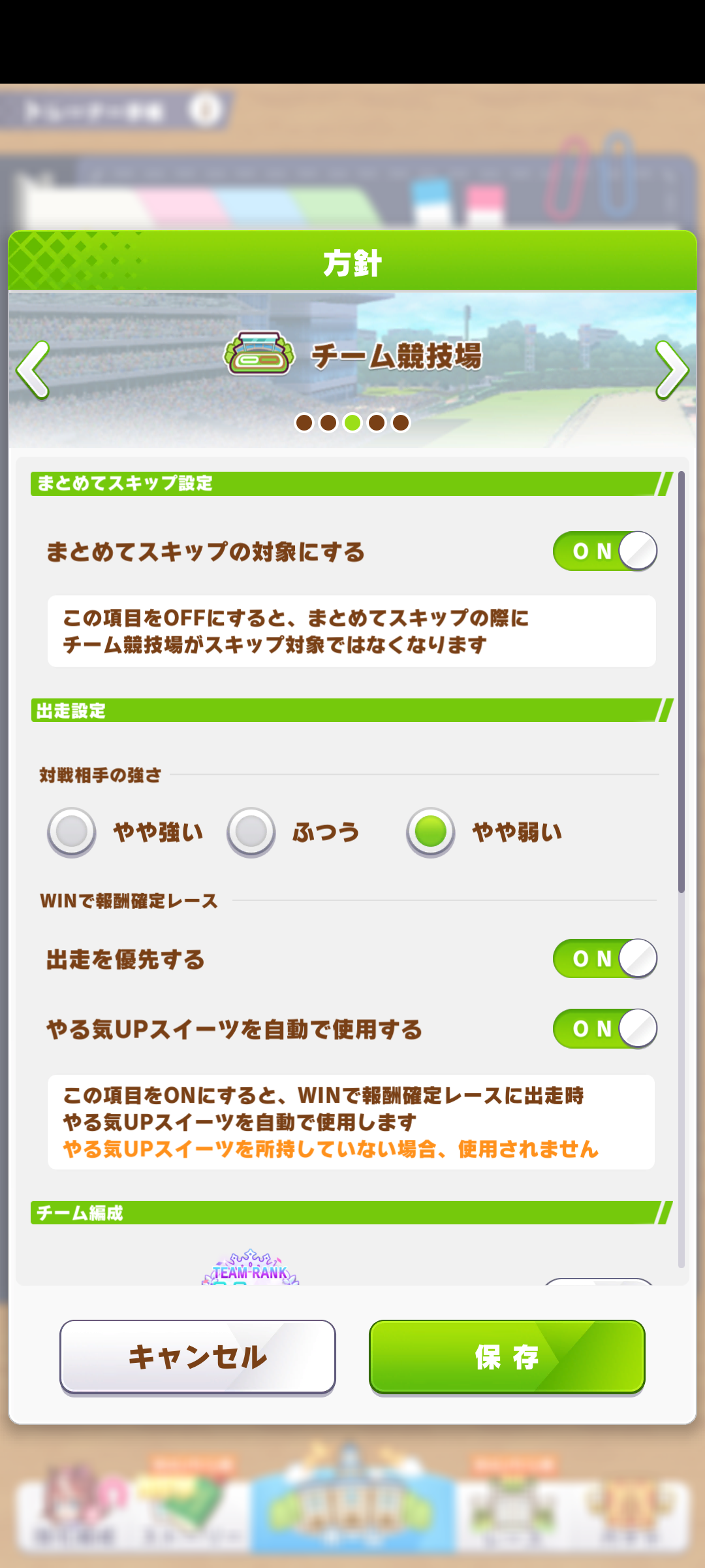 チーム競技場のまとめてスキップ機能、WINで報酬確定以外のレースも全てやる気アップスイーツ使えるようにして欲しかったと思う