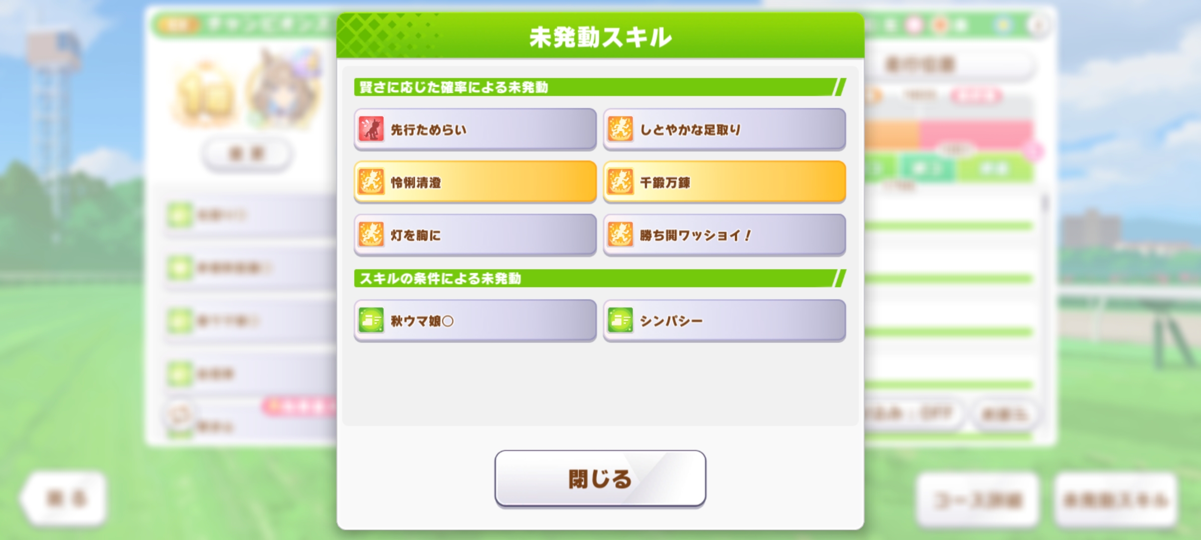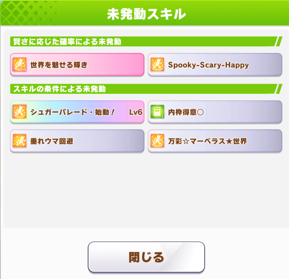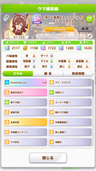 固有スキル 金スキル 進化スキルの速度アップ/前に出るスキルが賢さ1200以上からの数値に応じて強化されるようになるので、中盤速度からの終盤接続がより強力なものとなるでしょう。