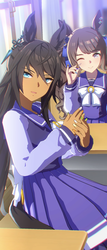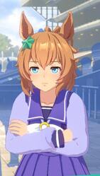 イヌ娘『シンボリクリスエス』は嫉妬を表情や行動に出す事はありませんが、嫉妬すると何故か飼い主との距離が近くなり、座っているとペタッとくっ付いてきます。また、本人は無自覚らしく何故近いのか聞いても首を傾げてしまいます。そんな時はゆったりと寄り添ってあげましょう。数時間経つと幸せそうな表情をして、去っていきます。時々「頭を撫でてほしい」と催促してくるかもしれませんがその時も勿論撫でてあげましょう。