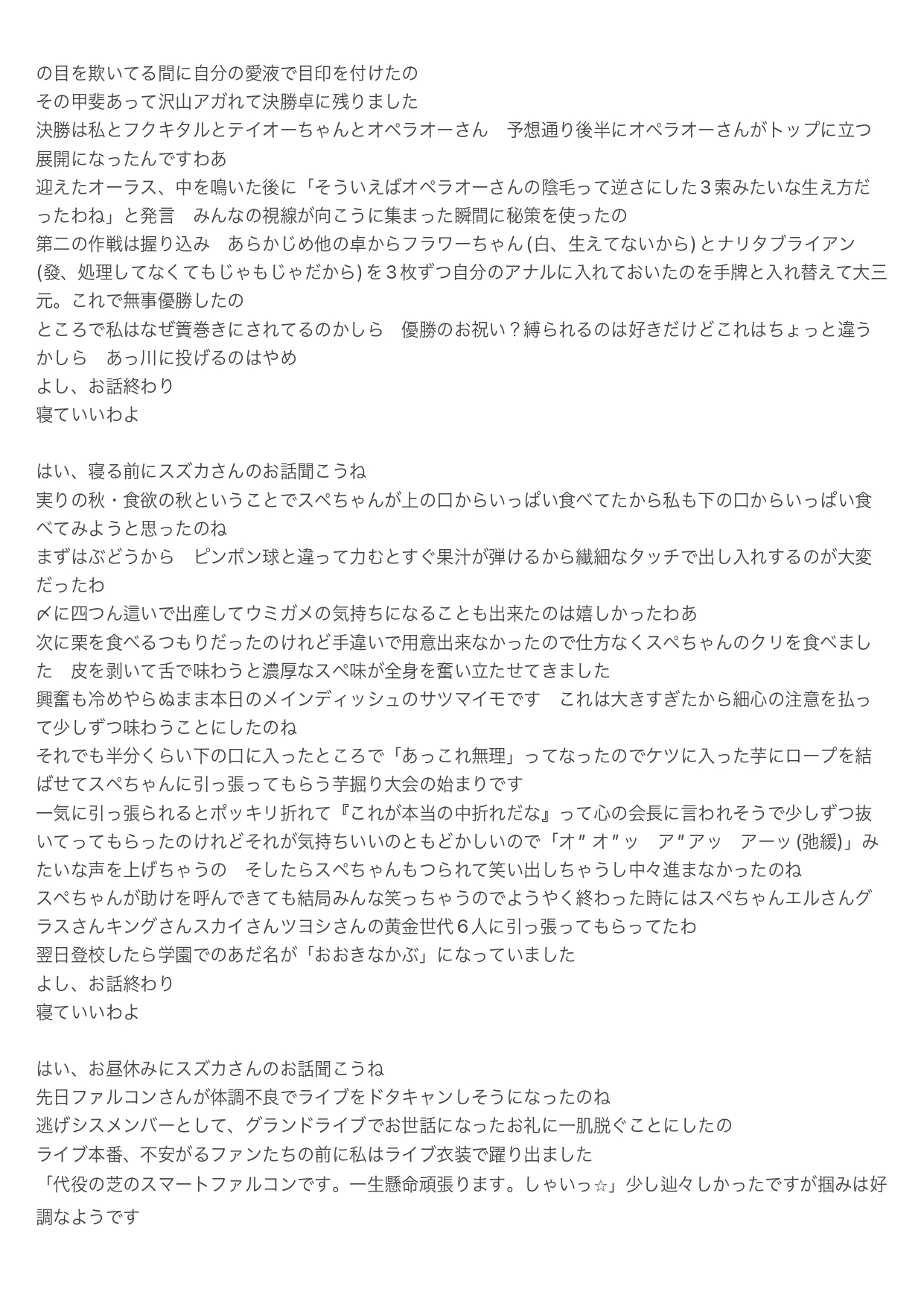仕方ないからフクキタルを呼んでうまぴょいしてたのだけど、つい白熱しちゃってロイヤルビタージュースのことをすっかり忘れてたのね。フクキタルがスズカさんの桜花賞を舐めて絶頂させられた時に、潮と同時に全部飛び出たわあ。しかも、緑色の液体と同時に錠剤も飛び出て、ひとりエイリアンvsプレデターになっちゃった。