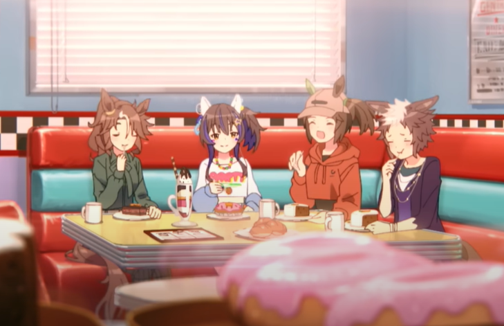 オグリに野菜を押し付けるブライアン、全部食べるオグリ、野菜も食べないとダメですよと諭すクリーク、ダジャレ考え続けてるカイチョー