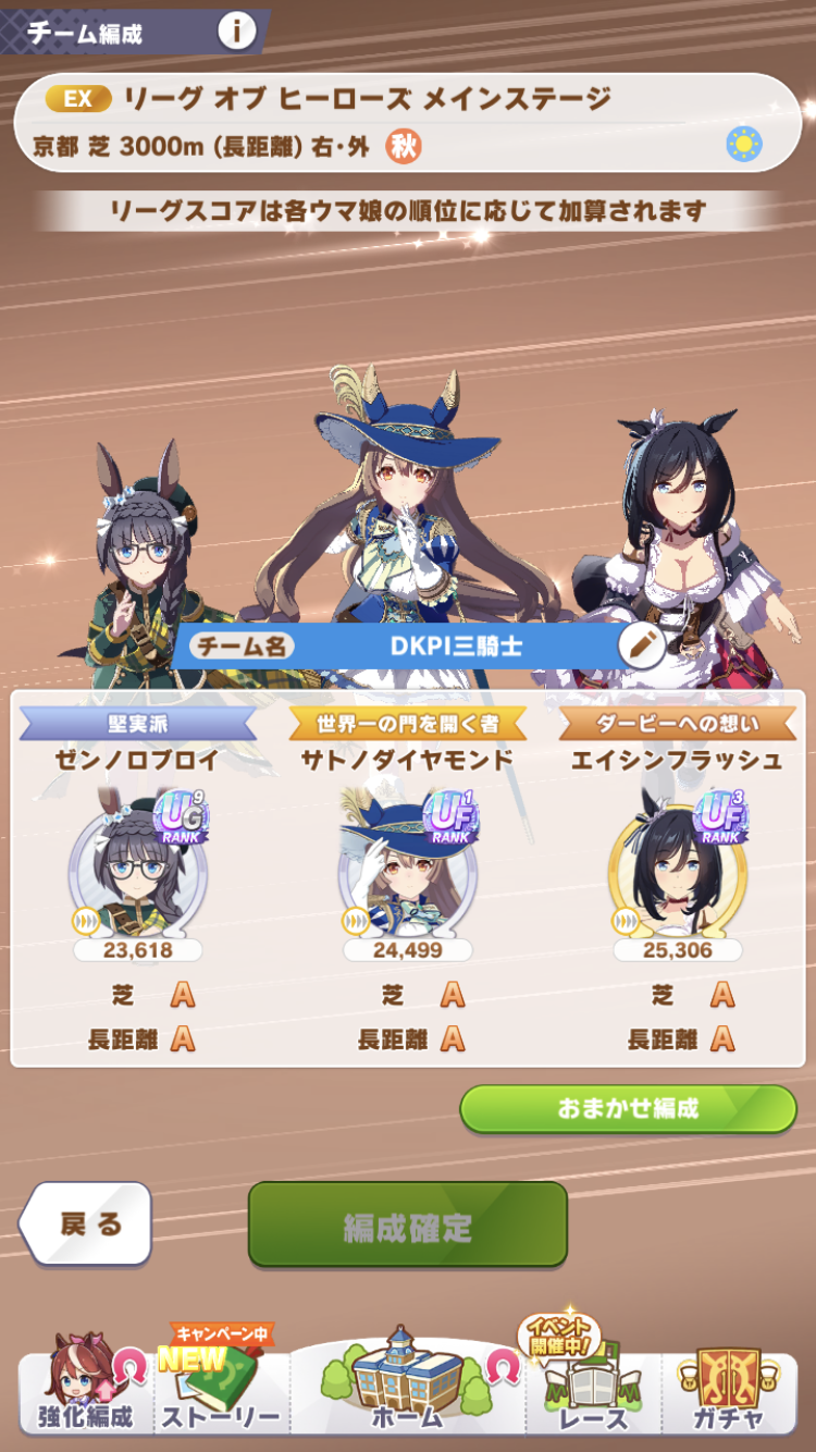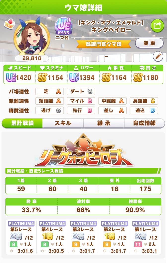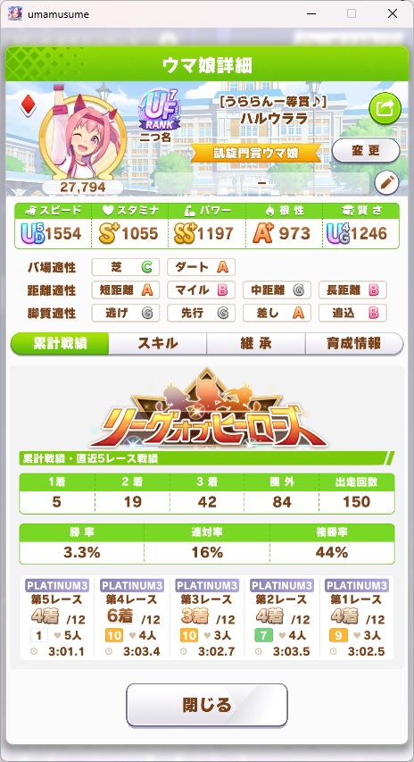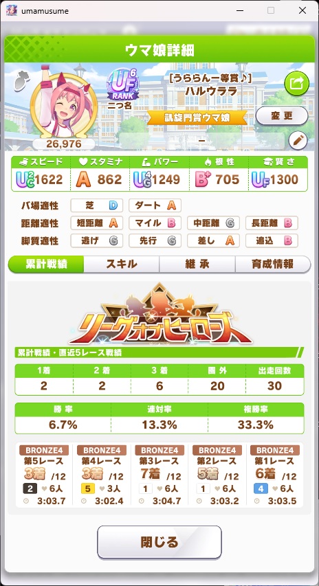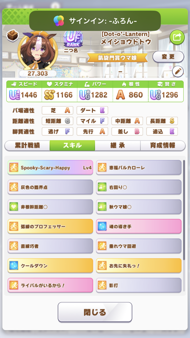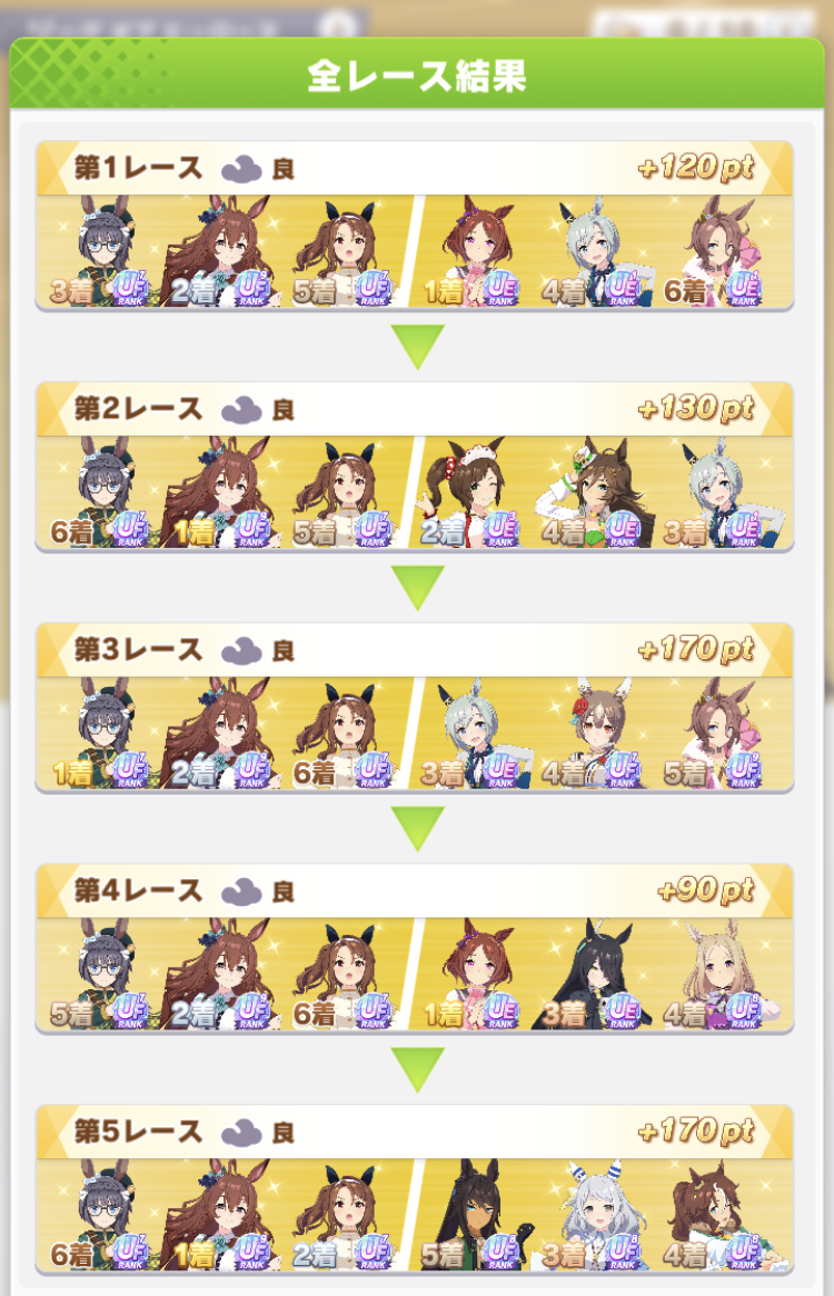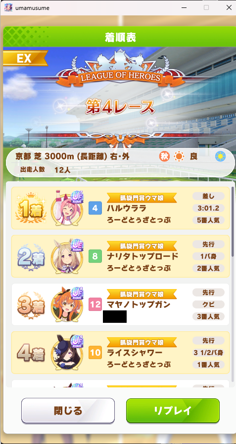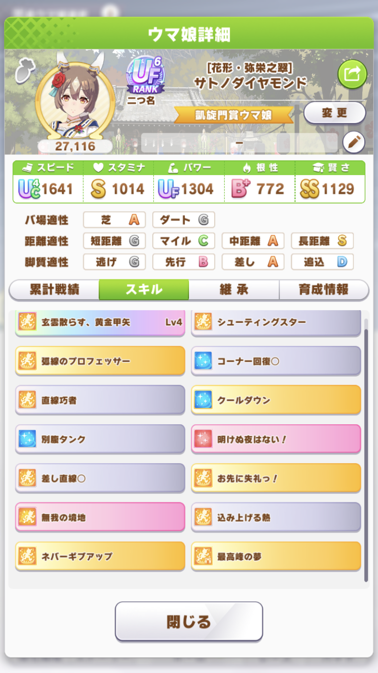 さすがに今回30000ボーダーギリギリの人達のウマ見てると普段のチャンミなら決勝レベルは順当に行くと掲示板外だよ。勝てるとしたら相手が全員出遅れ&掛かりとかで固有と加速が全員分不発でようやくスタートライン。