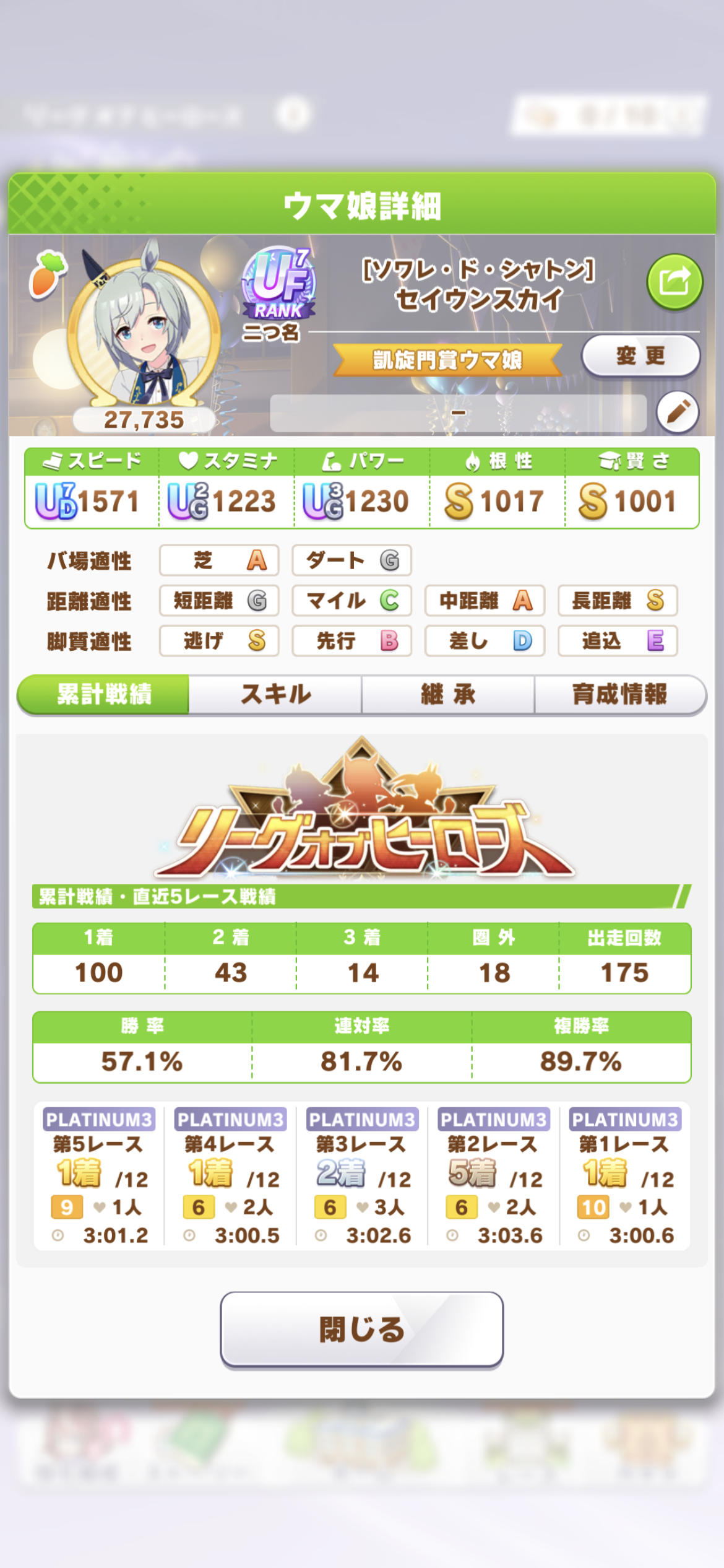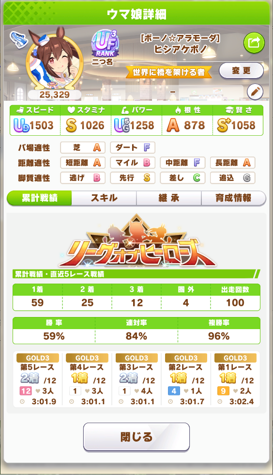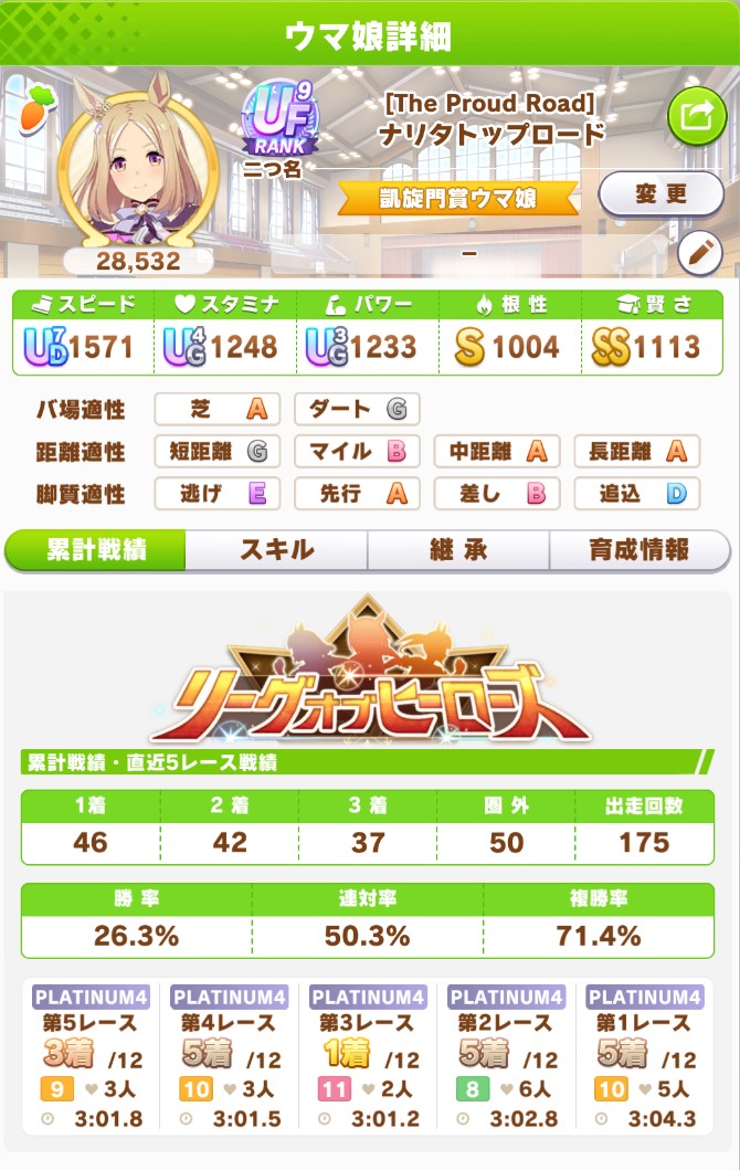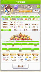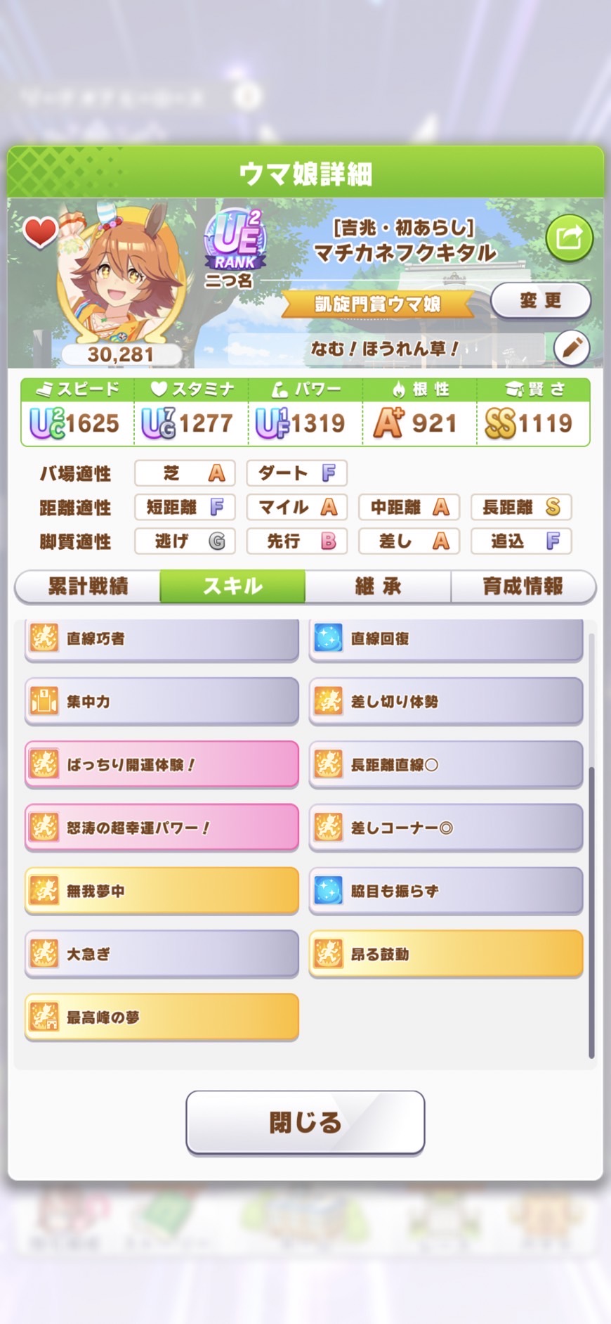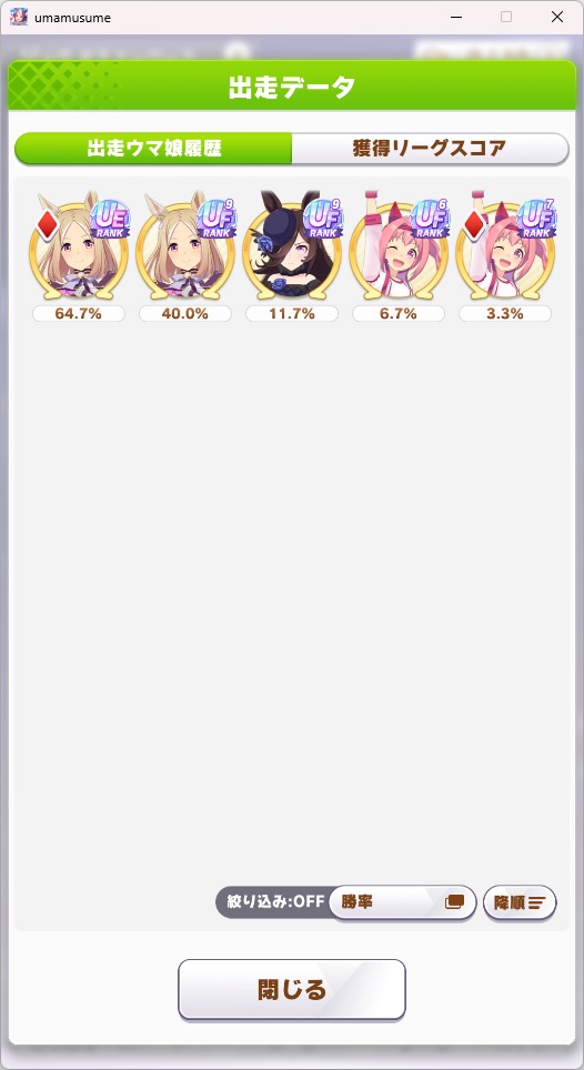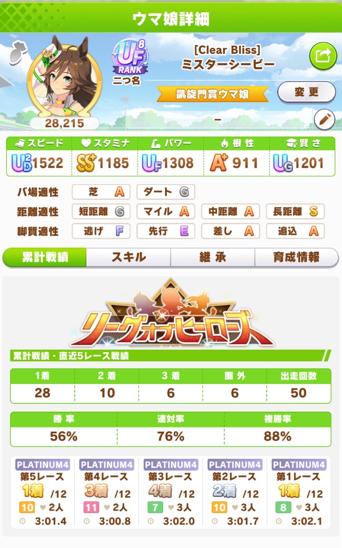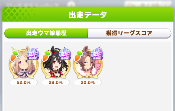 さすがに今回30000ボーダーギリギリの人達のウマ見てると普段のチャンミなら決勝レベルは順当に行くと掲示板外だよ。勝てるとしたら相手が全員出遅れ&掛かりとかで固有と加速が全員分不発でようやくスタートライン。