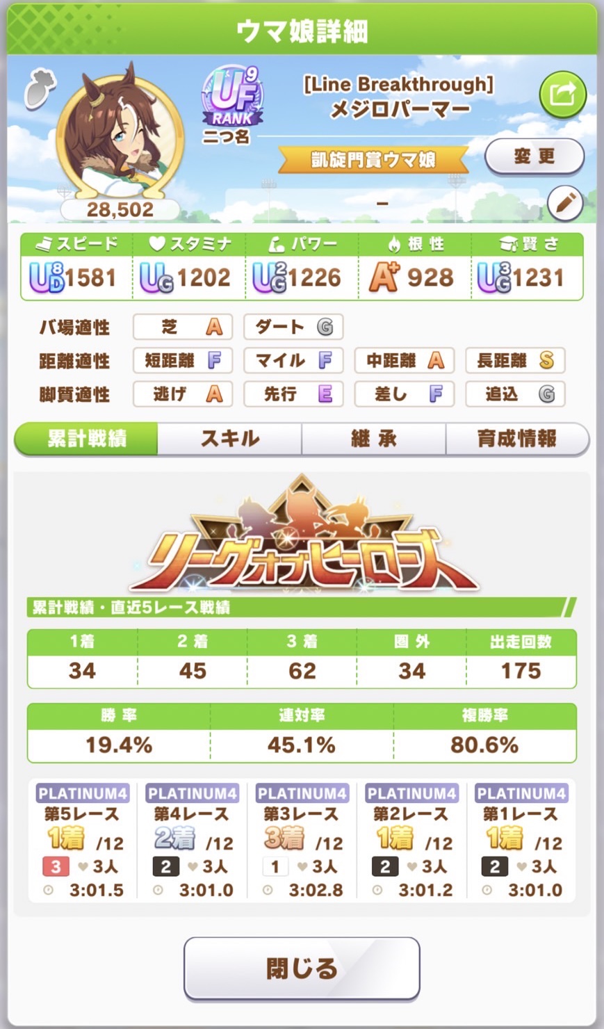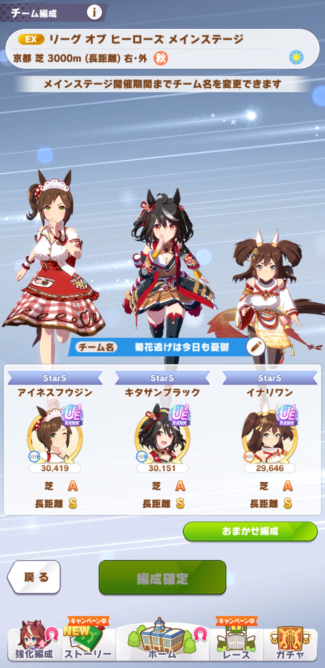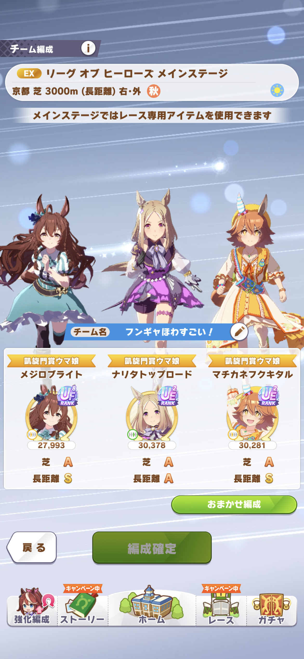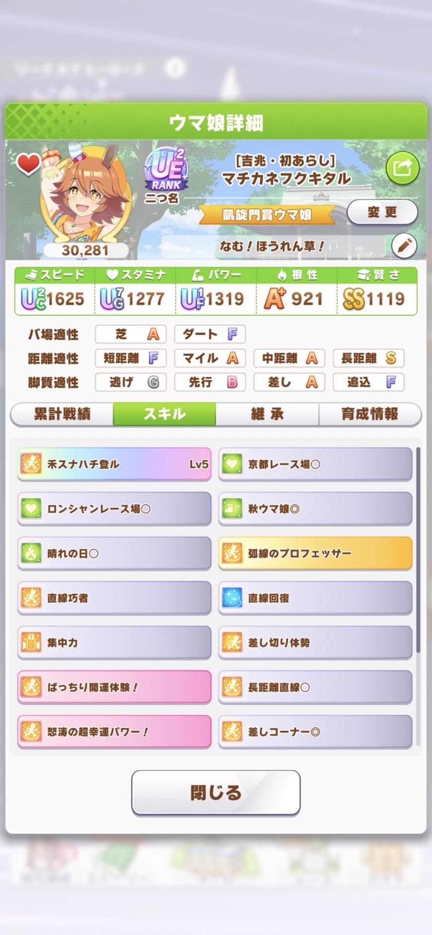 さすがに今回30000ボーダーギリギリの人達のウマ見てると普段のチャンミなら決勝レベルは順当に行くと掲示板外だよ。勝てるとしたら相手が全員出遅れ&掛かりとかで固有と加速が全員分不発でようやくスタートライン。