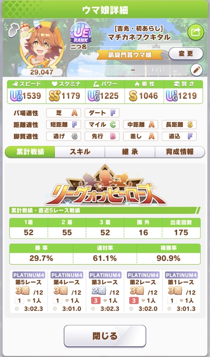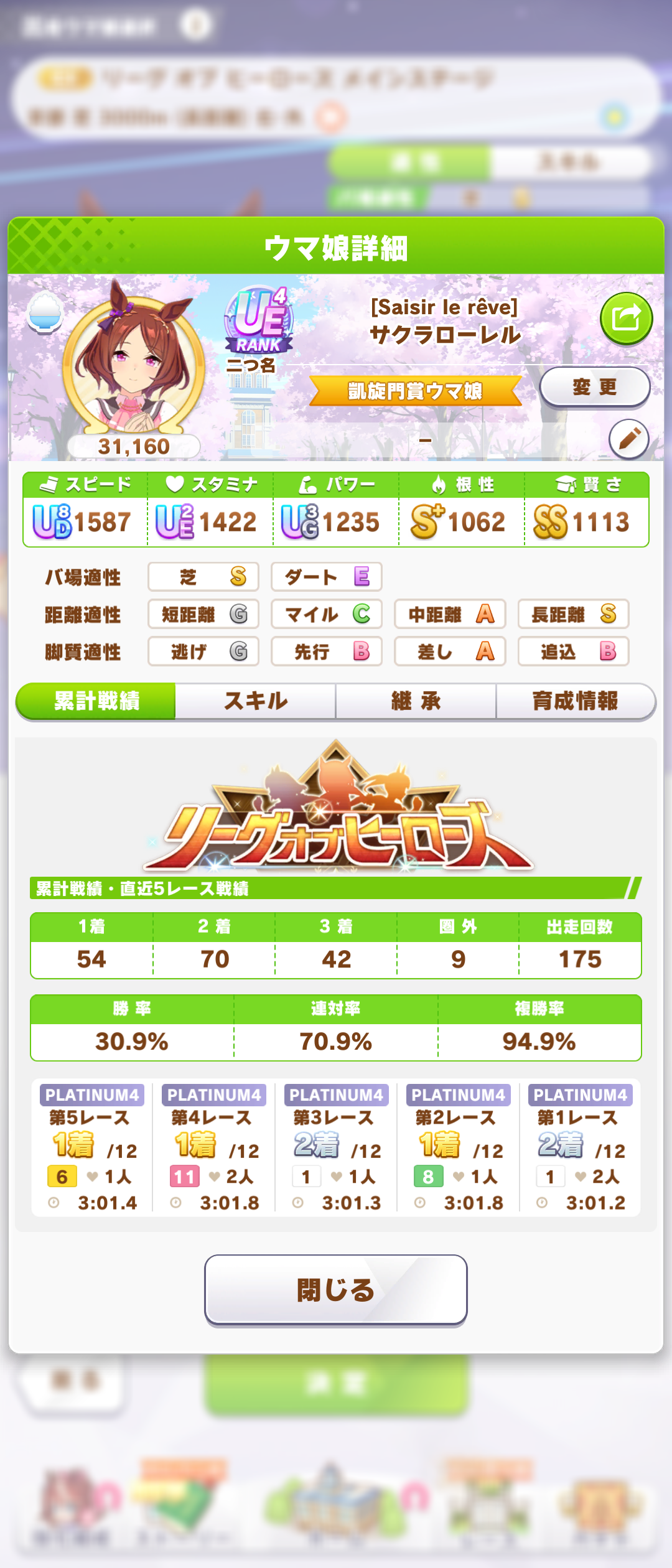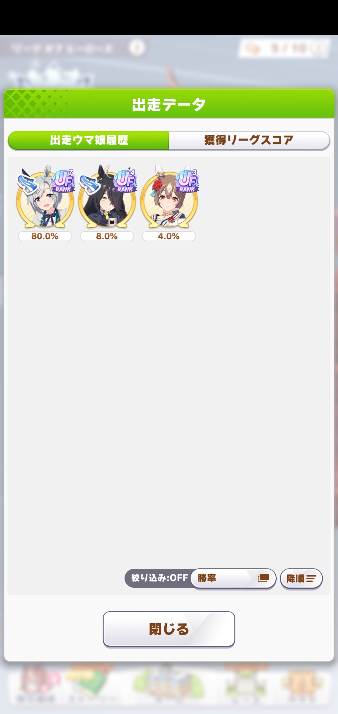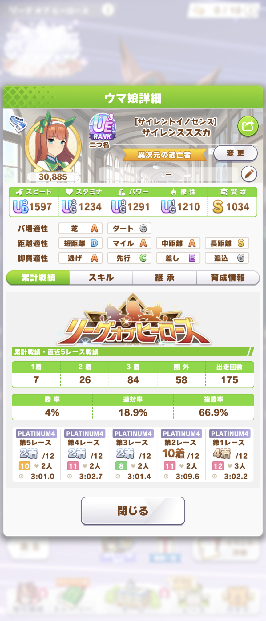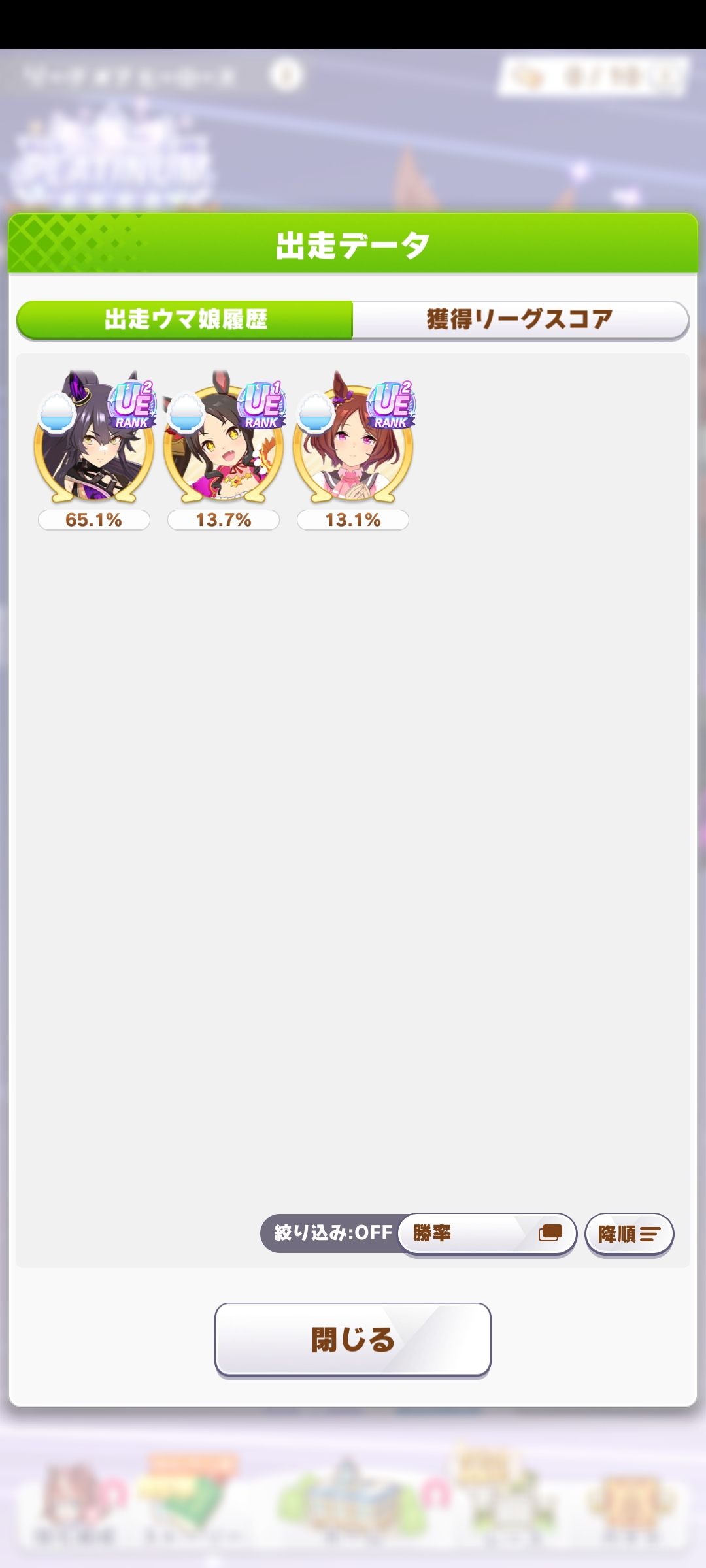 さすがに今回30000ボーダーギリギリの人達のウマ見てると普段のチャンミなら決勝レベルは順当に行くと掲示板外だよ。勝てるとしたら相手が全員出遅れ&掛かりとかで固有と加速が全員分不発でようやくスタートライン。