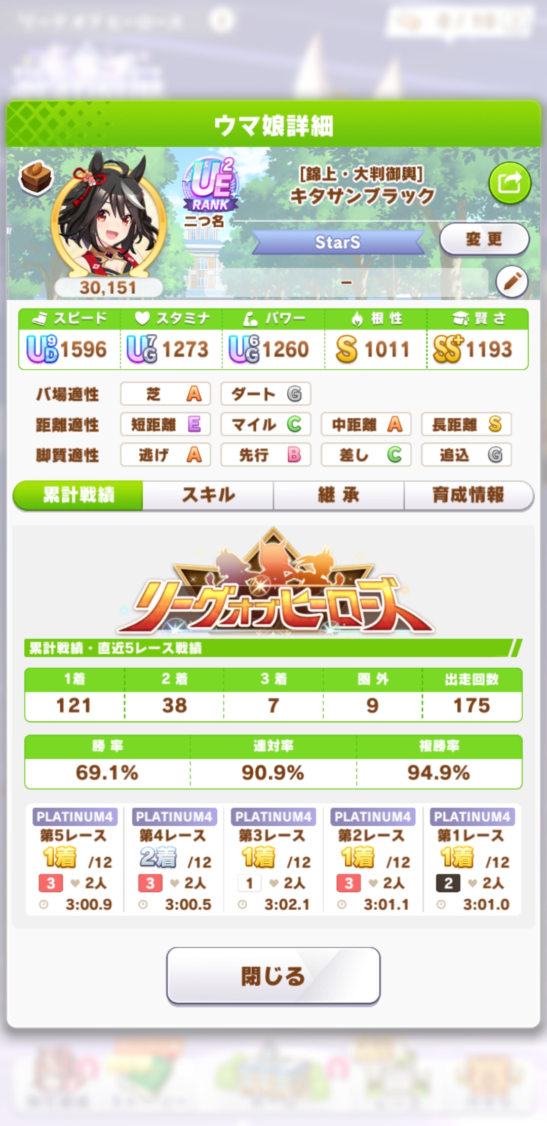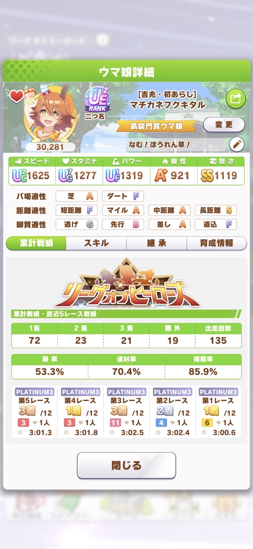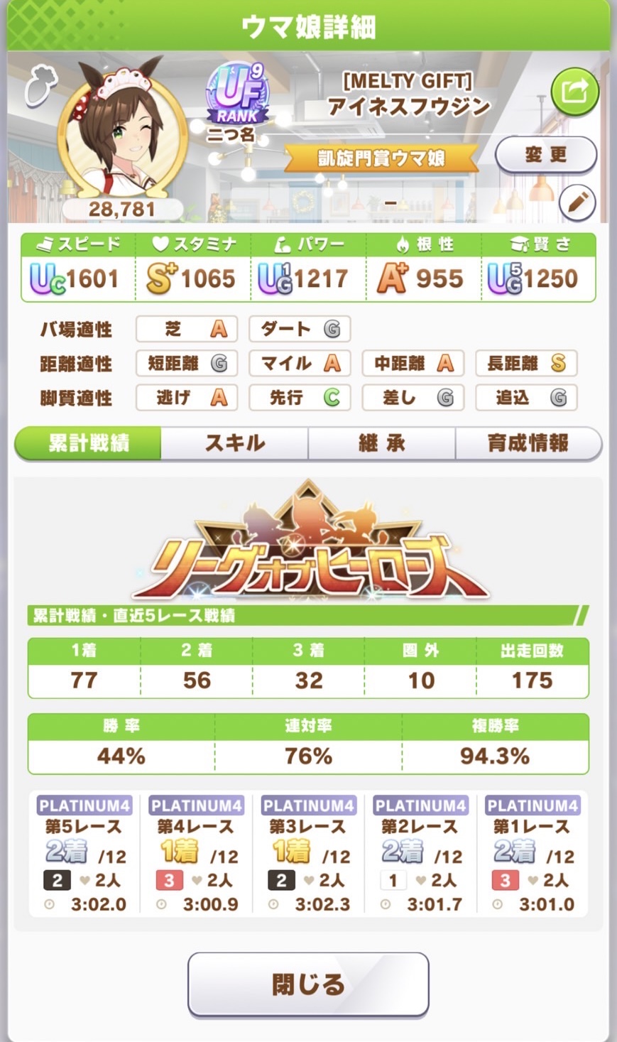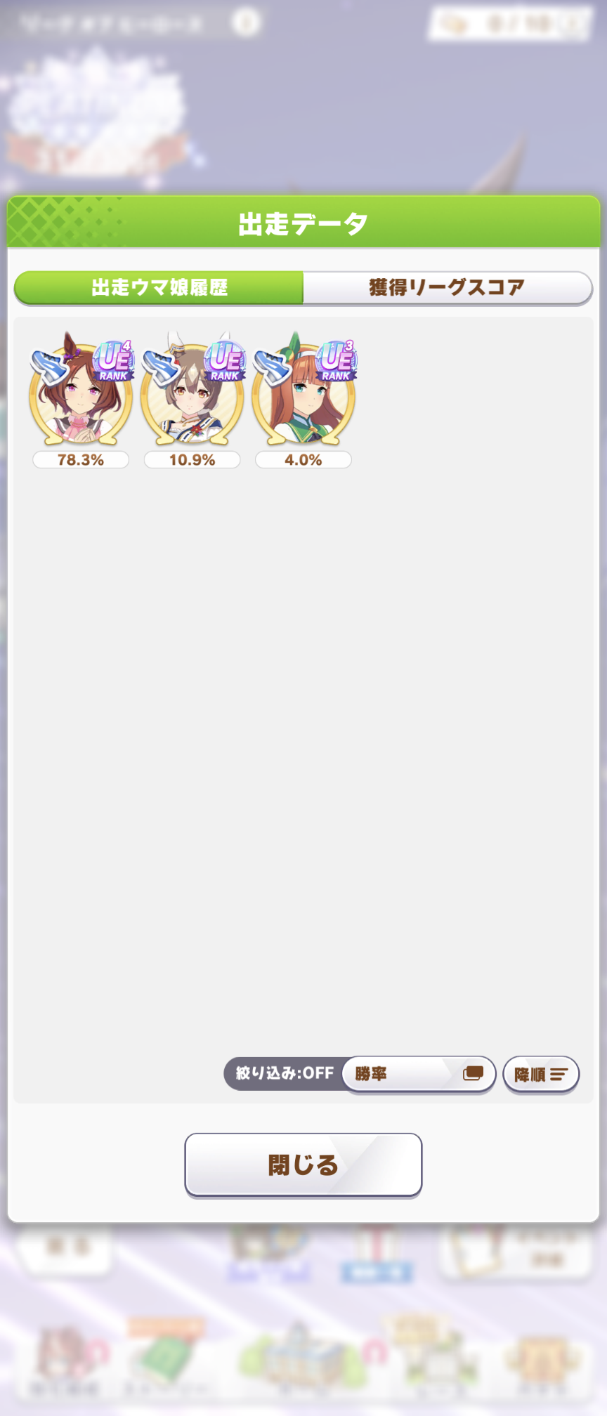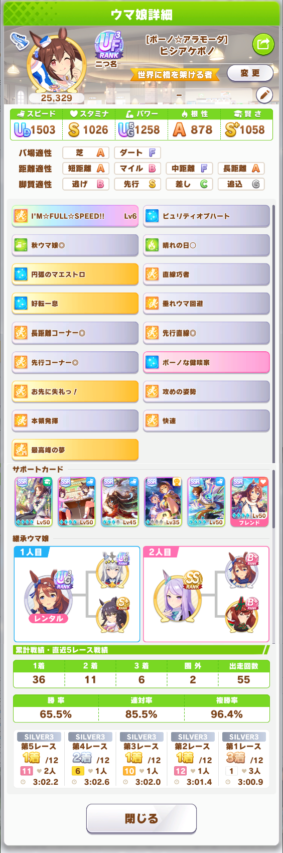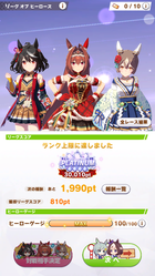 さすがに今回30000ボーダーギリギリの人達のウマ見てると普段のチャンミなら決勝レベルは順当に行くと掲示板外だよ。勝てるとしたら相手が全員出遅れ&掛かりとかで固有と加速が全員分不発でようやくスタートライン。