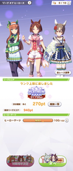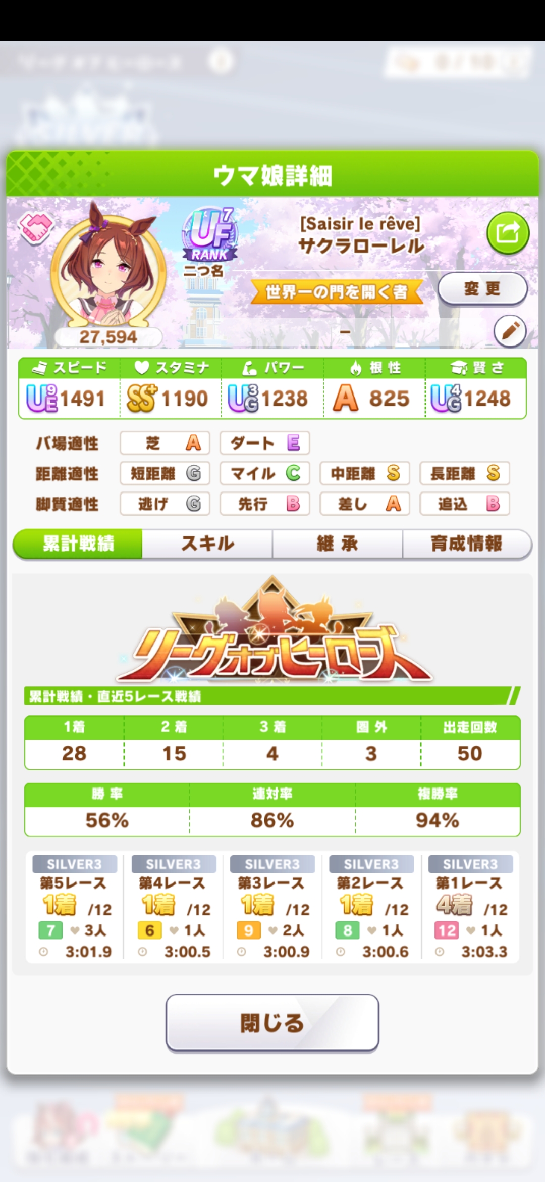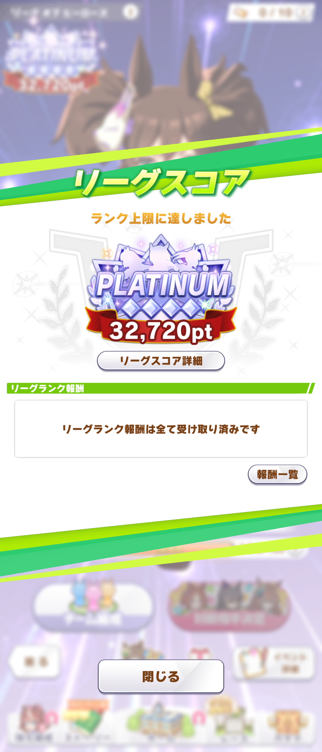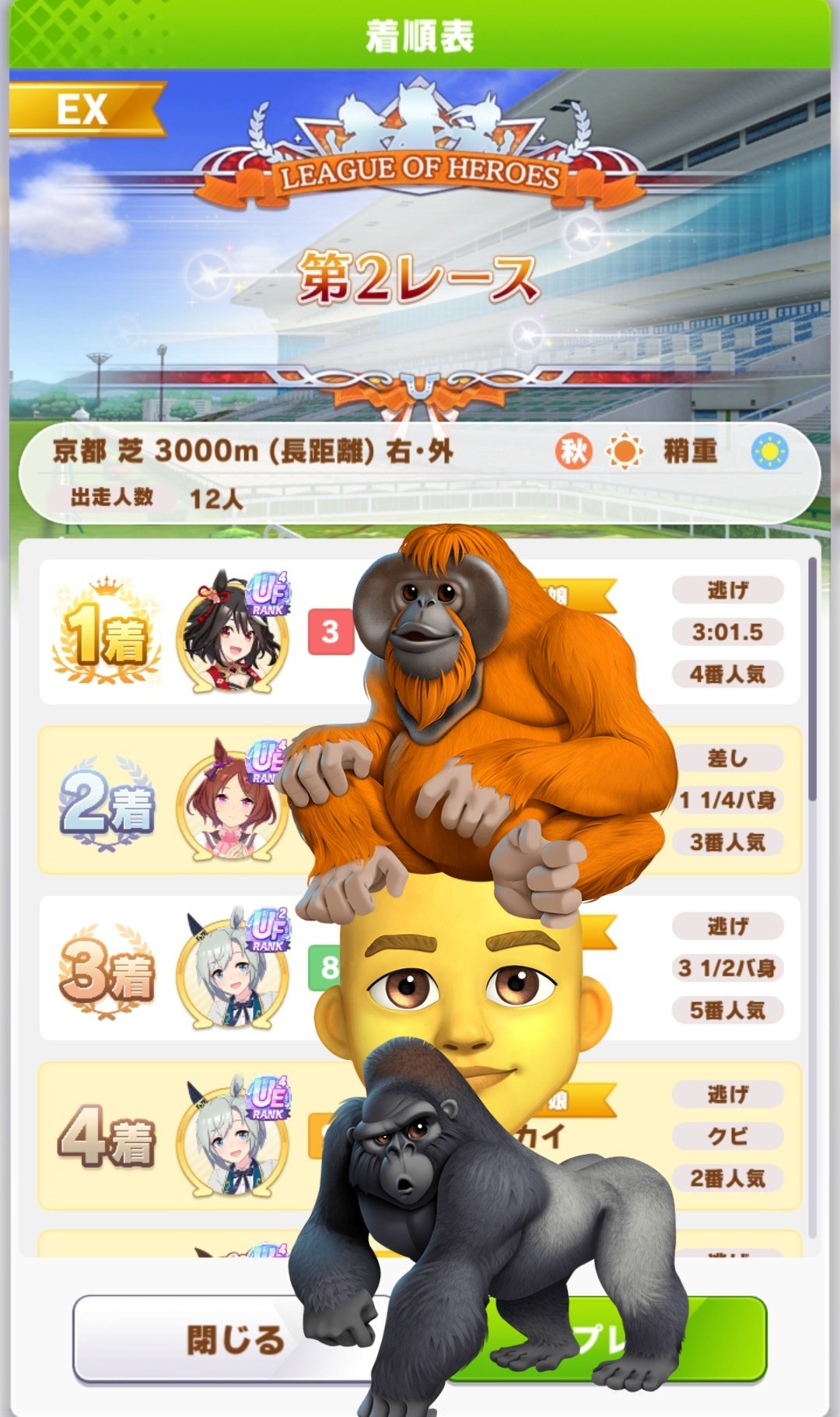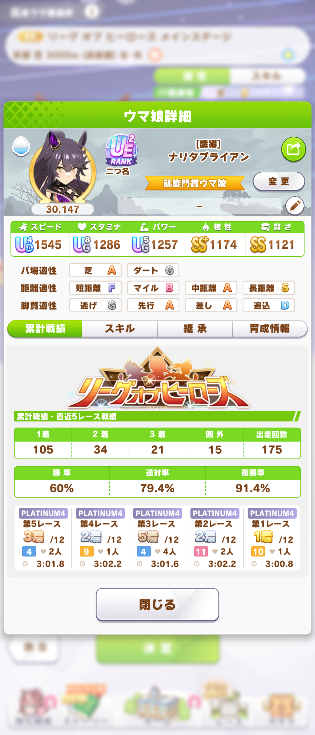 さすがに今回30000ボーダーギリギリの人達のウマ見てると普段のチャンミなら決勝レベルは順当に行くと掲示板外だよ。勝てるとしたら相手が全員出遅れ&掛かりとかで固有と加速が全員分不発でようやくスタートライン。