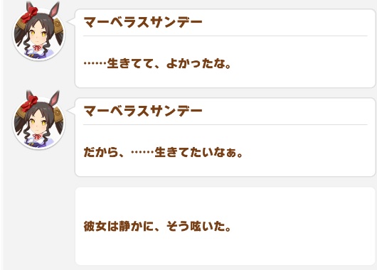 自らの定められた運命、上世代の台頭に抗い続けるシャカールのシナリオはおすすめ。勝利への執念から決して諦めない彼女の姿に心を打たれる。それに、ファインシナリオを見てるのならシニア級からの展開はより納得のいく物に仕上がってると思う。