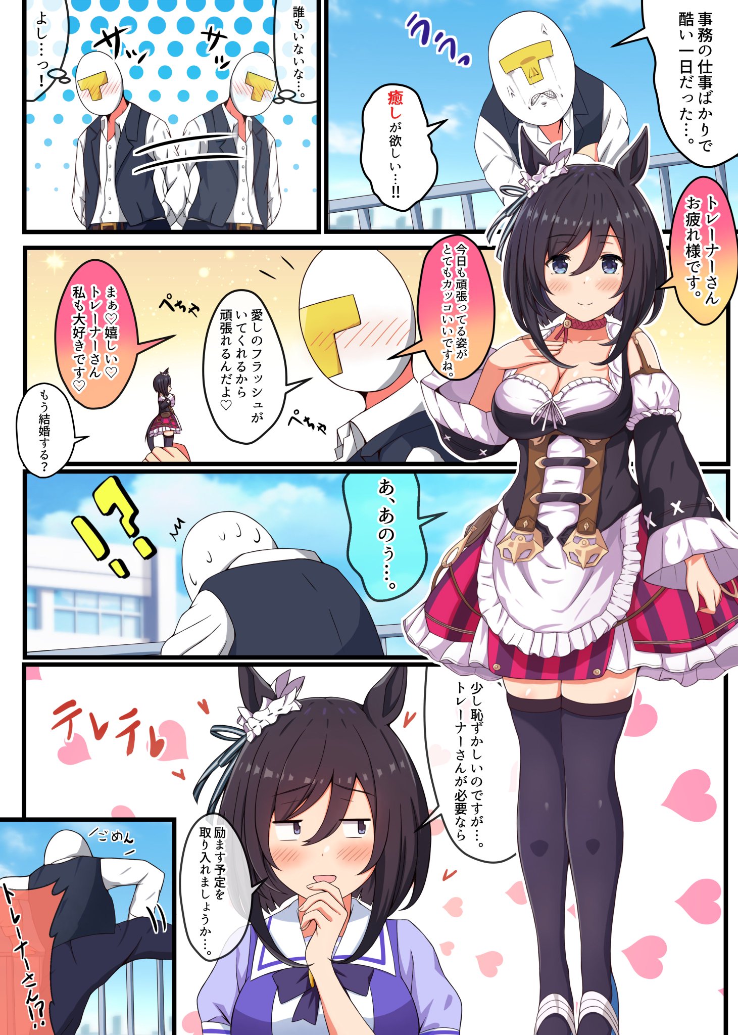 普段はクールで冷静かつ熱く指導をするマスターが自分のぱかプチにキスしようとするも顔を赤らめながら「…やはり無理だ///」と元あった場所に置くところを見て胸が高鳴り、下腹部が熱くなり、体温が高くなり、呼吸が荒くなるというバグが起きてアイネスフウジンから教えられた「ぶち犯す」というデータを思い出すミホノブルボン