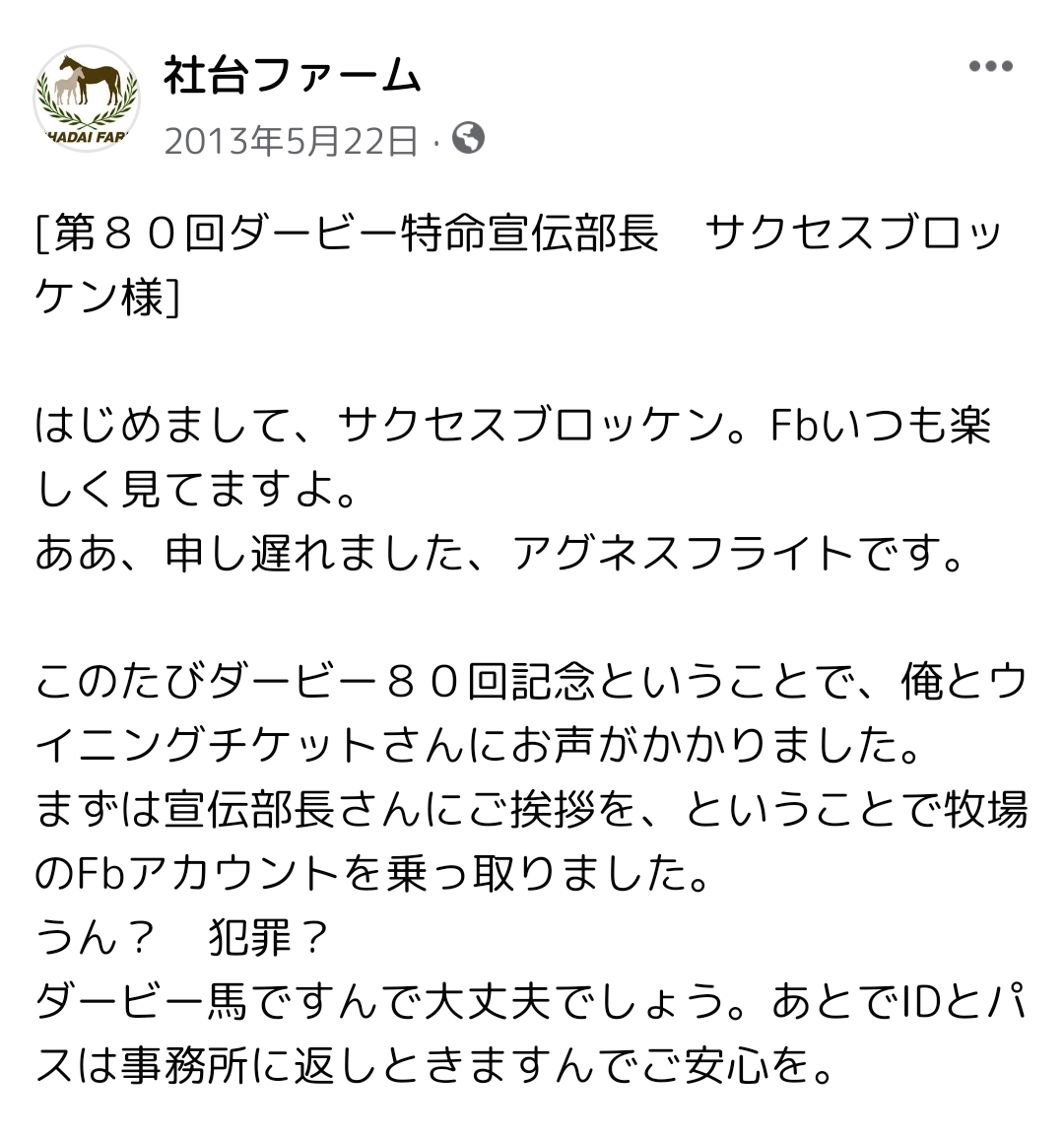 2000年日本ダービー勝利バ「あの・・・」