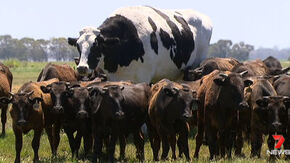 オーストラリアのホルスタイン(厳密には肉牛ではないのだが)で食肉加工場に出荷しようとするもデカすぎて断られたため(機械に乗らない)ため命拾いしたニッカーズという名前の牛さん。体高194センチと大体マイケルジョーダンと同じぐらいだそうで、記録上は2番目に大きい牛らしい。(ギネス記録は220センチらしいが写真が見つからなんだ)
