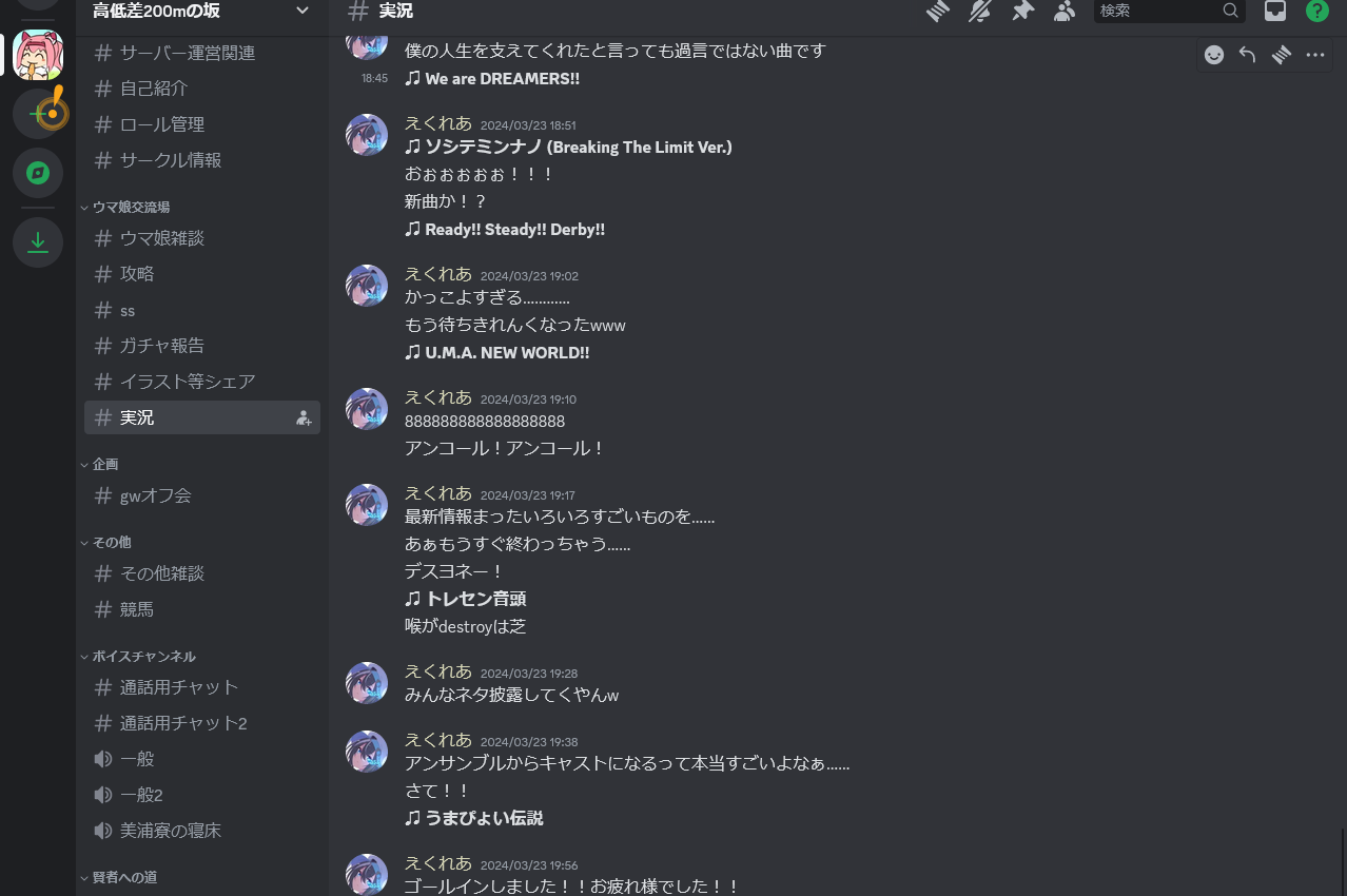 メンバーが何を話したいかによりますが、ゲームやライブ等公式コンテンツの話をするもよし、自他問わずイラストを共有するもよし、二次創作の話をするもよし、競馬の話をするもよし(当然節度は守ってください)
