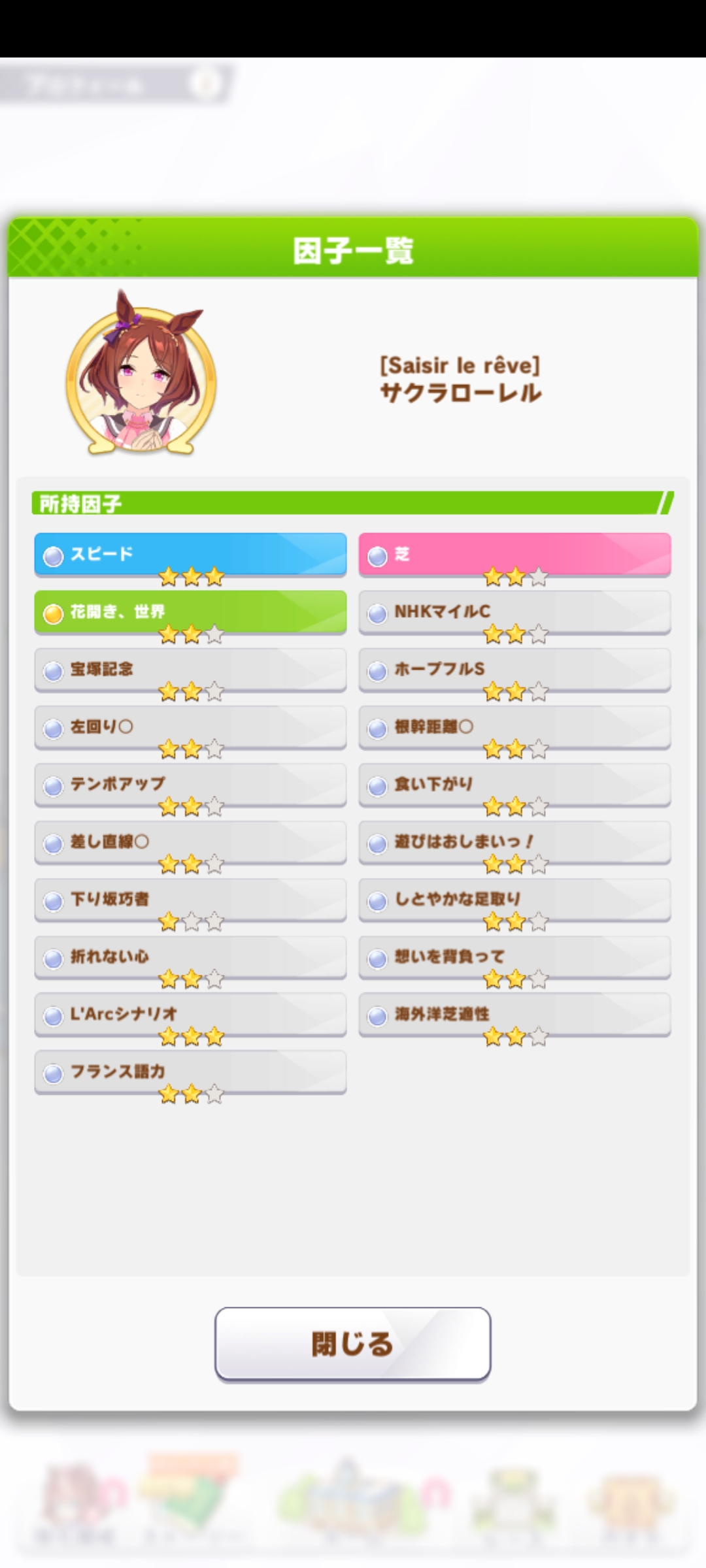 ラークシナリオの海外適正の因子って星3だとどのくらいステータスあがるの?レースの真髄とかアオハル根性とかのスキルも欲しいからどのシナリオでやるか悩む