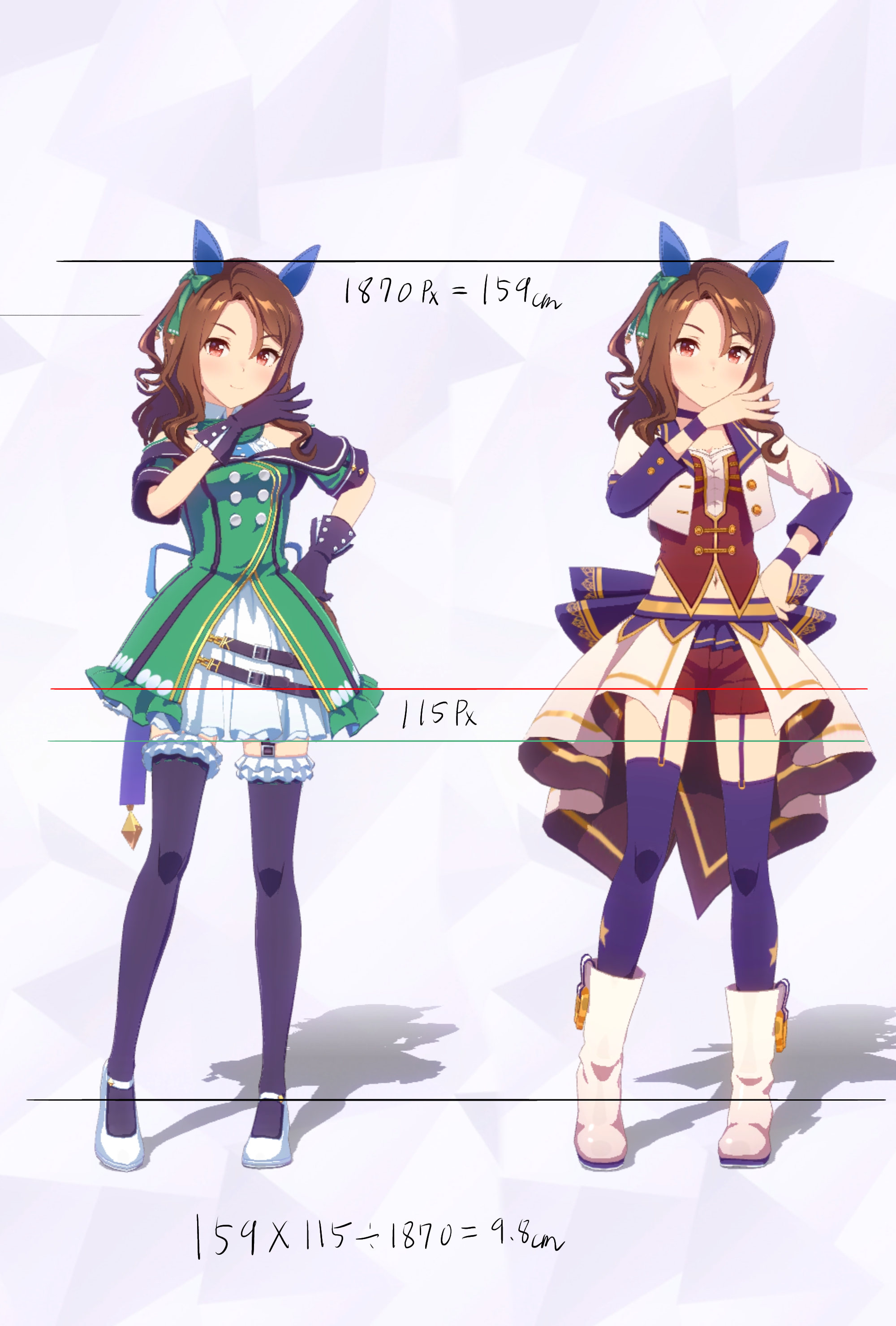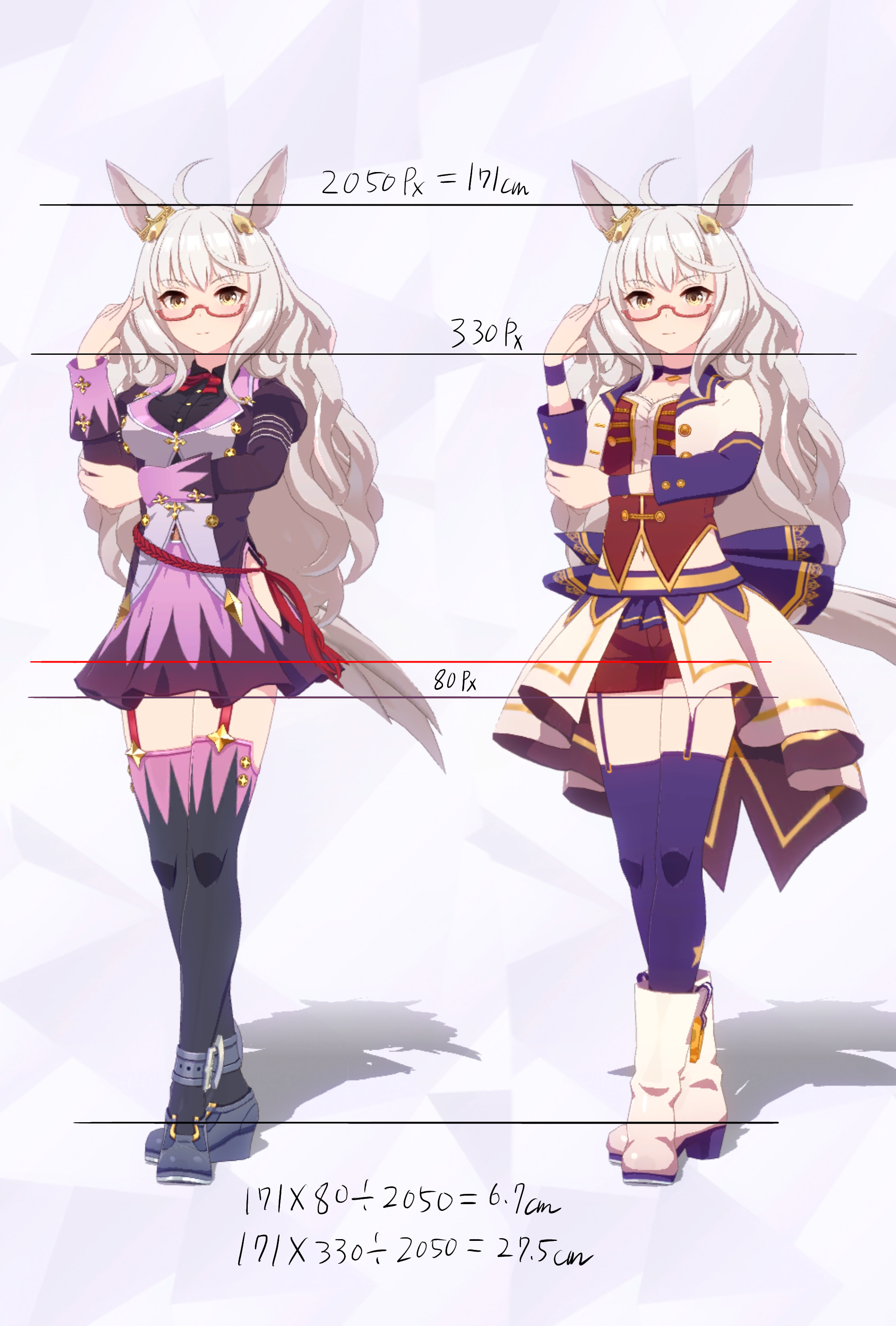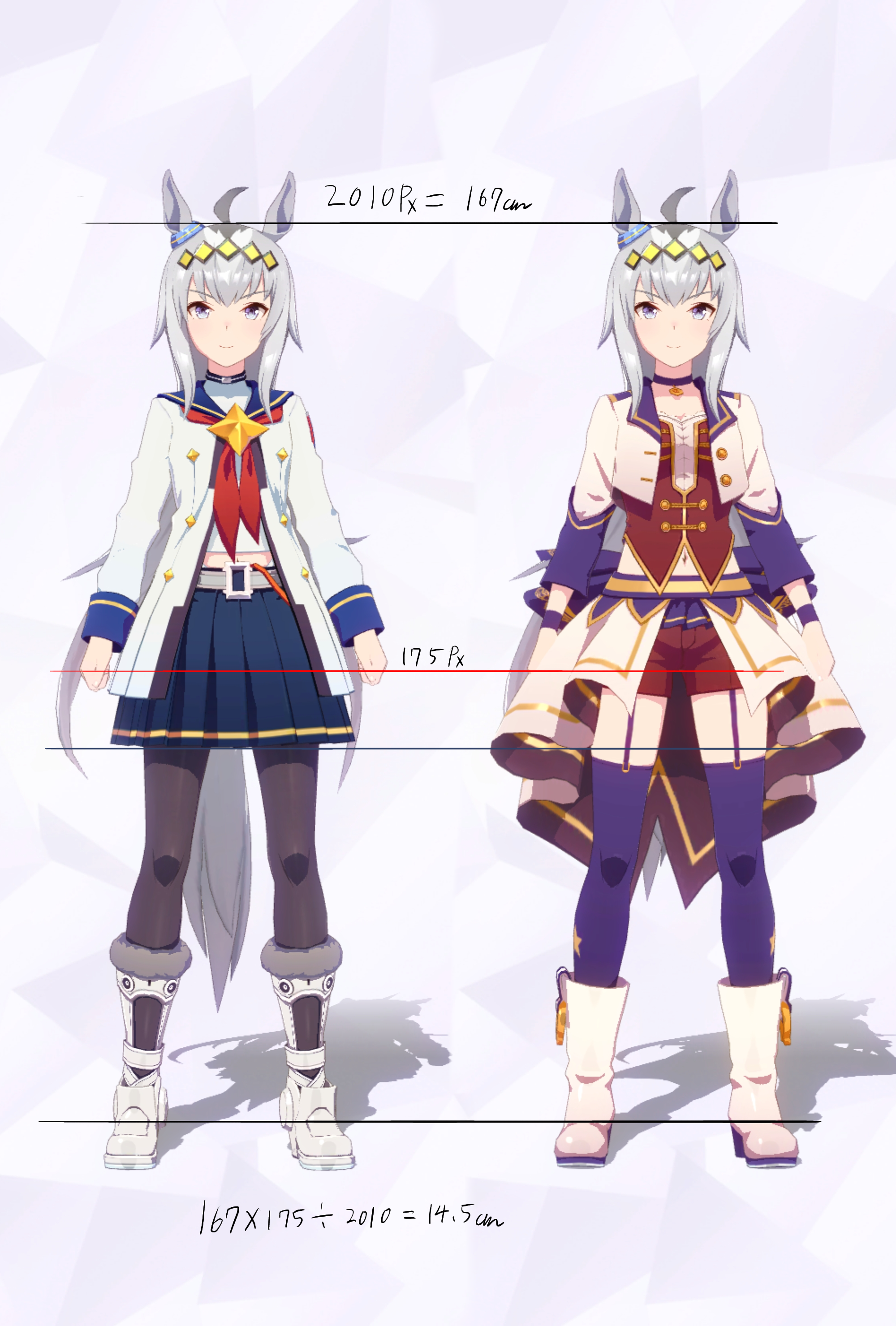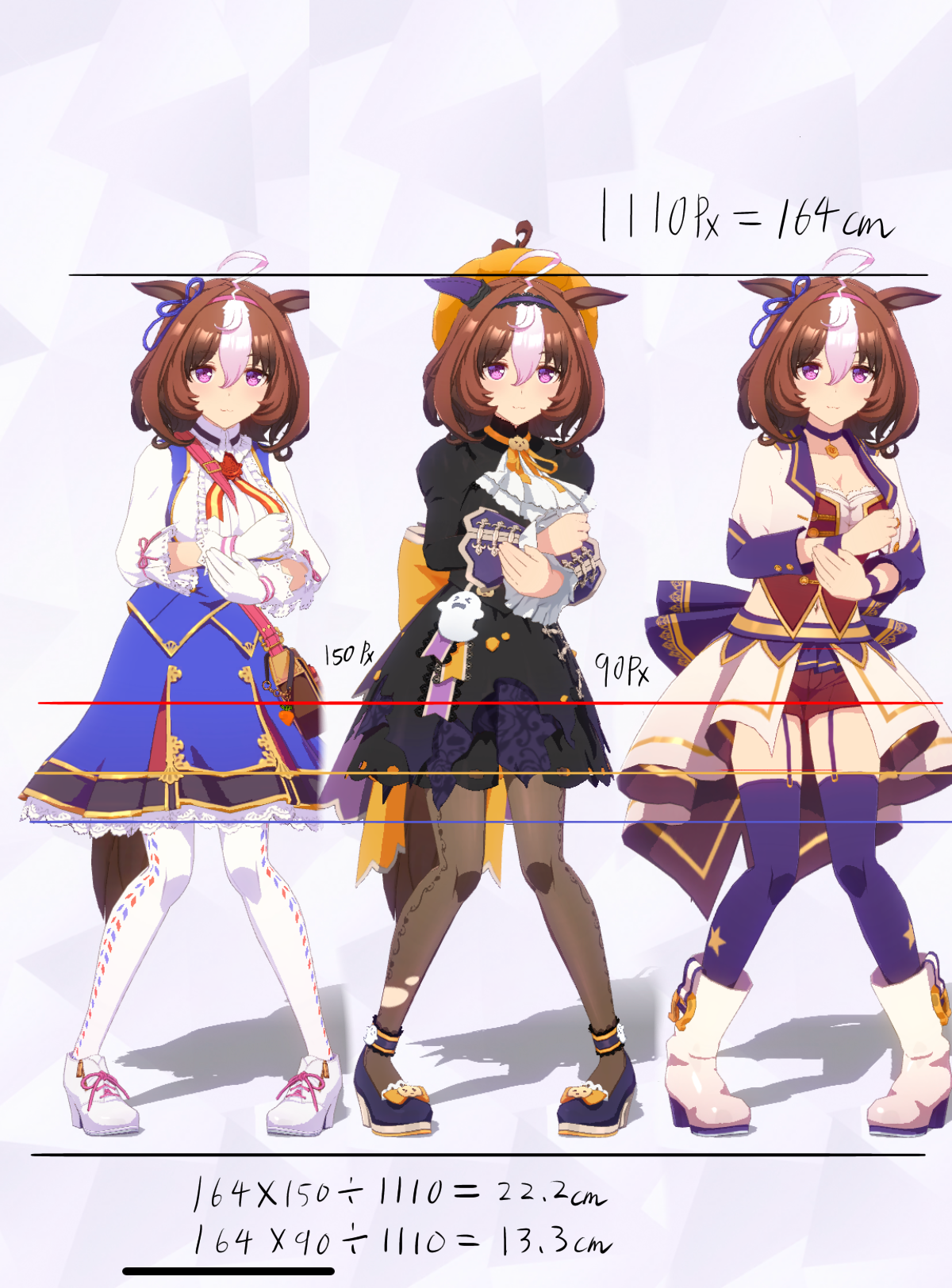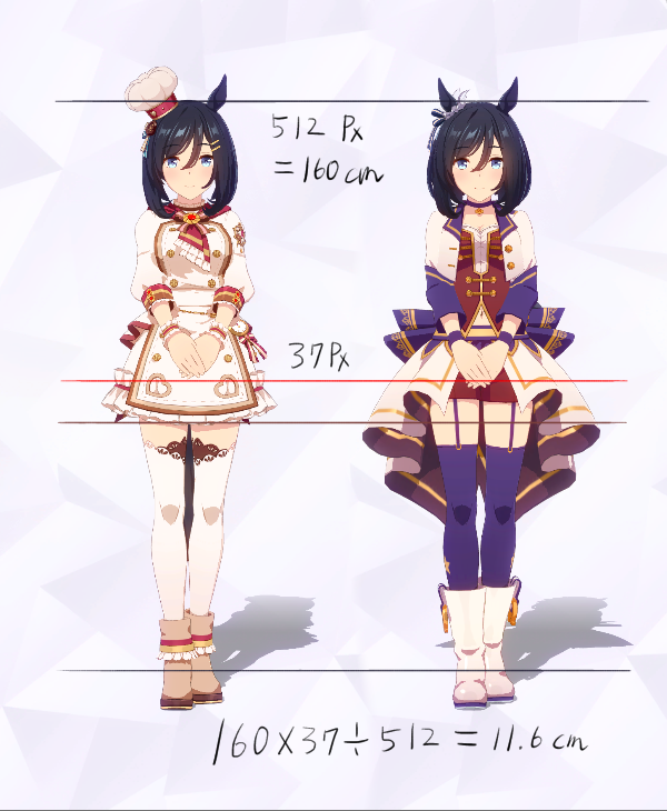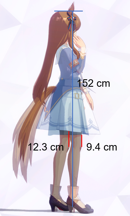 3Dモデルを元にした計測であり、更にはヒールや帽子の影響で身長の測定に誤差が生じやすいため、各値は参考値である事をご了承願います。