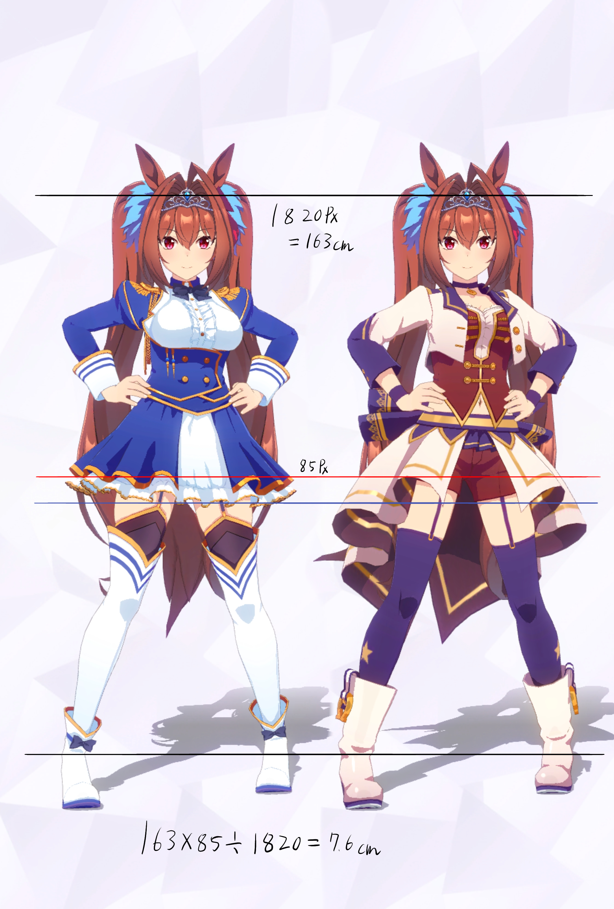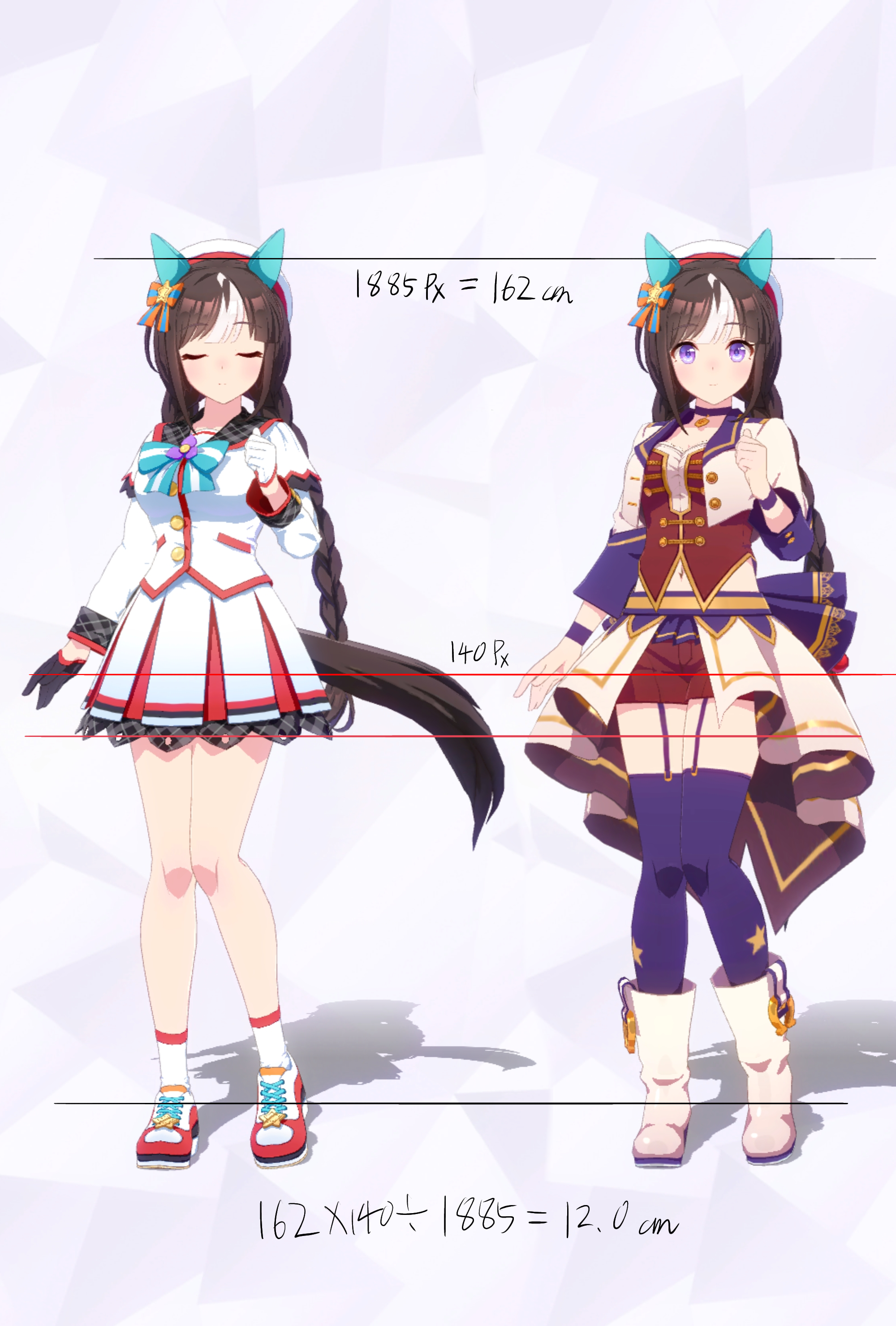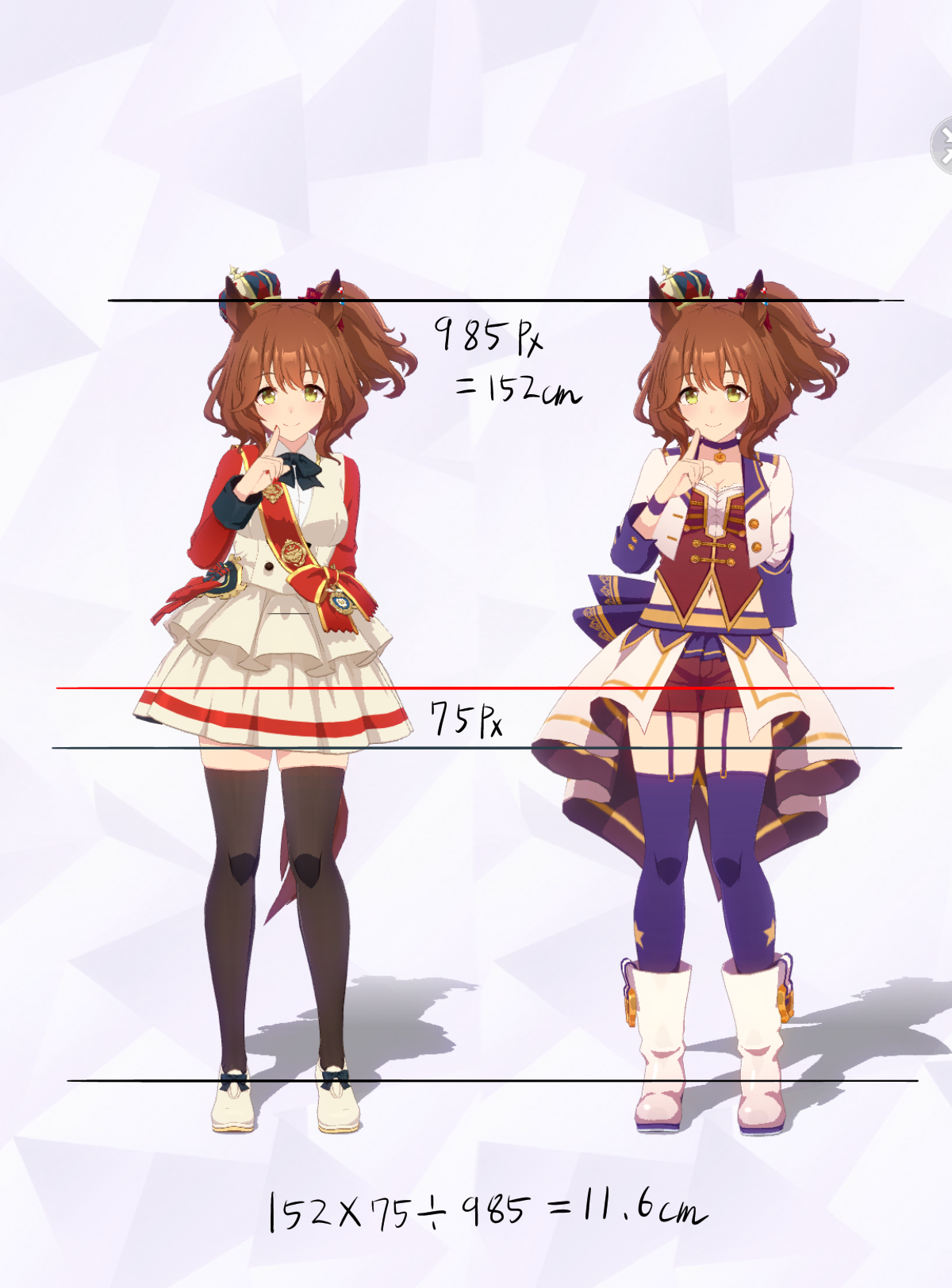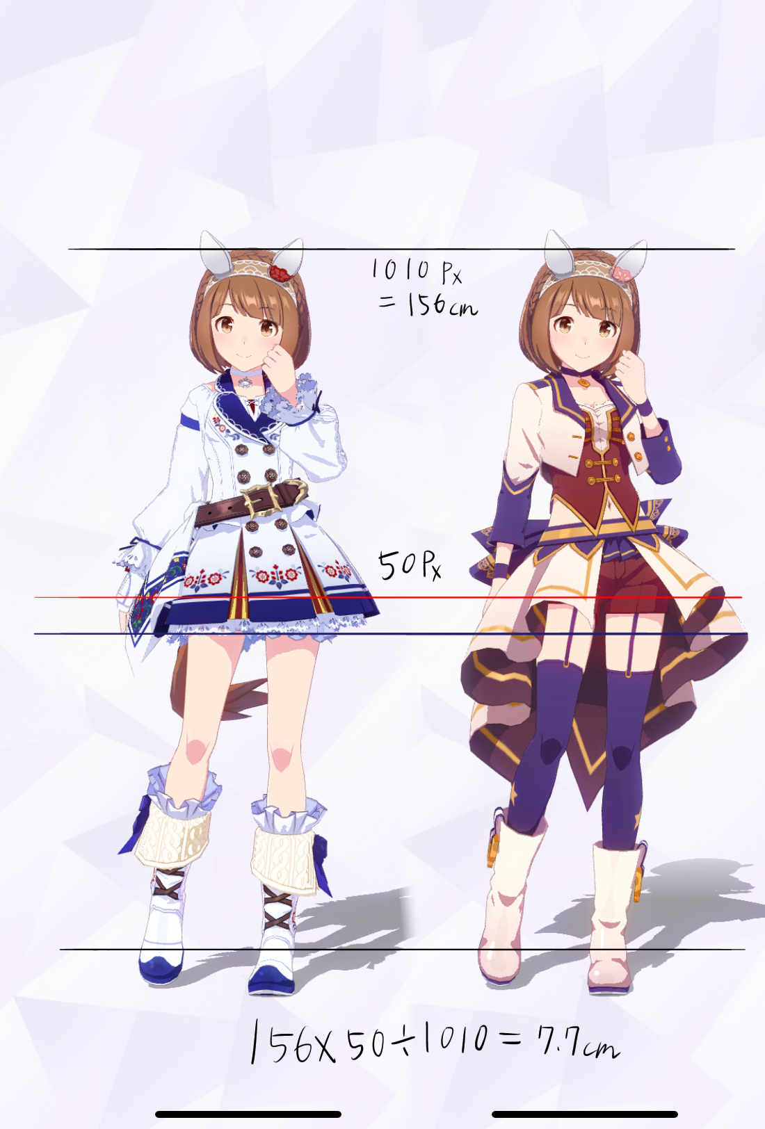 3Dモデルを元にした計測であり、更にはヒールや帽子の影響で身長の測定に誤差が生じやすいため、各値は参考値である事をご了承願います。