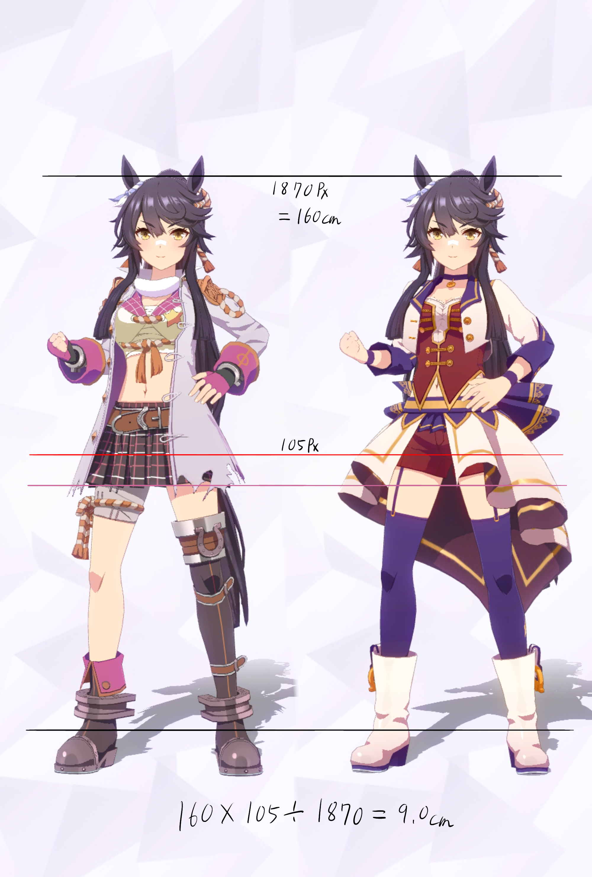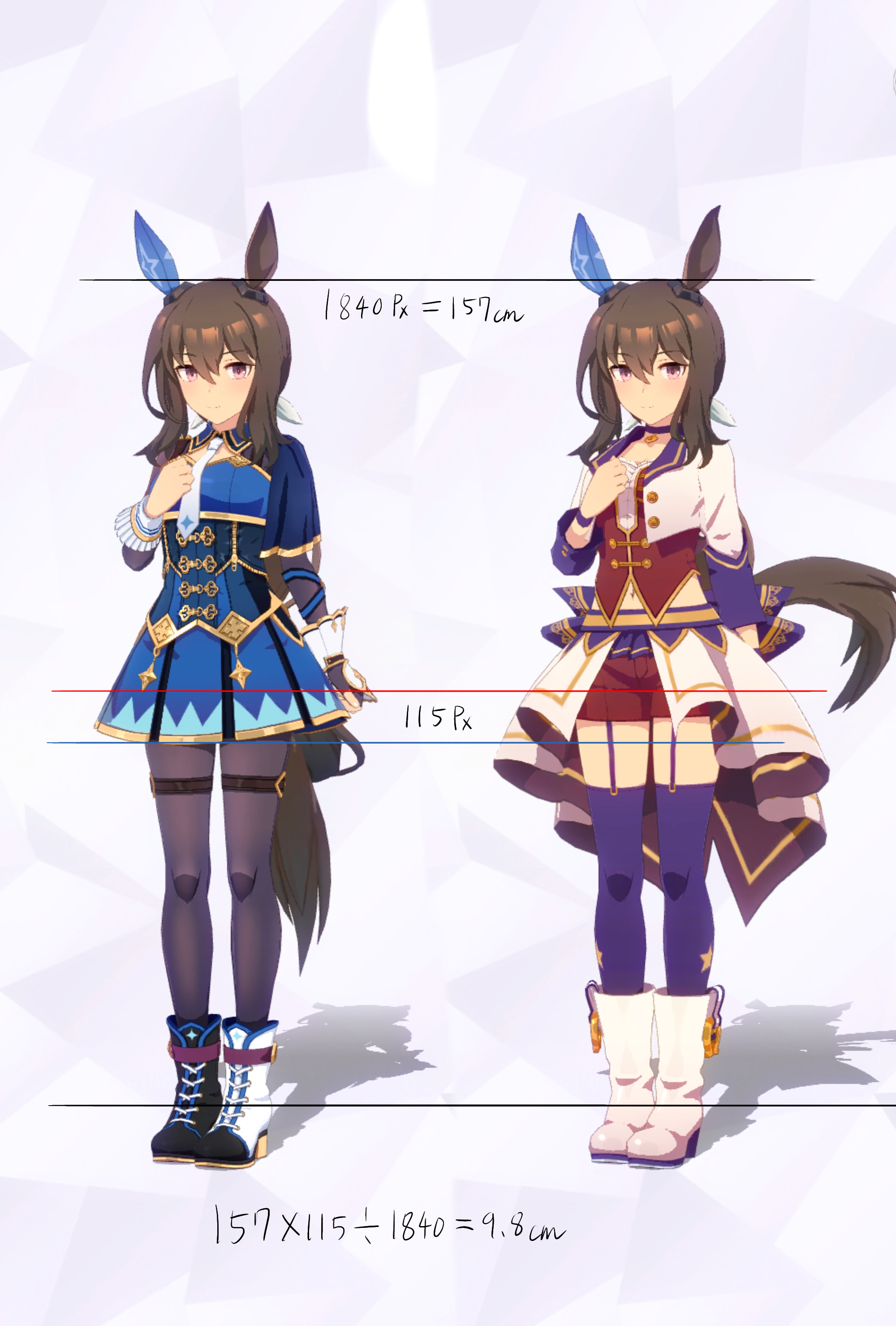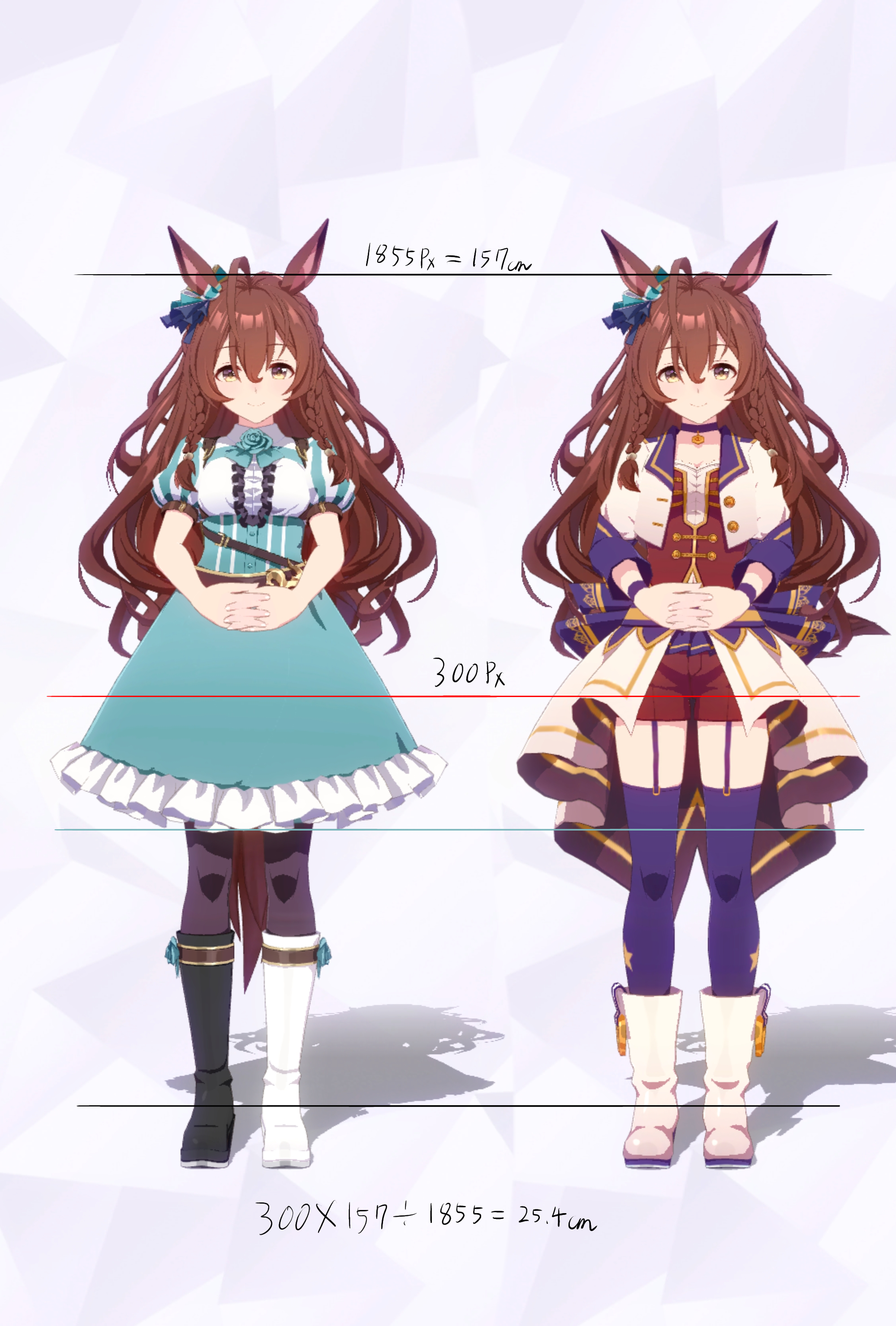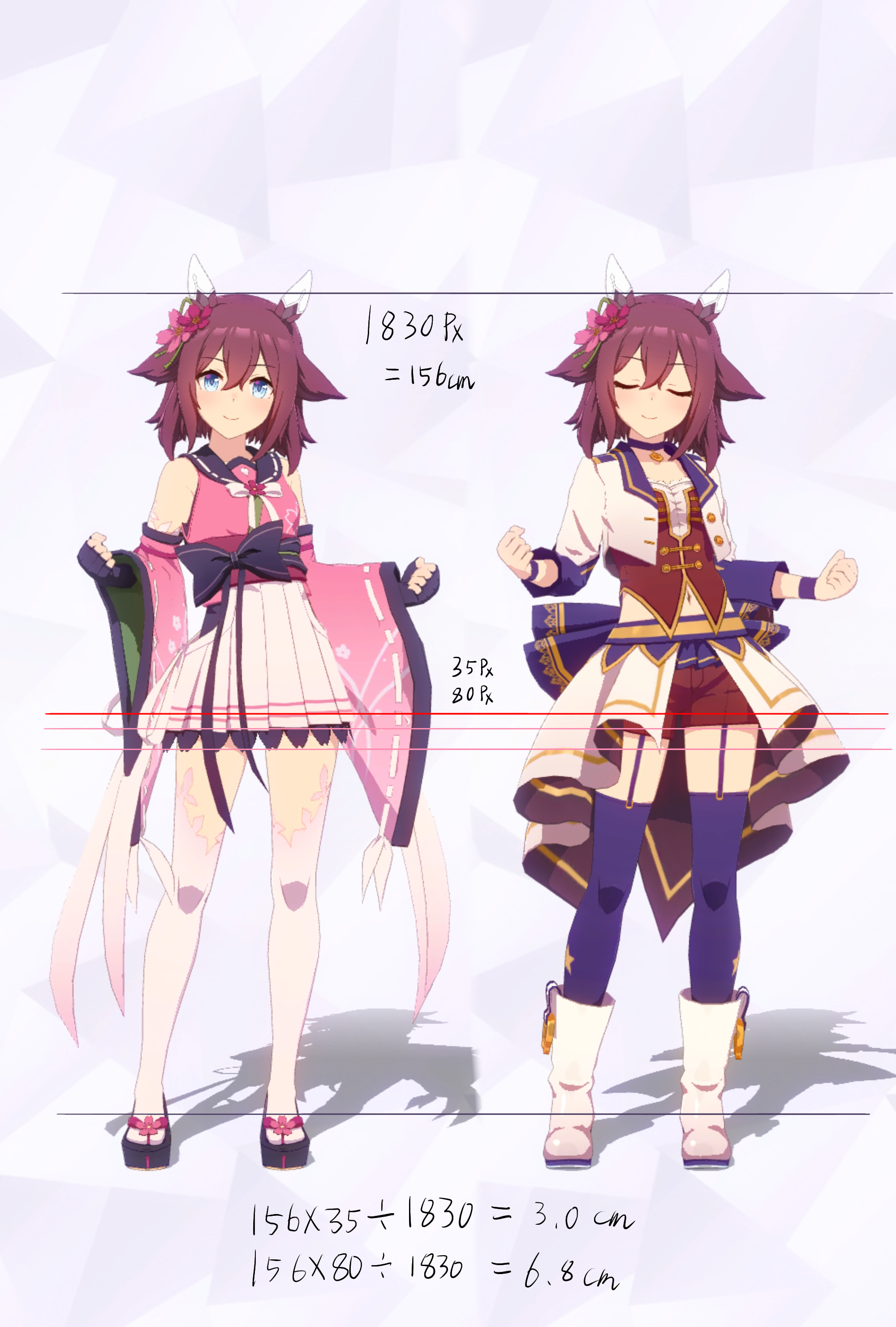 3Dモデルを元にした計測であり、更にはヒールや帽子の影響で身長の測定に誤差が生じやすいため、各値は参考値である事をご了承願います。