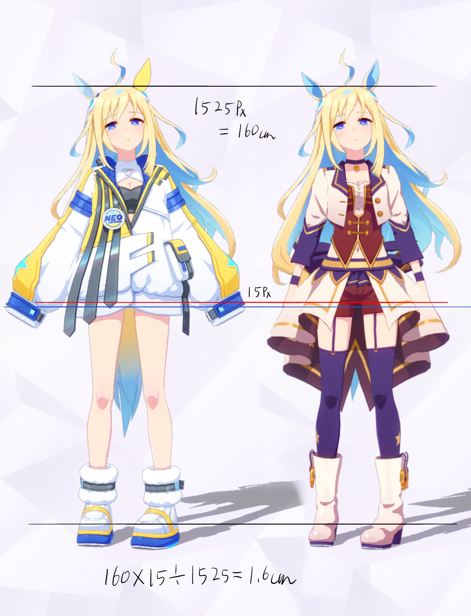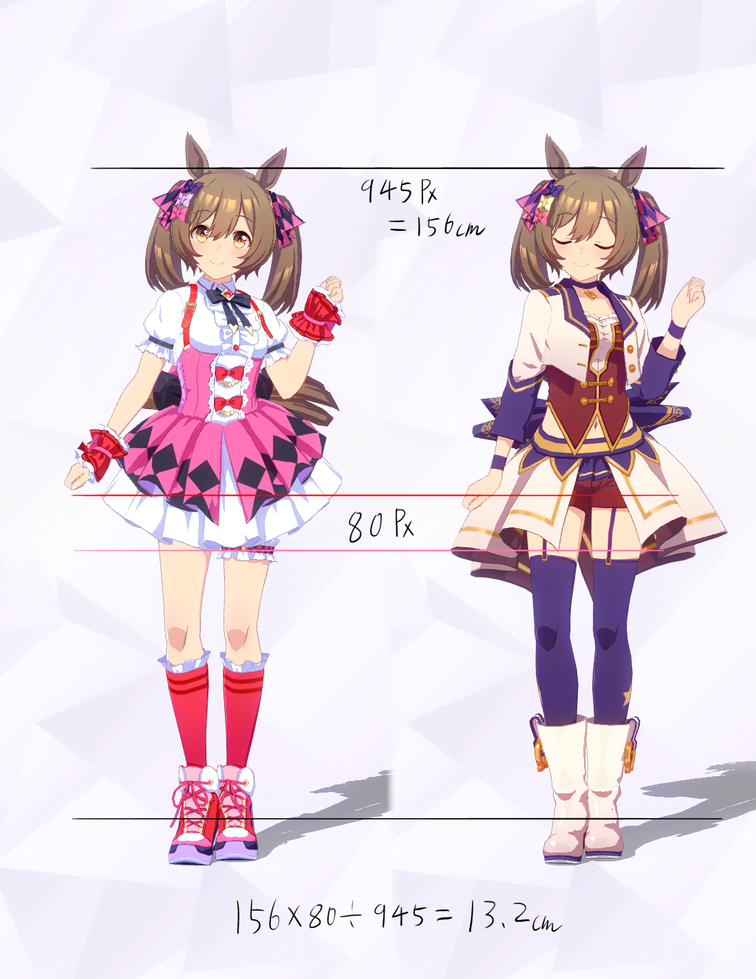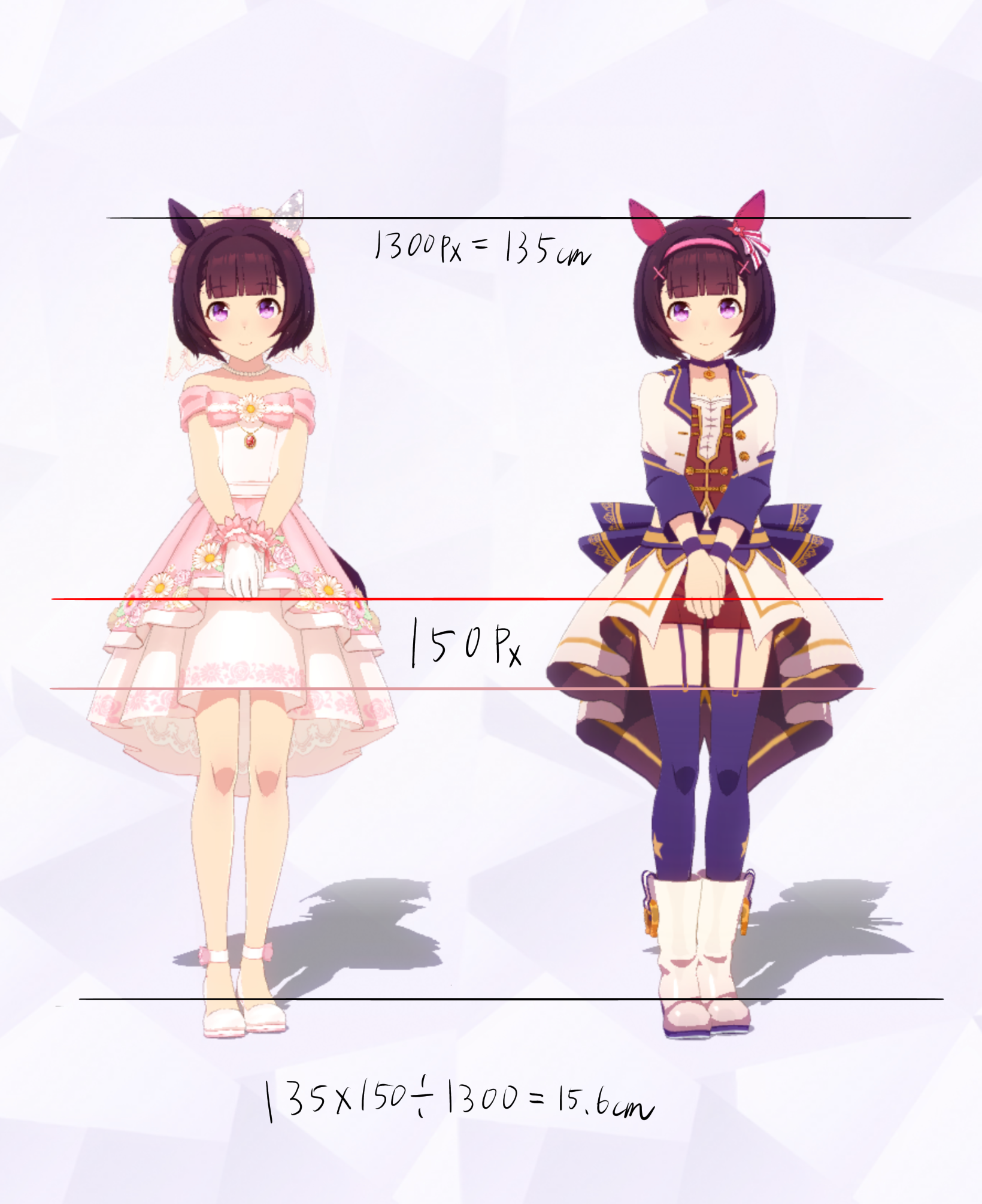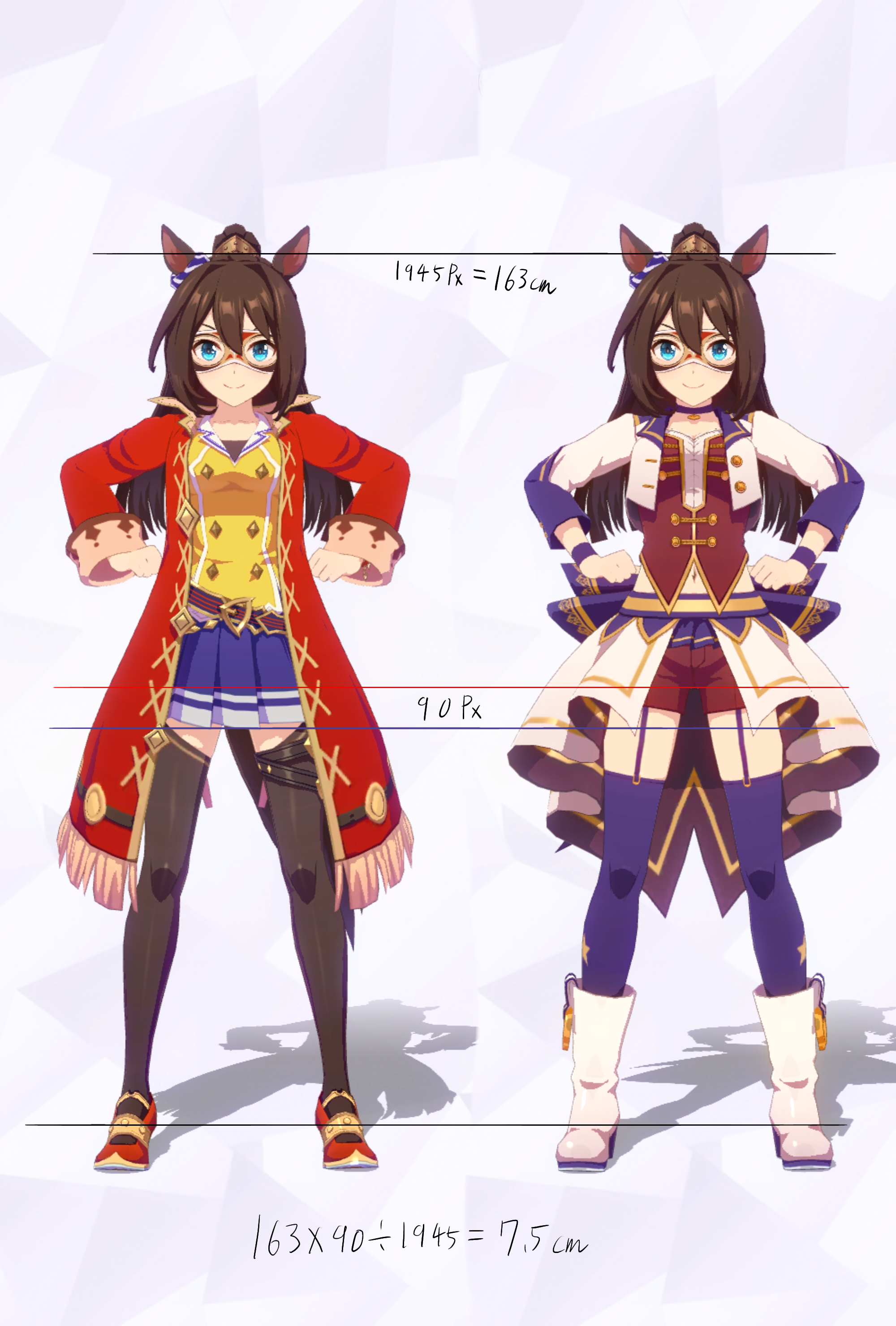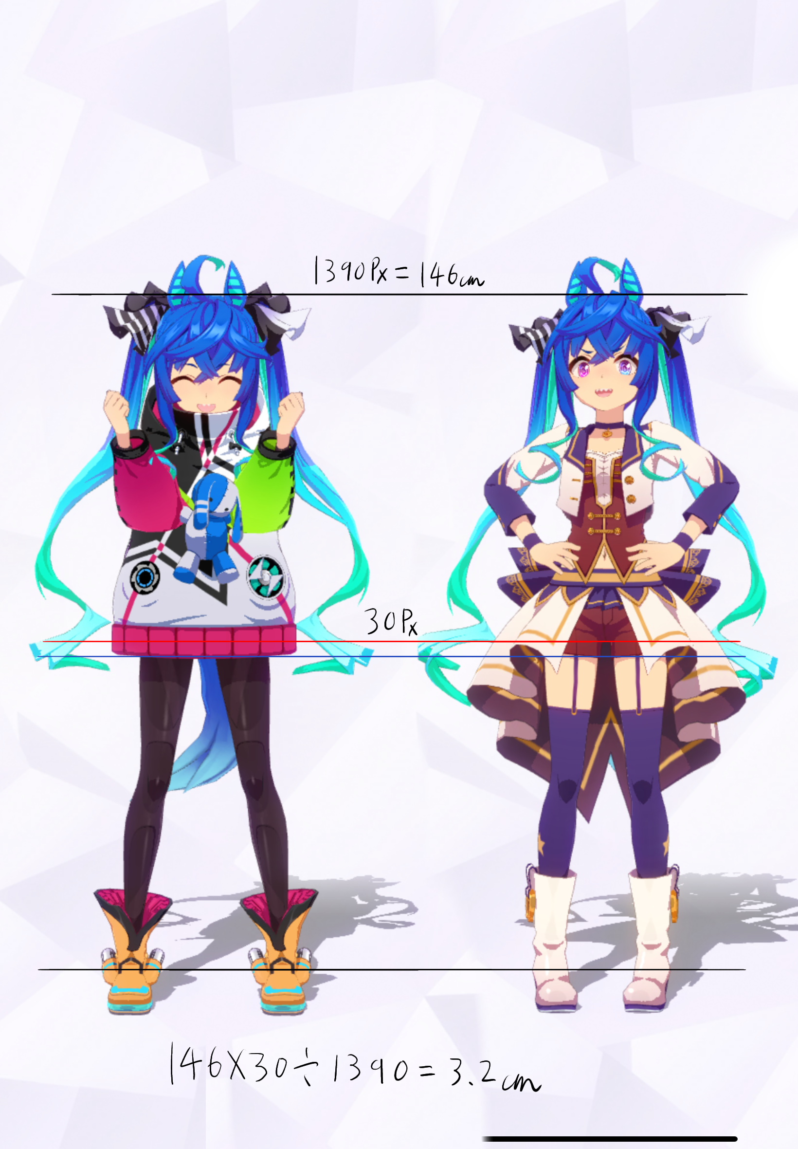 3Dモデルを元にした計測であり、更にはヒールや帽子の影響で身長の測定に誤差が生じやすいため、各値は参考値である事をご了承願います。