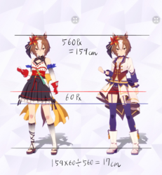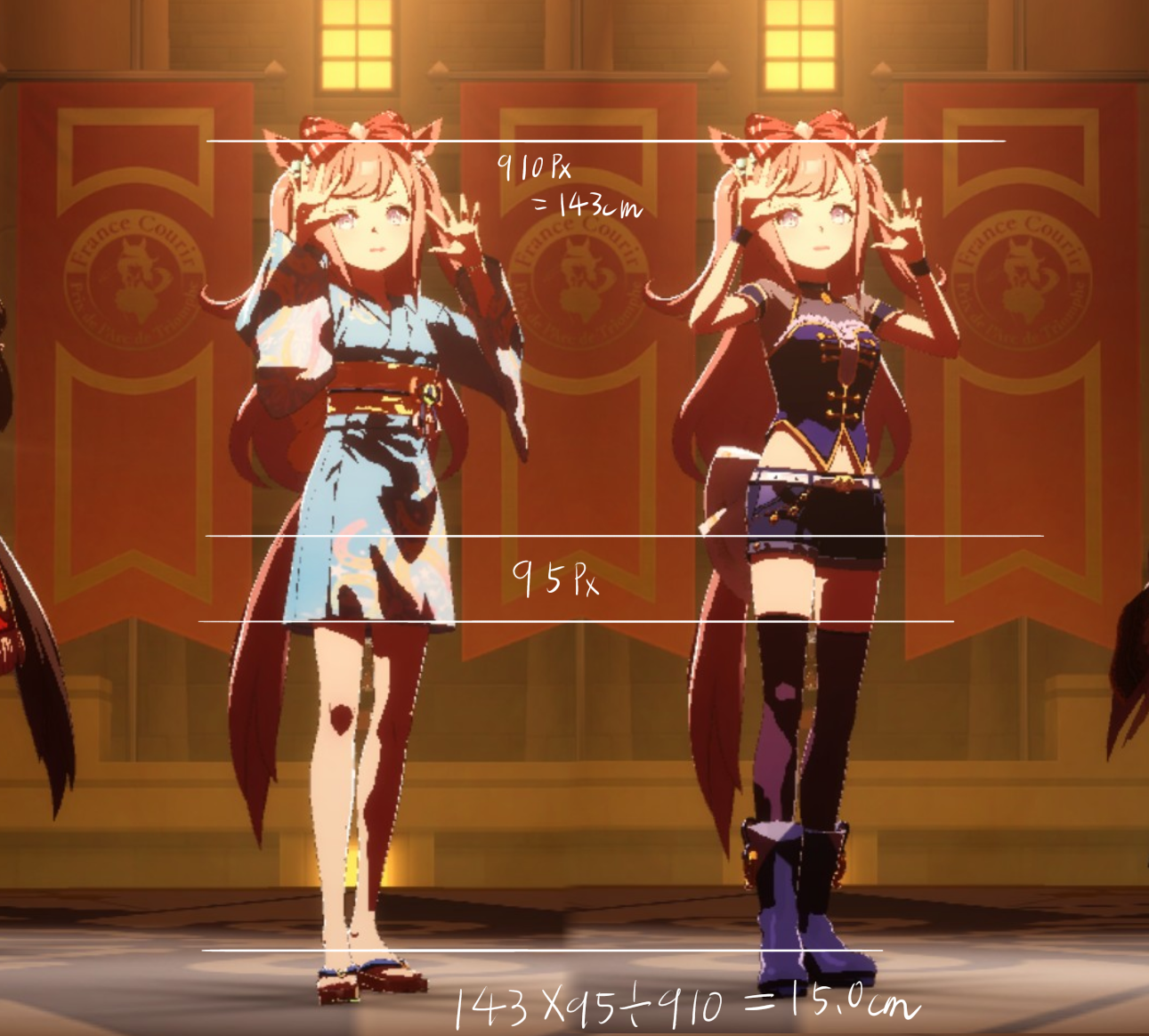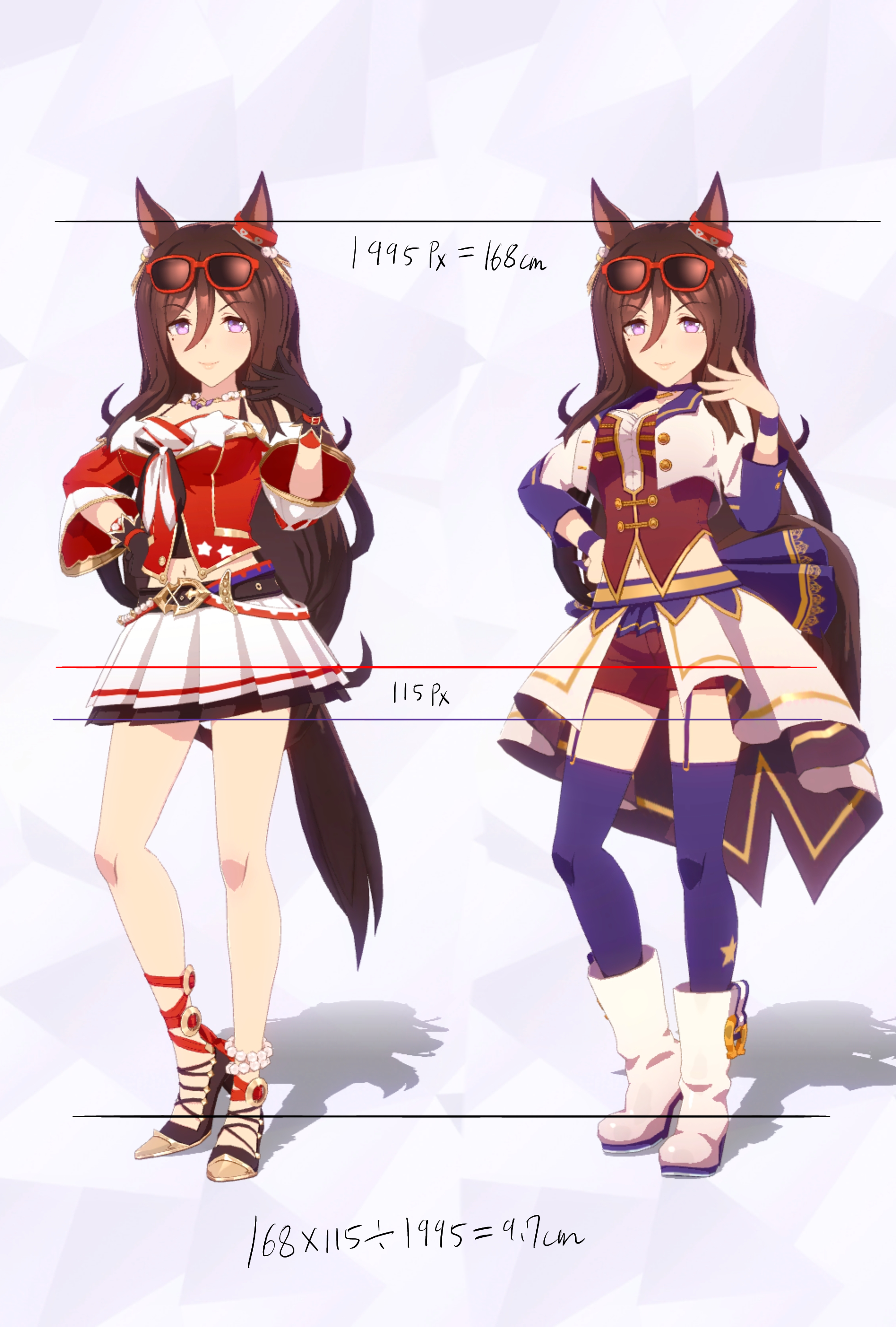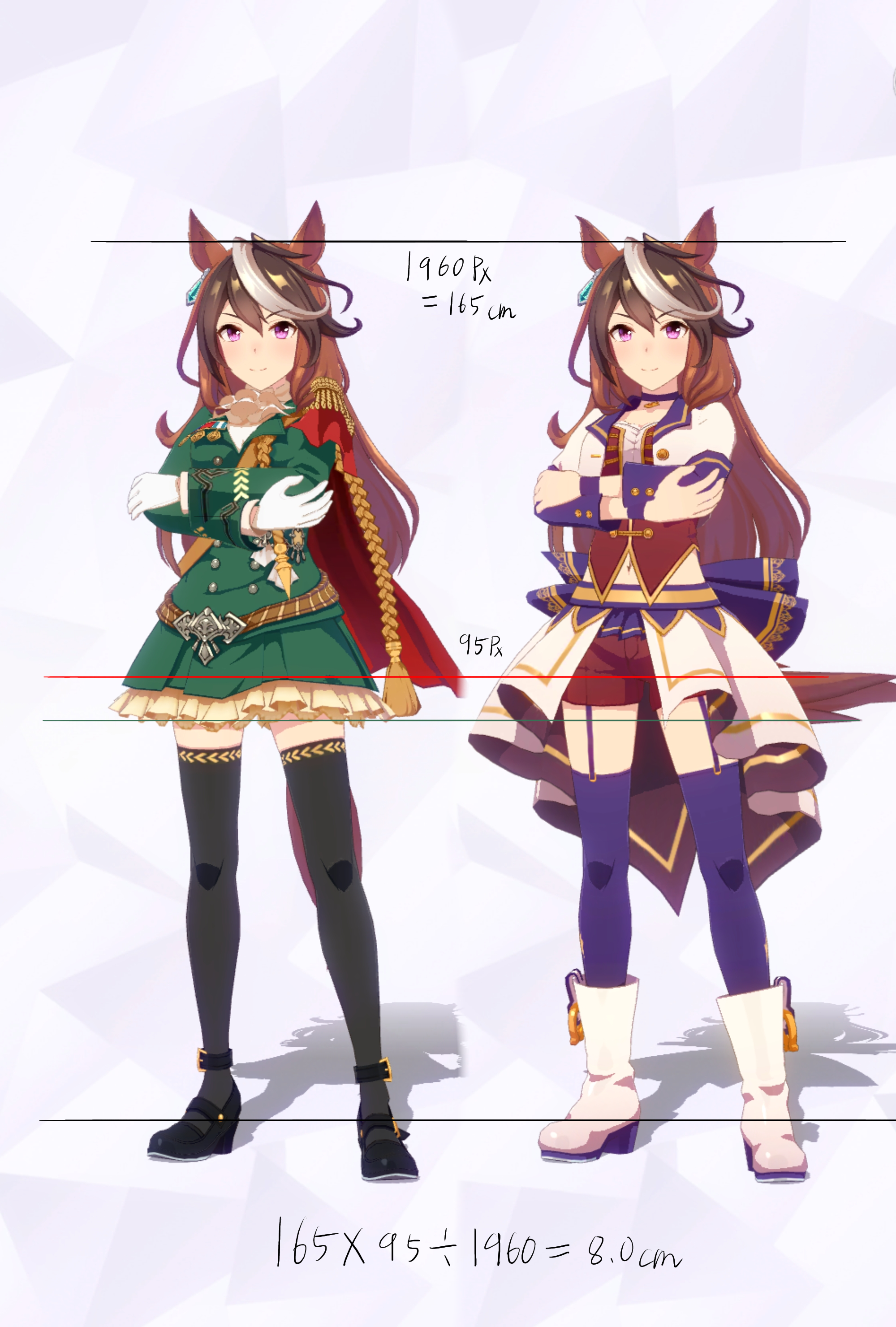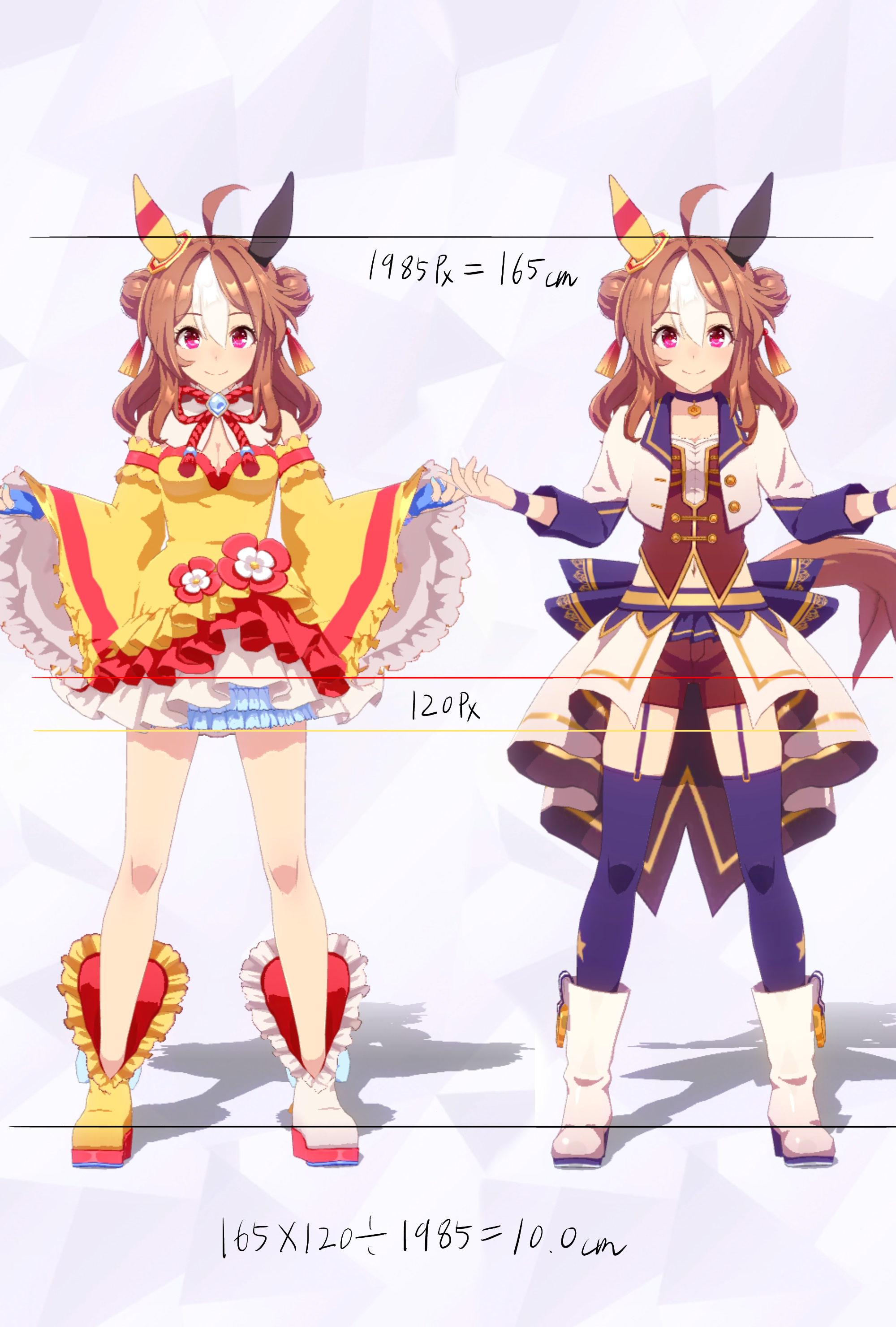 3Dモデルを元にした計測であり、更にはヒールや帽子の影響で身長の測定に誤差が生じやすいため、各値は参考値である事をご了承願います。