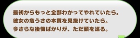 彼女の言語を1周目よりも理解できるよう努めること、書類の不備は無くすようにすること、そしてやはり怪我の回避は出来ることなら1周目よりも確実にすることを決めるユニトレ。尚ユニには2周目なことはバレてて選抜レース後に抜け出したタイミングで色々と聞かれる模様。