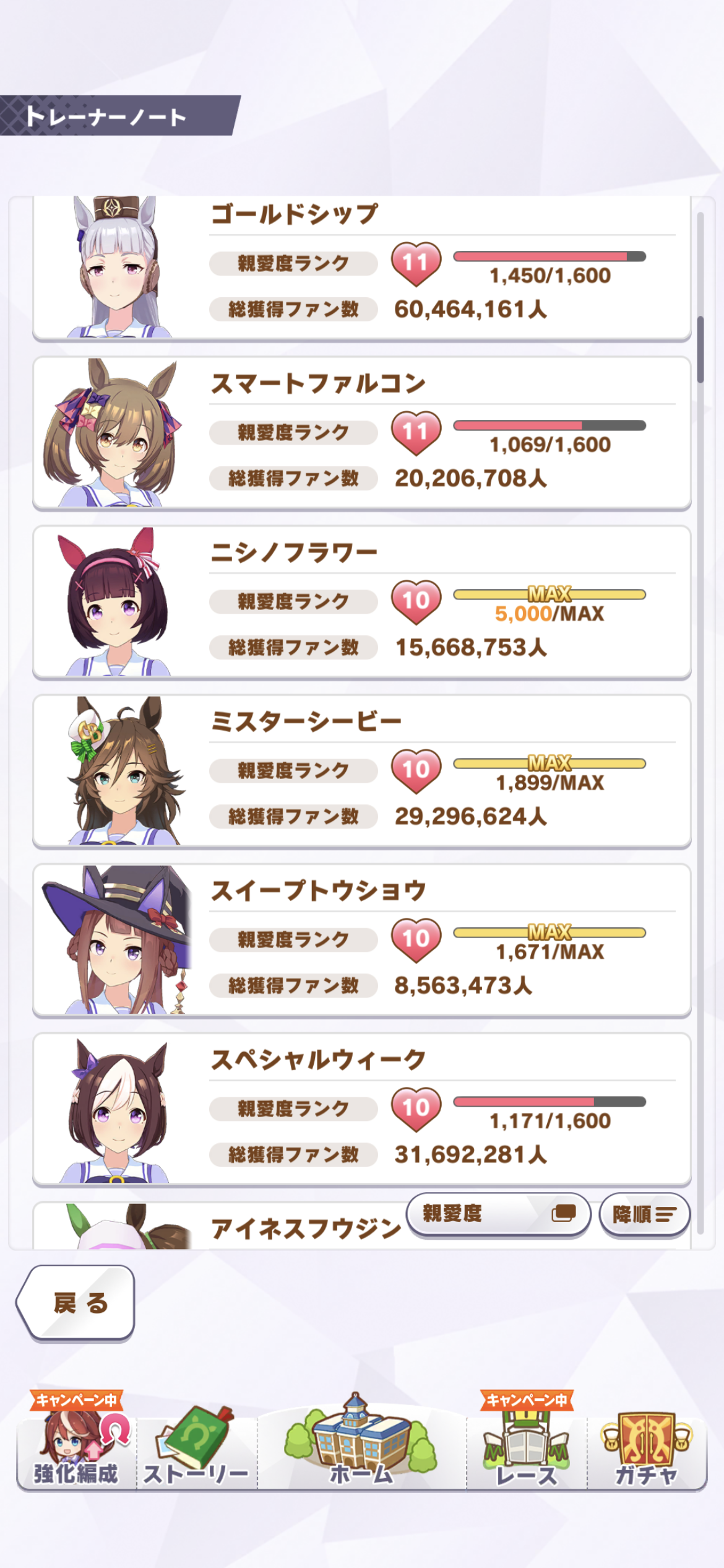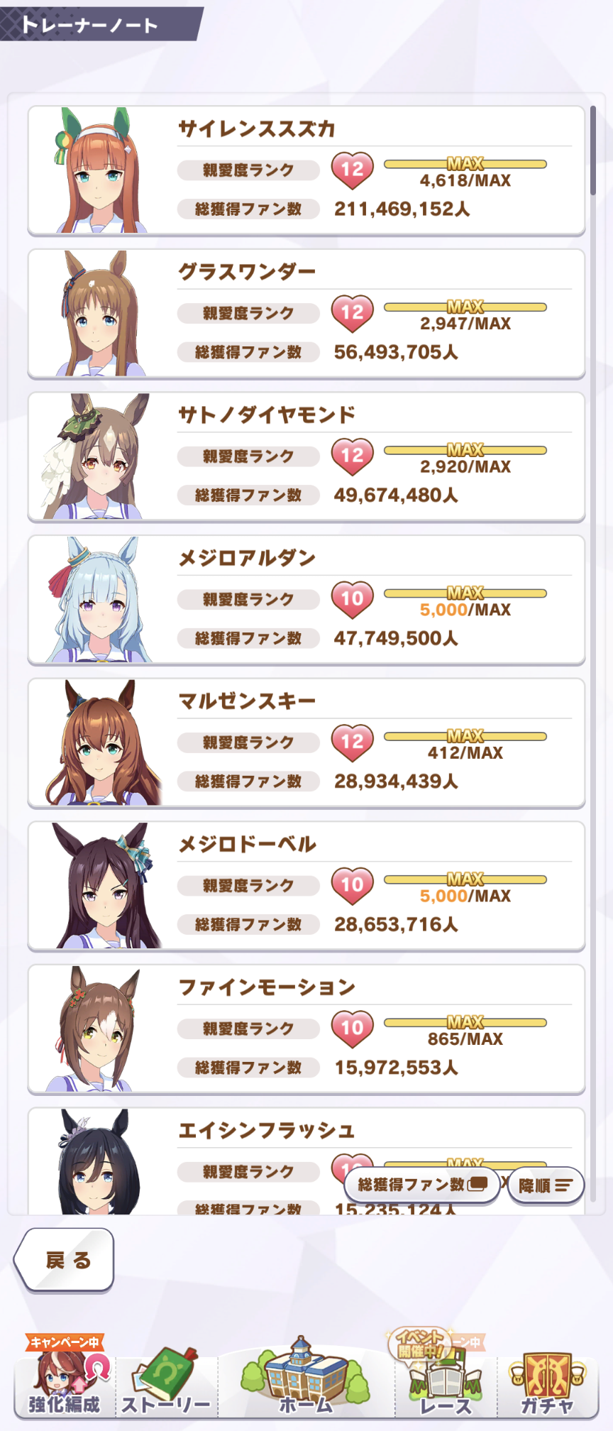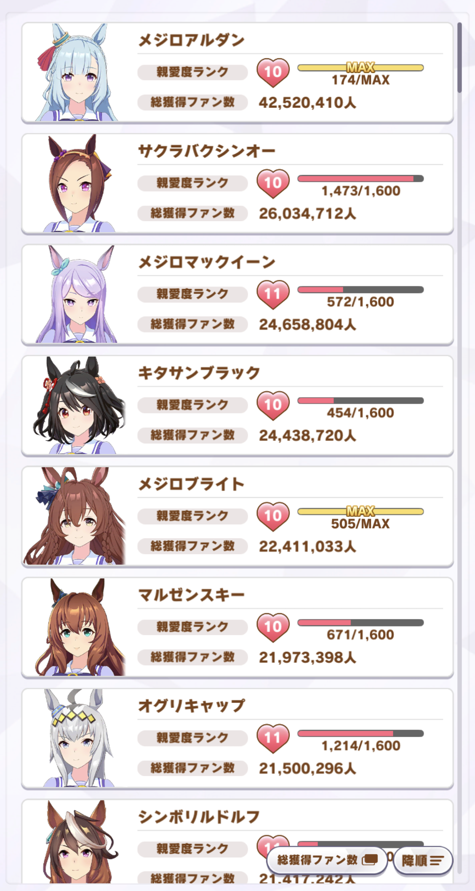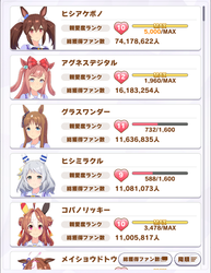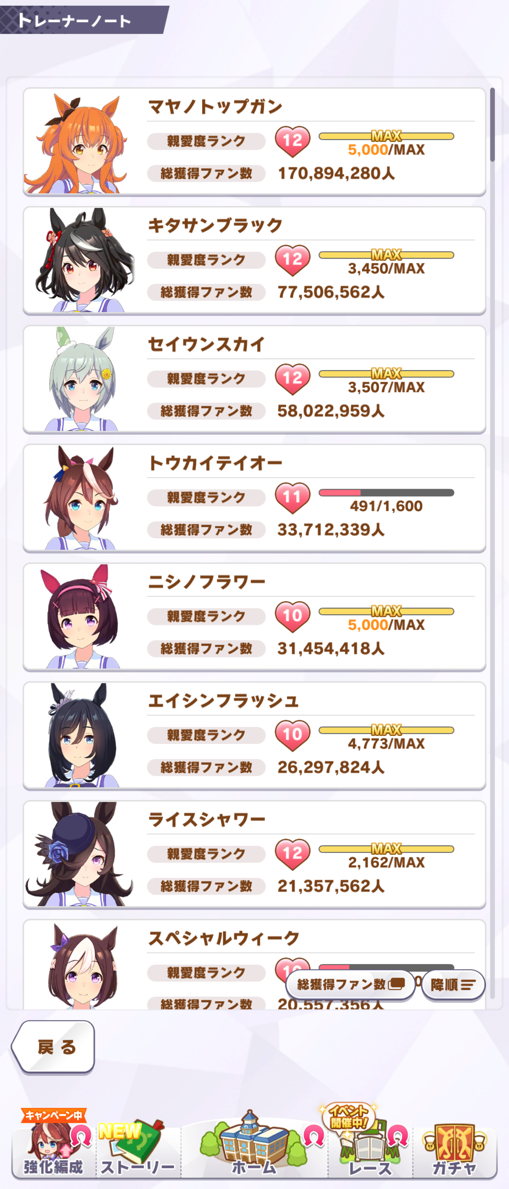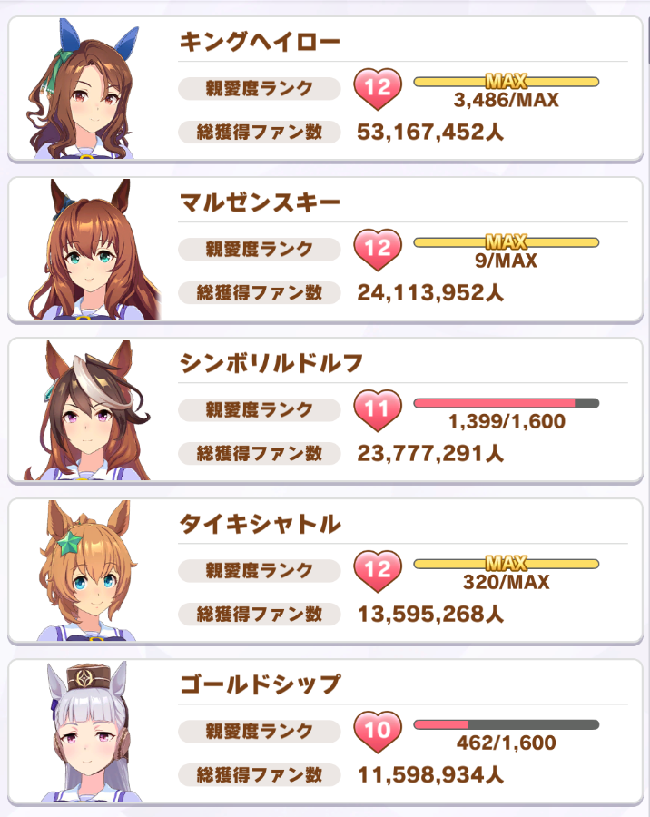 あとファン数と親愛度って比例しないのね(うまさんぽとかでも上がるんだから当たり前ちゃ当たり前だけど…)