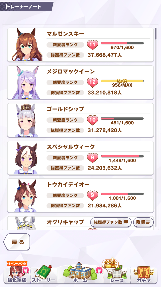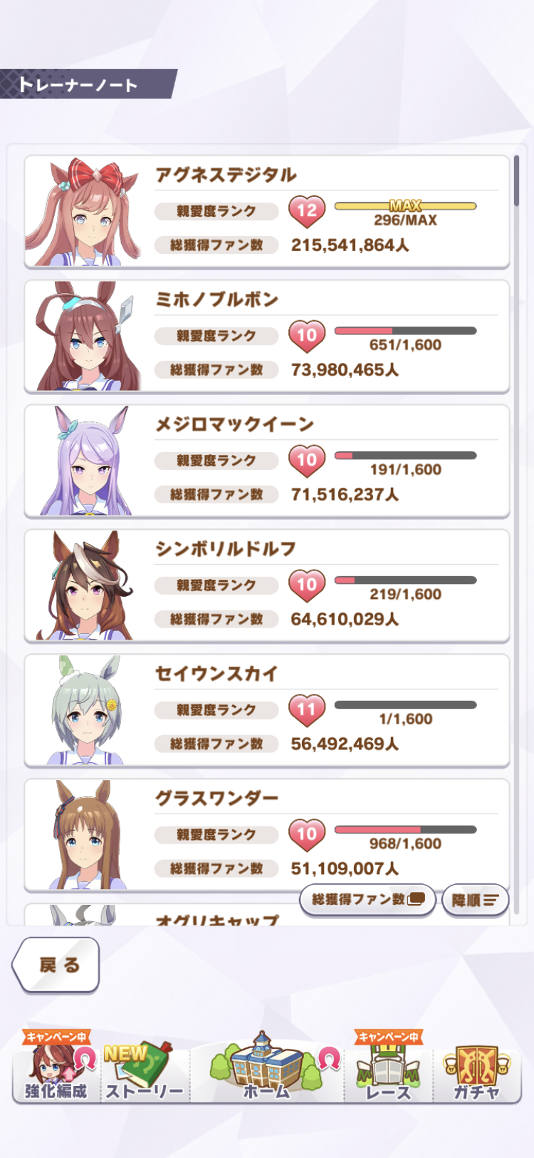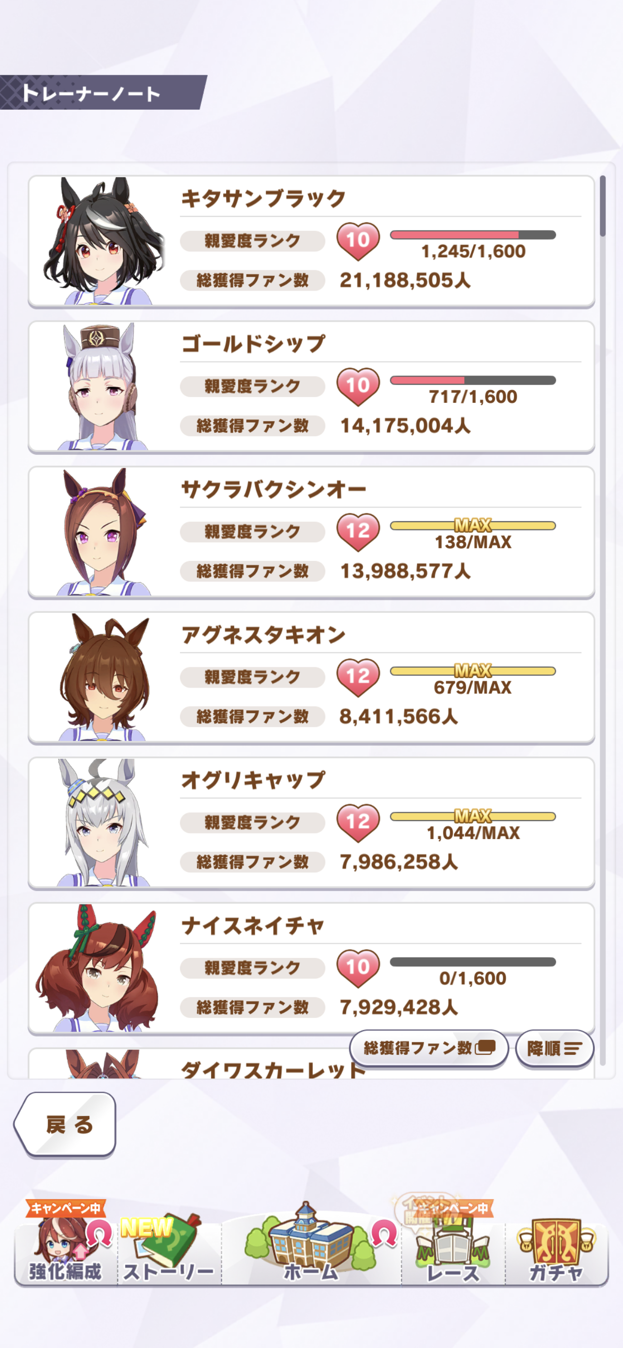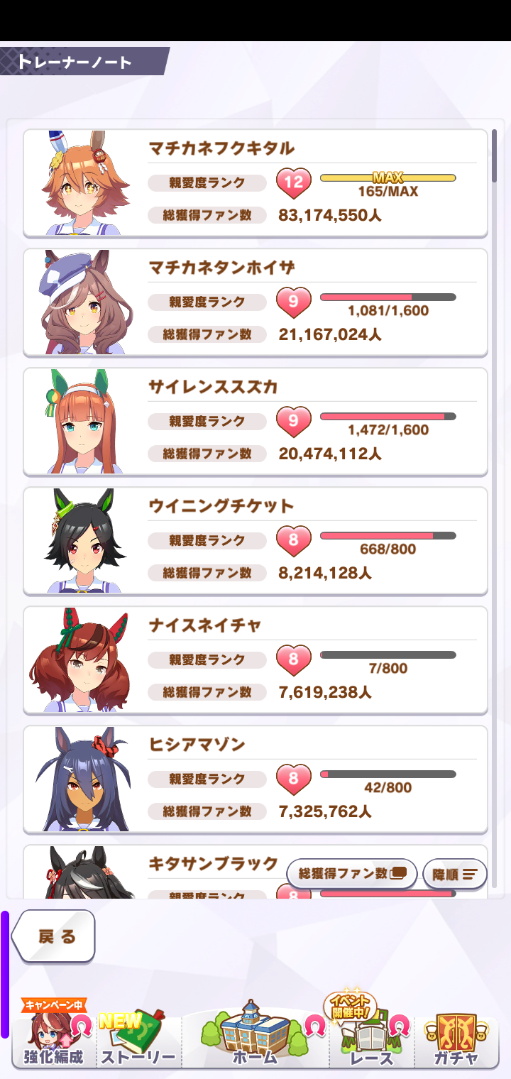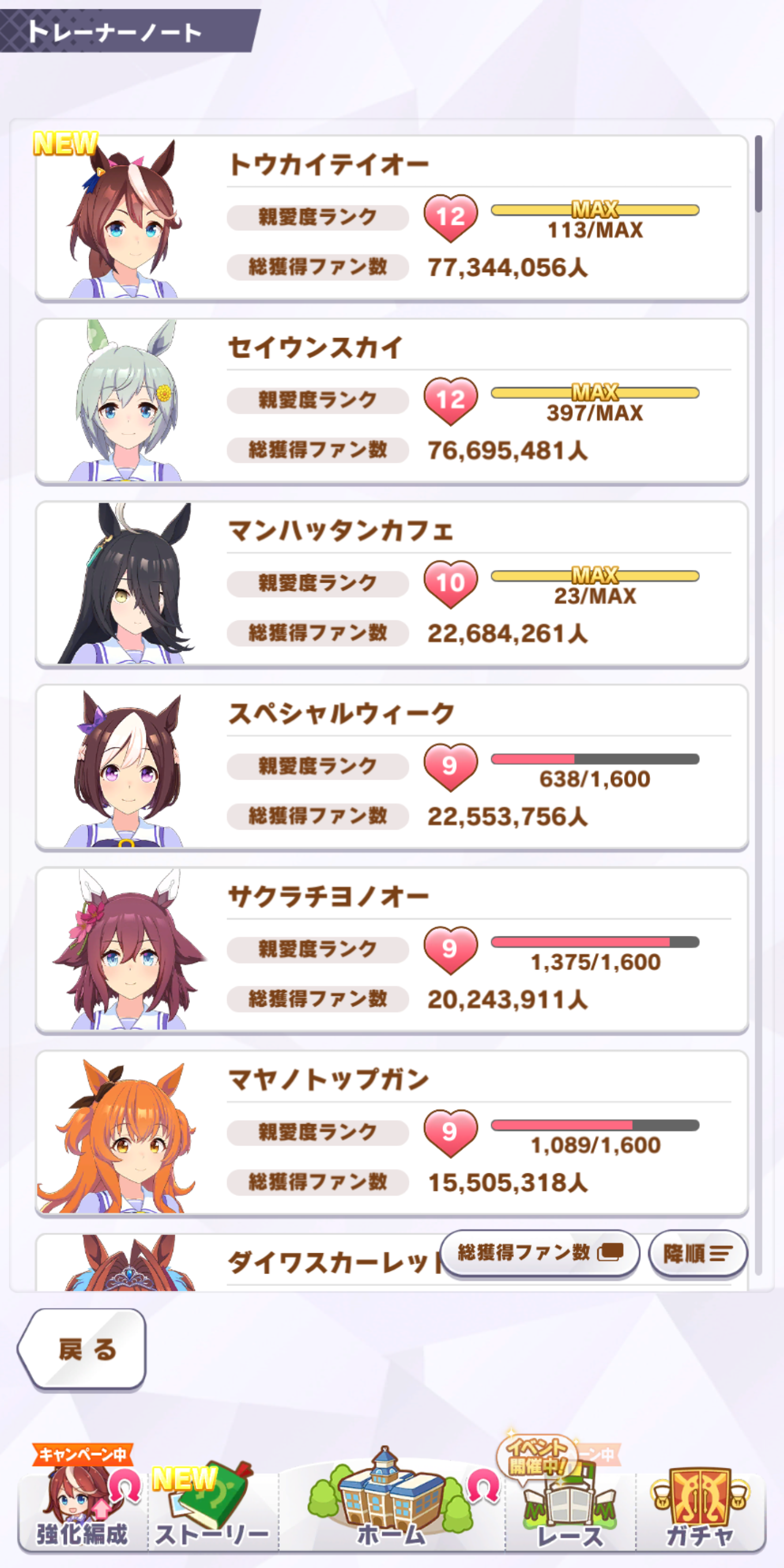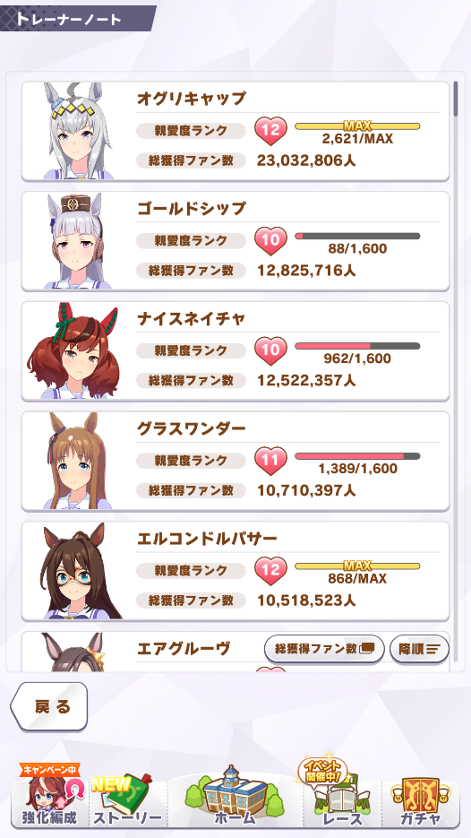 あとファン数と親愛度って比例しないのね(うまさんぽとかでも上がるんだから当たり前ちゃ当たり前だけど…)