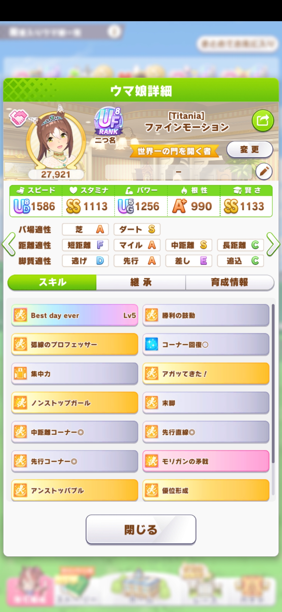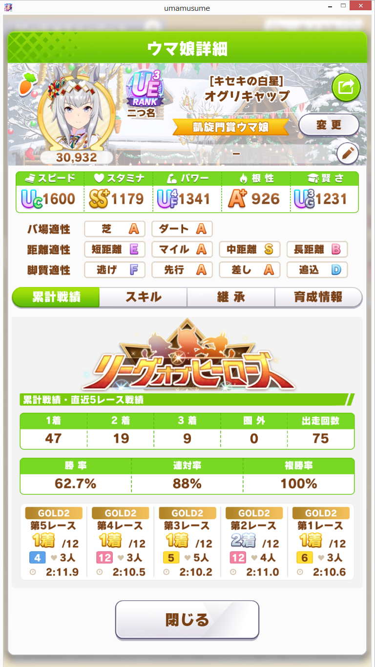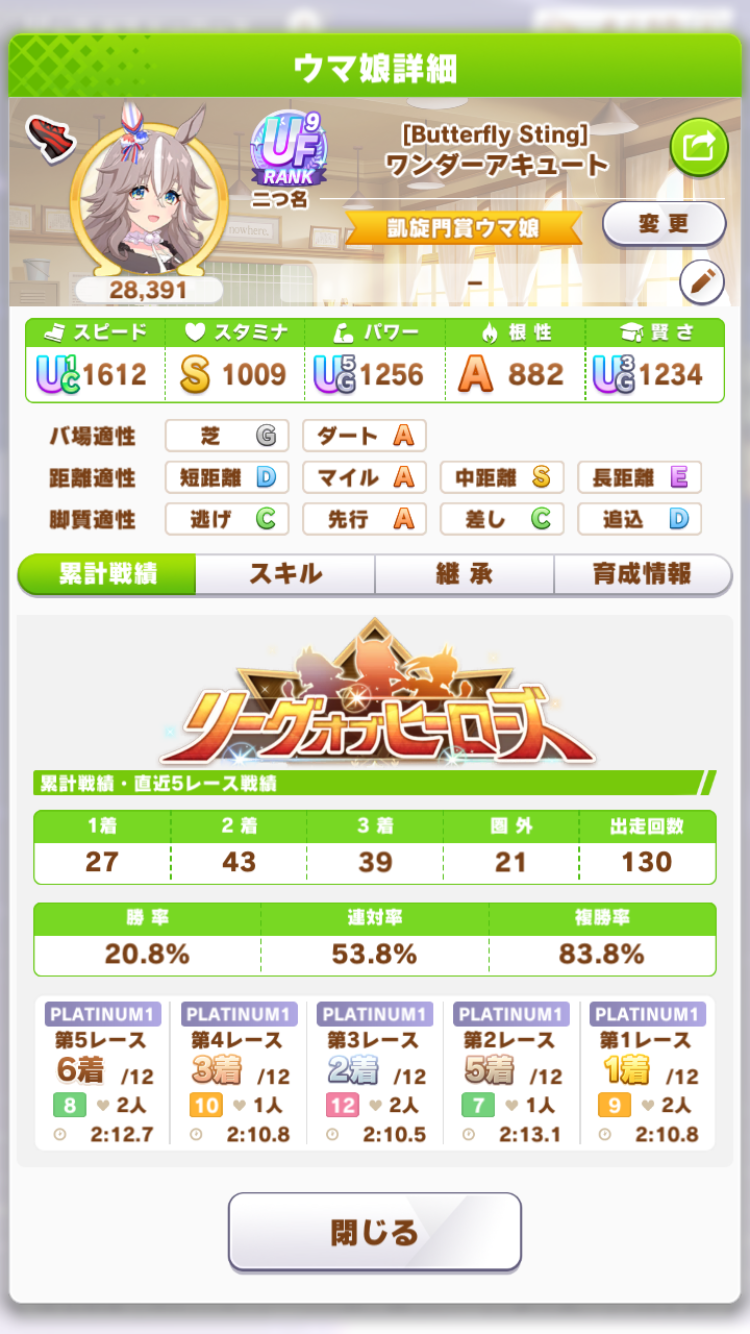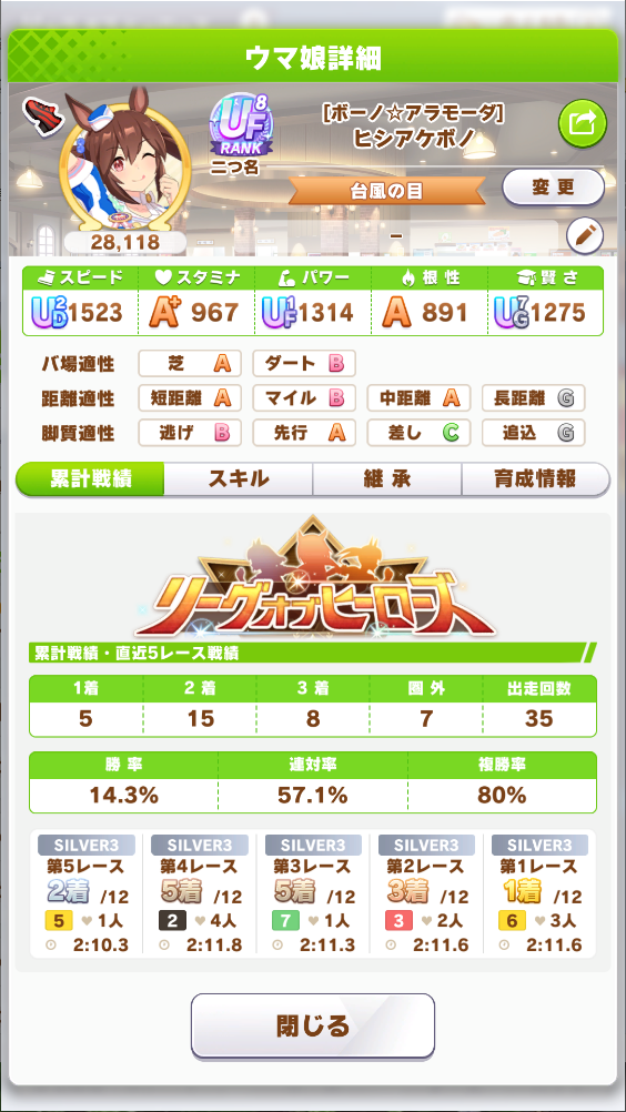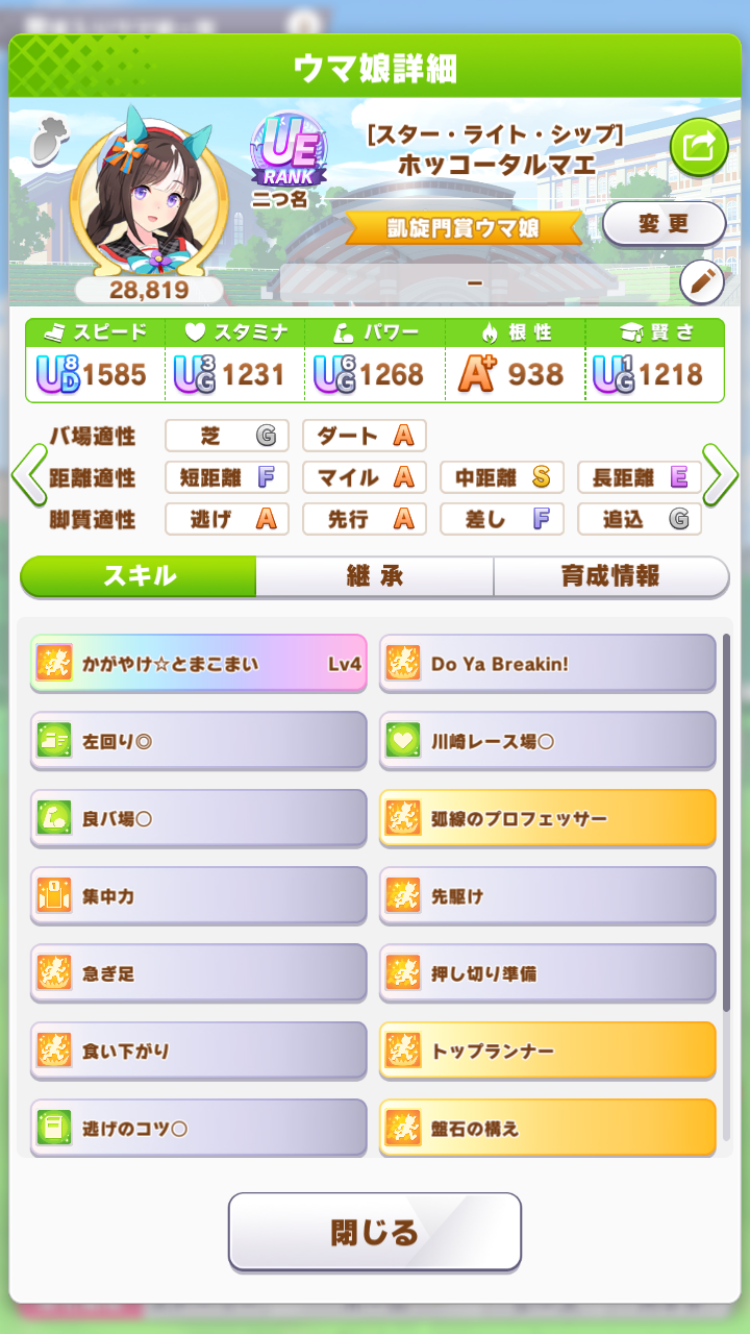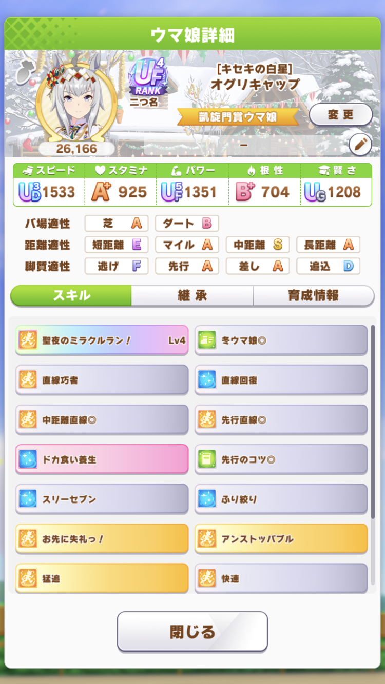 リッキーが仕上がらん…距離S付いてステも仕上がったのに緑取れねえ、スキル仕上がれば他がゴミ…