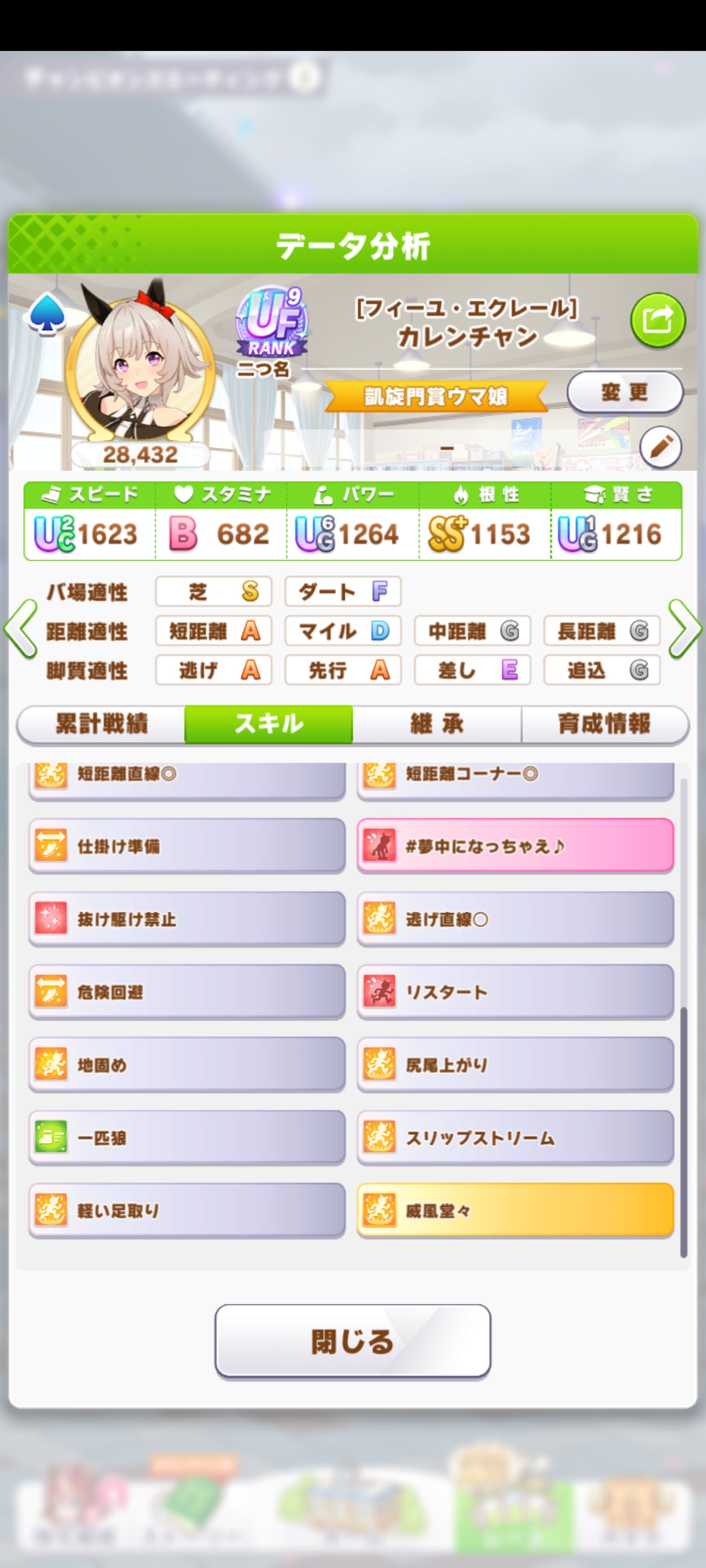 賢さ2枚でファイン入れる場合もスピードスター(抜け出し準備)は入れないほうがいい、あくまでステータスを盛るためだけ。直滑降は取ってもいいけど決意までは取らない