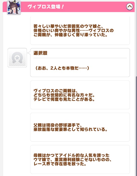 てか育成シナリオ始まっていきなり(ヴ姉妹の後だが)両親紹介してきたんだけど