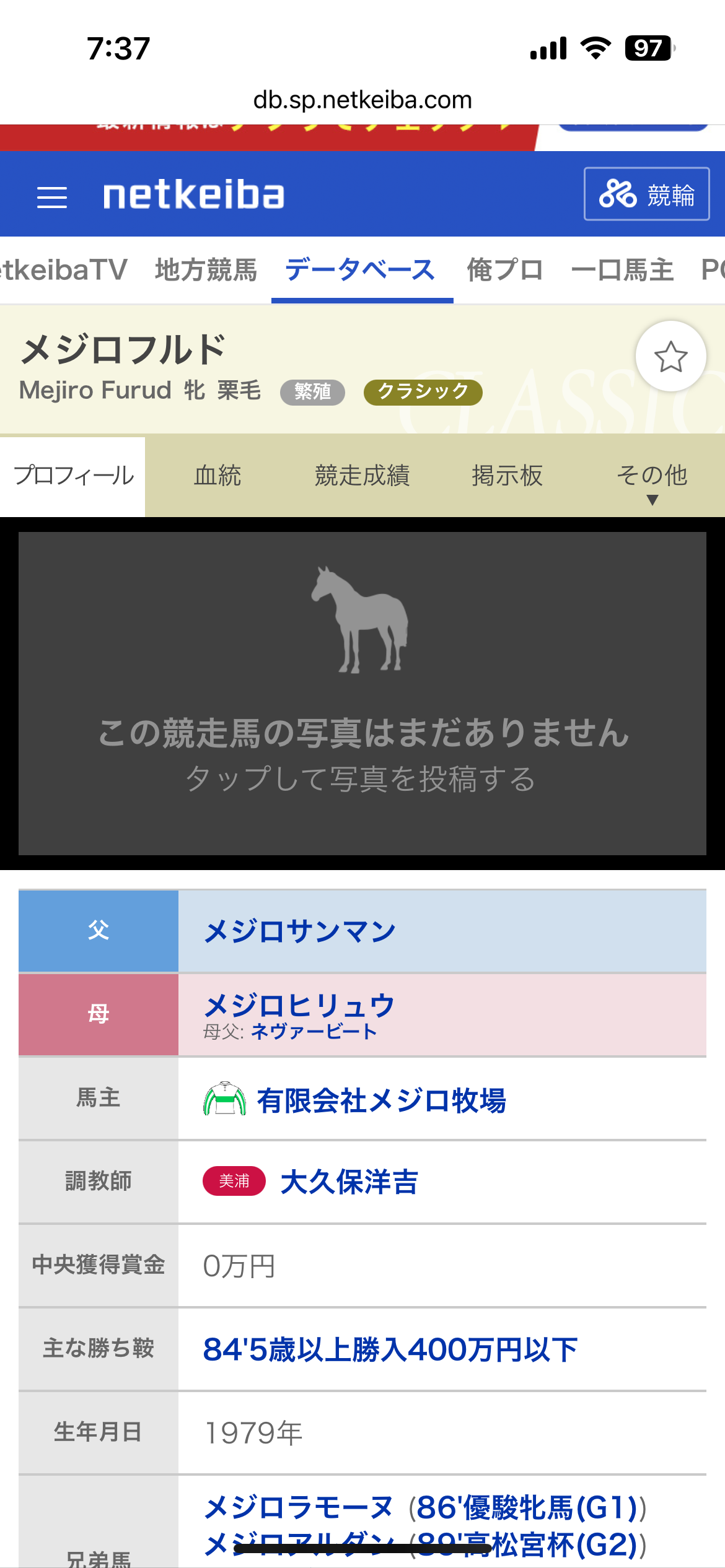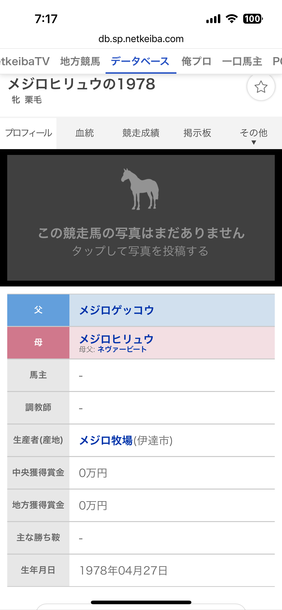 おそらくメジロヒリュウの1978も競走馬登録の前にラモーヌと戦い行方不明になったことからデータが無いと考えられる