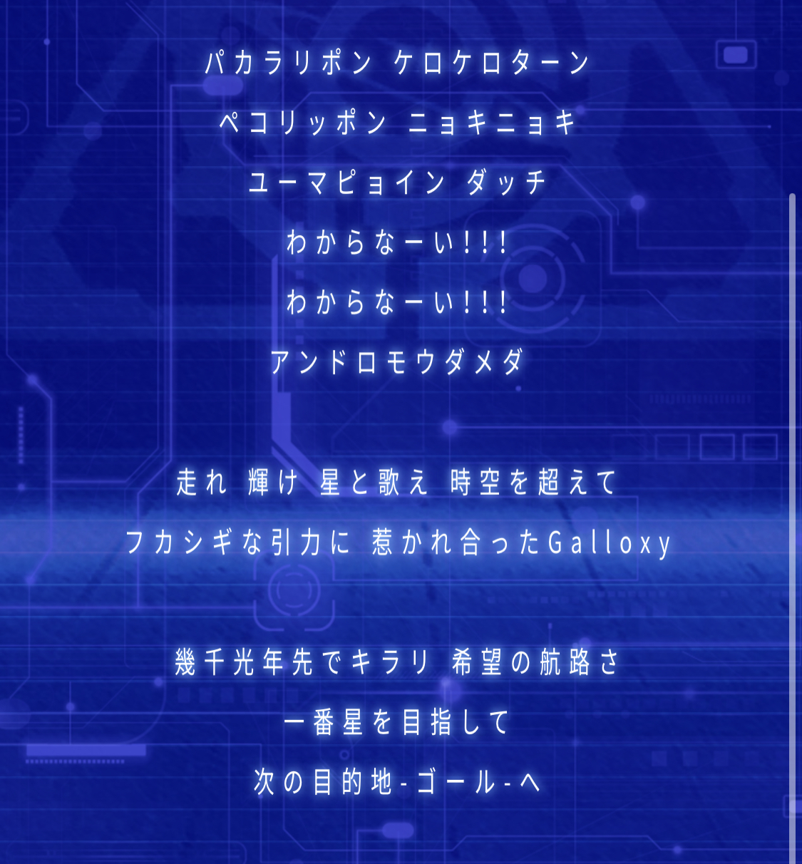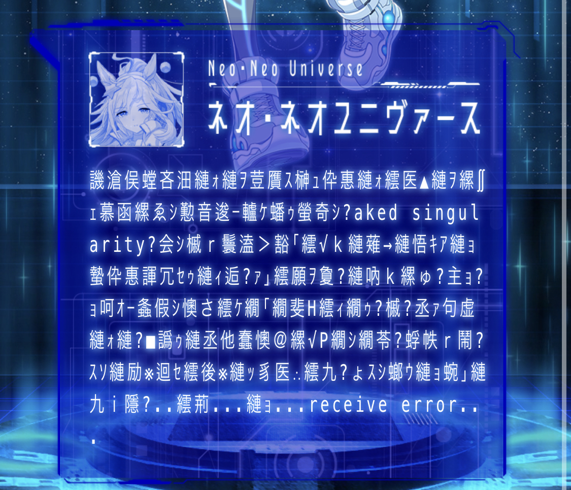 星間宙域にて上位存在によって、誕生。<特異点崩壊(naked singularity)>を食い止めることが己の存在意義と理解り覚醒する。『宇宙走娘<コスモピュエラ>』始動にいち早く呼応し、ワープ能力を駆使して現れては消える。彼女の口から語...れt...の...receive error...