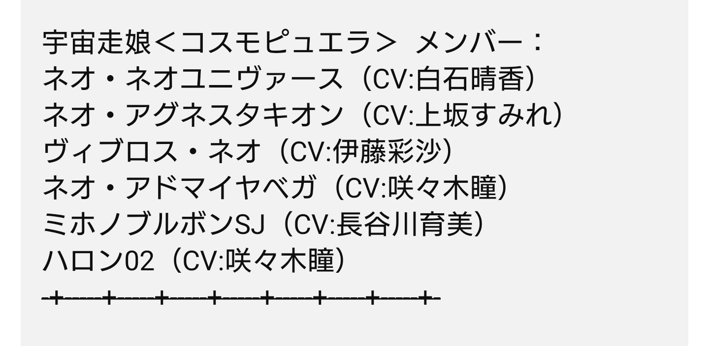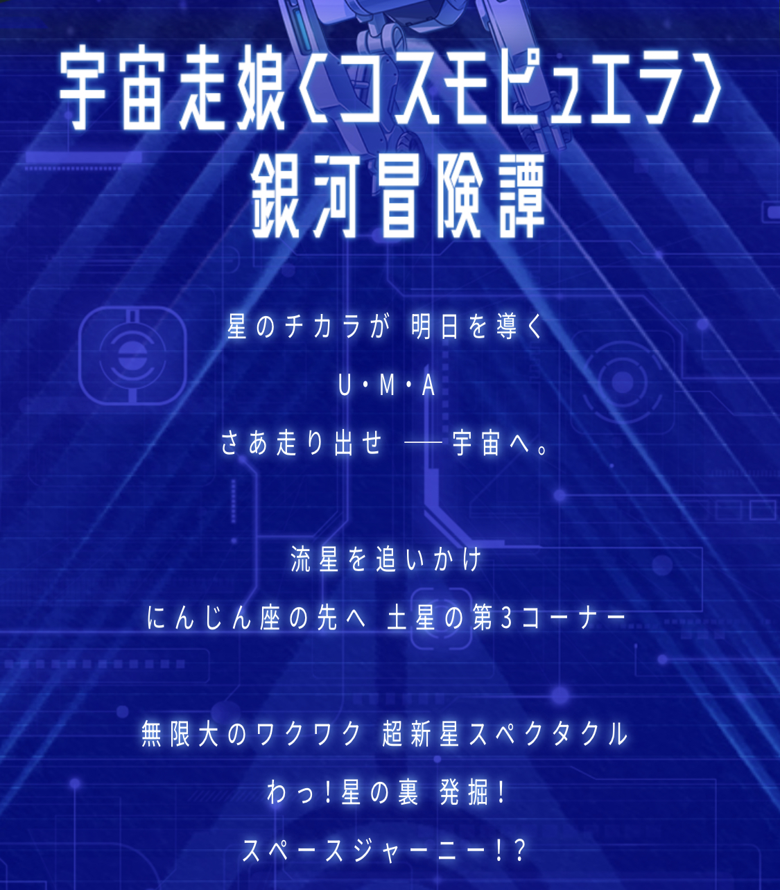 『宇宙走娘<コスモピュエラ>』のリーダーおよび発起人。観測されることでしか確定しない未来において、果てしなく巨大な<特異点崩壊(naked singularity)> を観測する。「UMA STARS」とは?銀河の調停者とは?知識の深淵に触れたとき、物語は宇宙を巻き込む渦となっていく。彼女がコクピットに刻んだ数式は帰還の鍵となる。