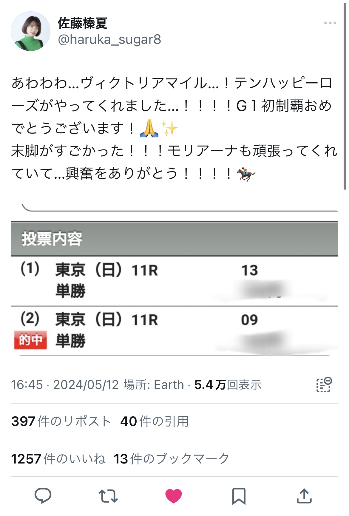 ヴィクトリアマイル→テンハッピーローズ(208.6倍勝利)、モリアーナ