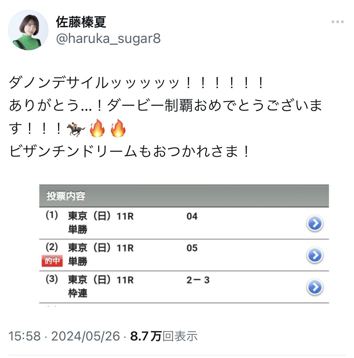 ダービー→ダノンデサイル(46.6倍勝利)、ビザンチンドリーム