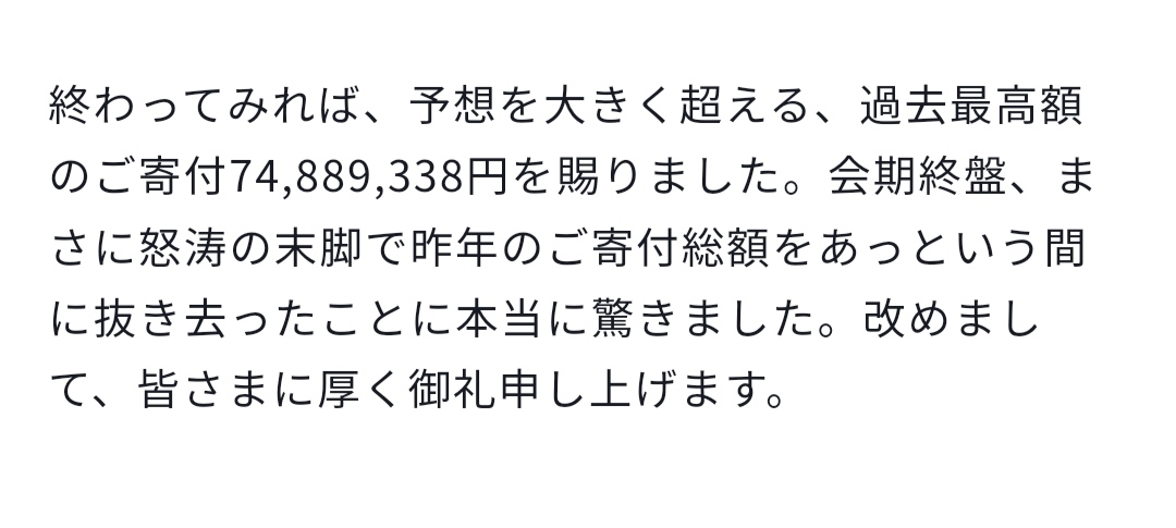 公式から「怒濤の末脚で去年の額を抜き去った」って言われてて笑った