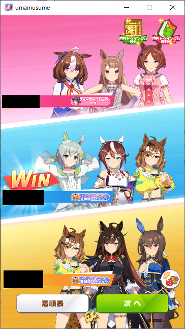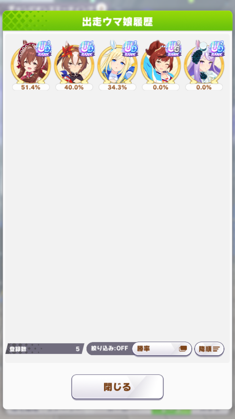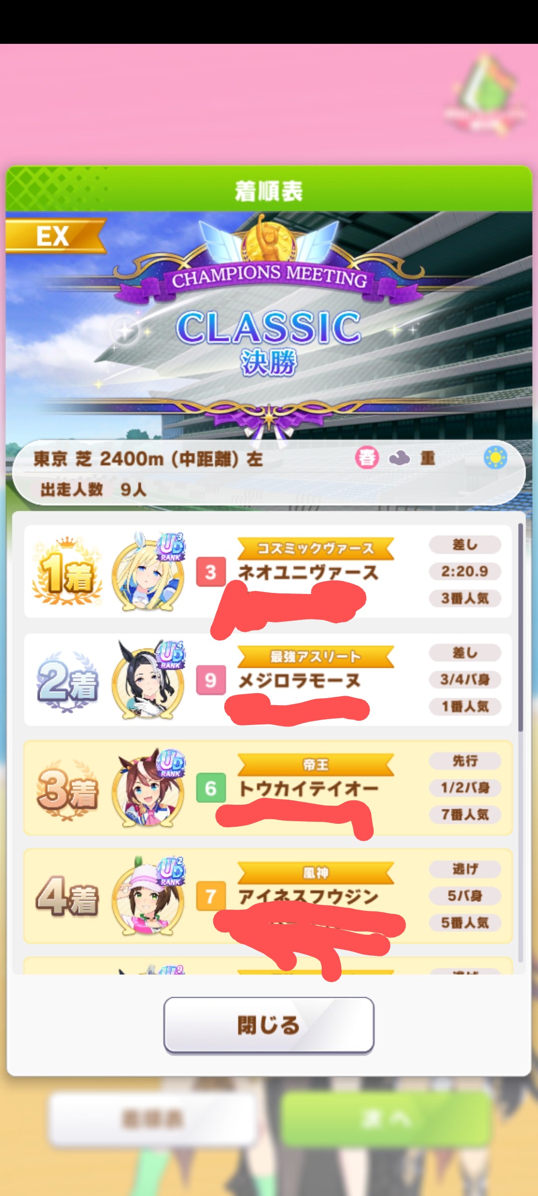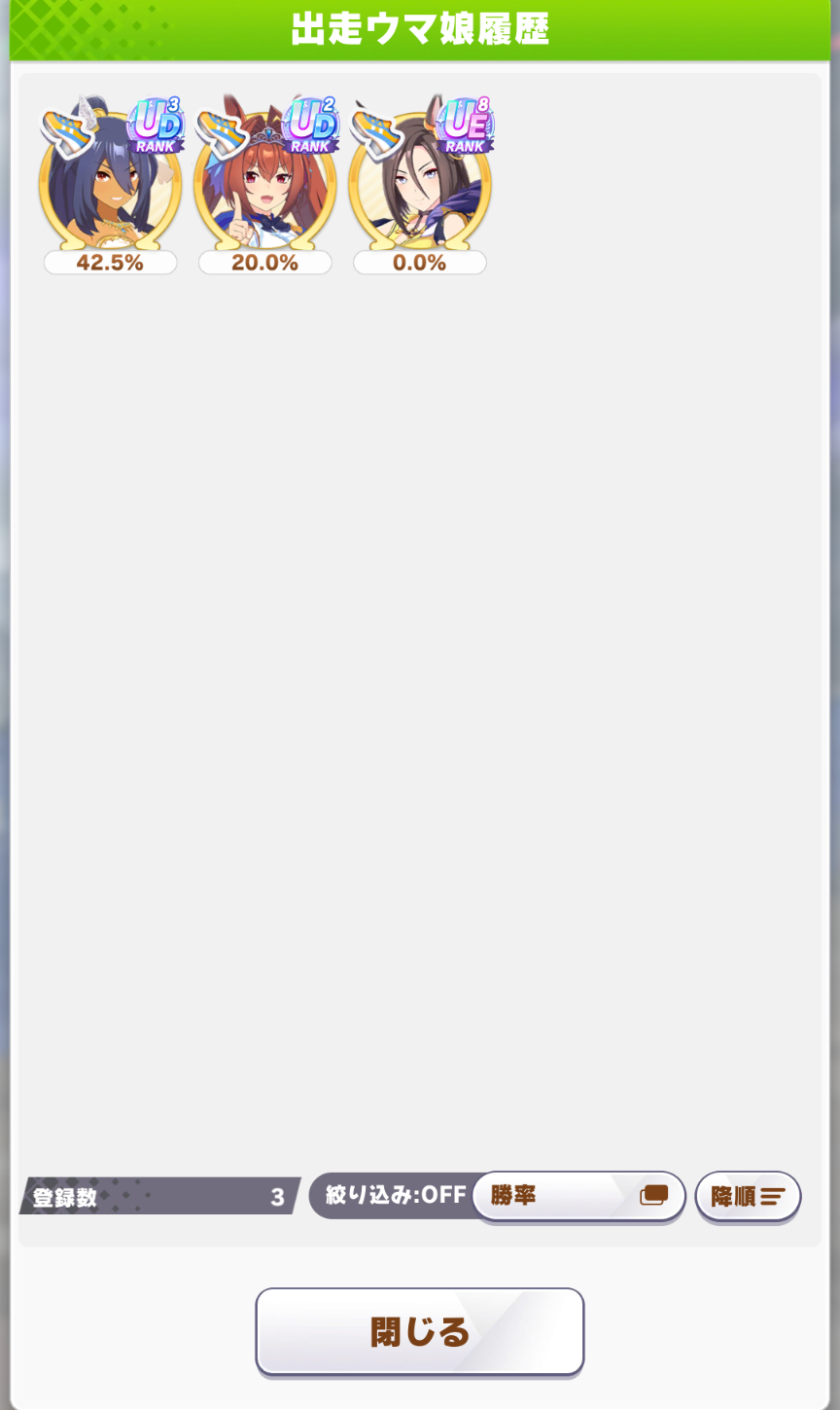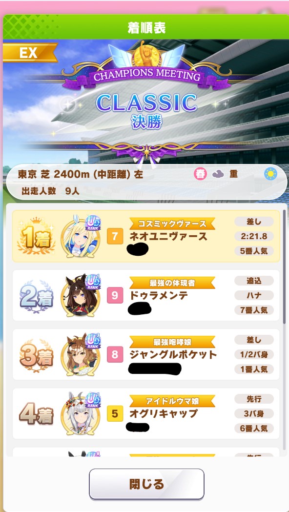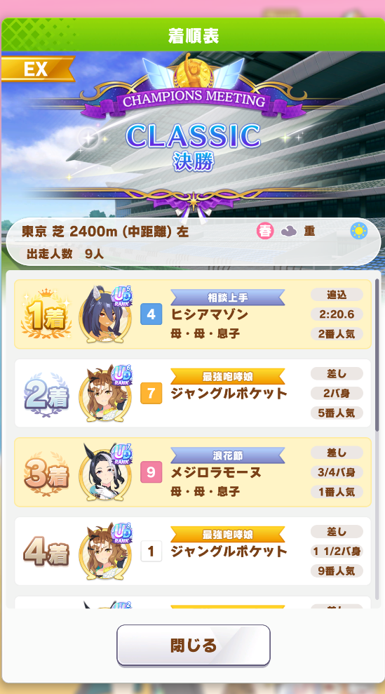 なんとか勝てたので報告。王手のすごさ再認識(1着の☆2ダスカは逃げだから王手ないけども)