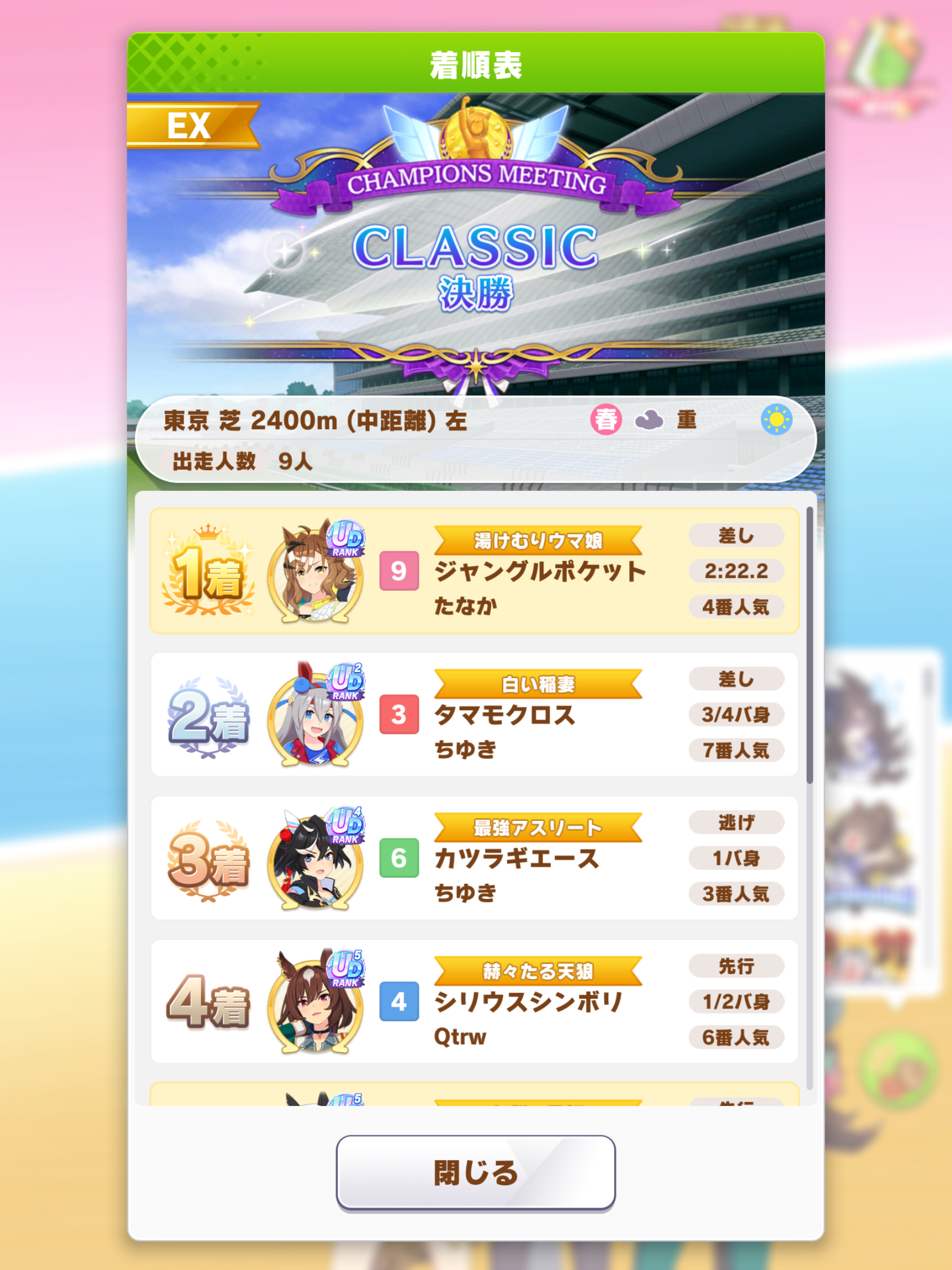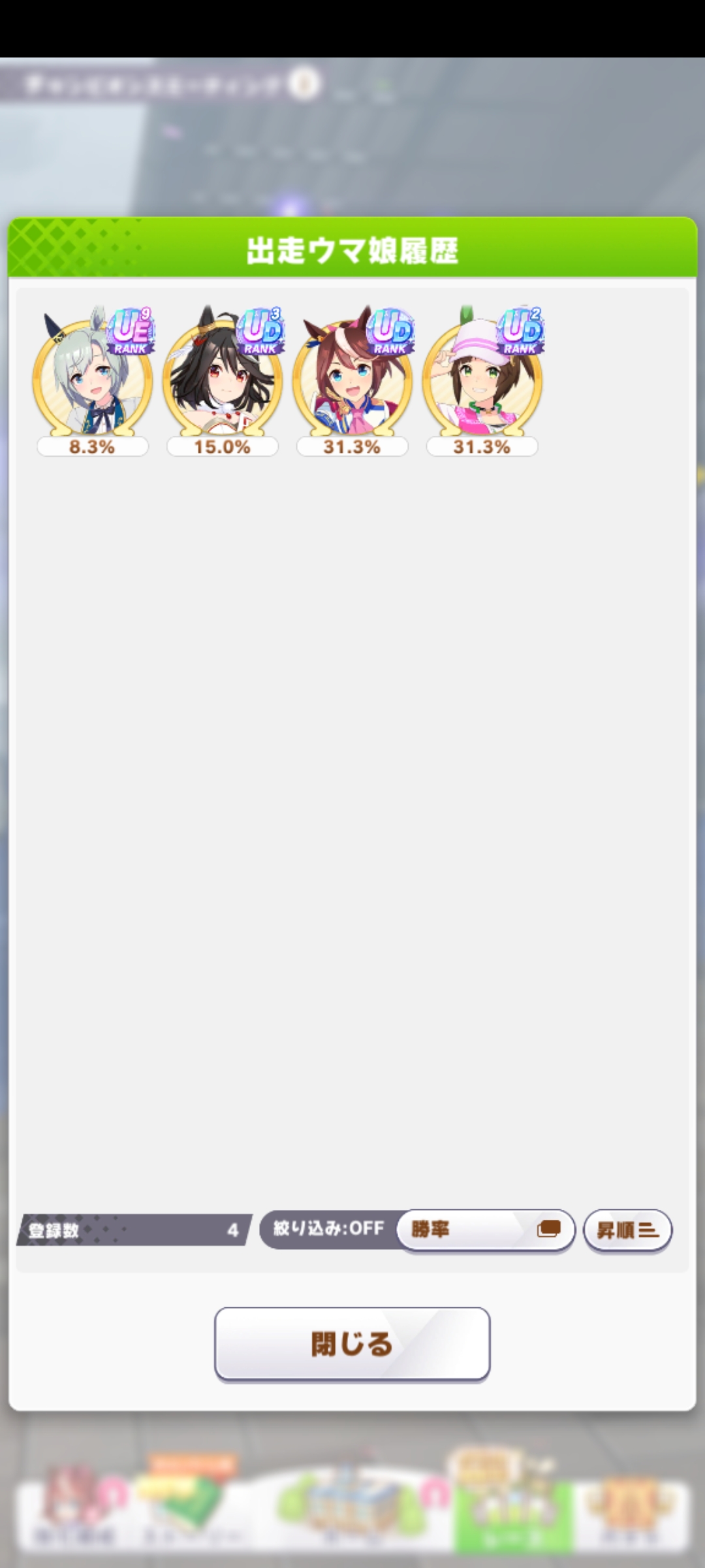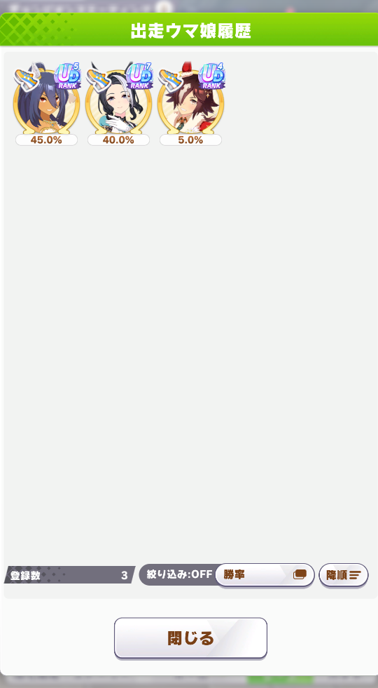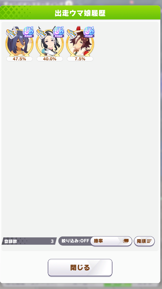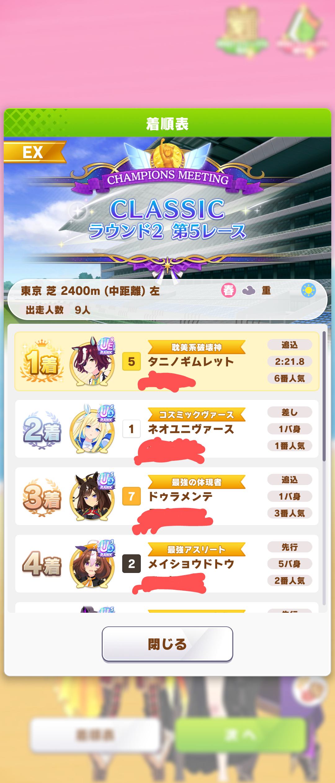 なんとか勝てたので報告。王手のすごさ再認識(1着の☆2ダスカは逃げだから王手ないけども)