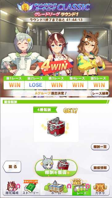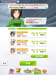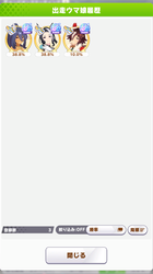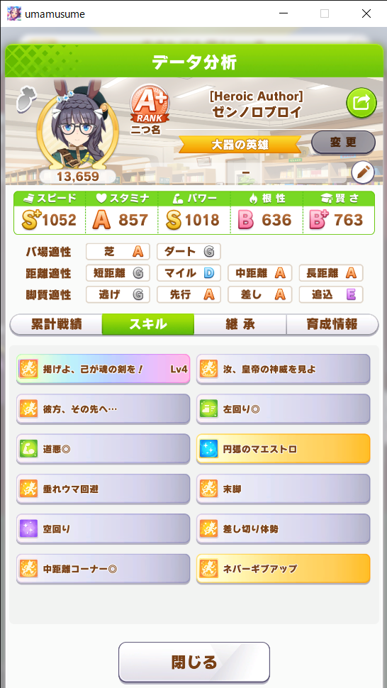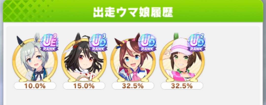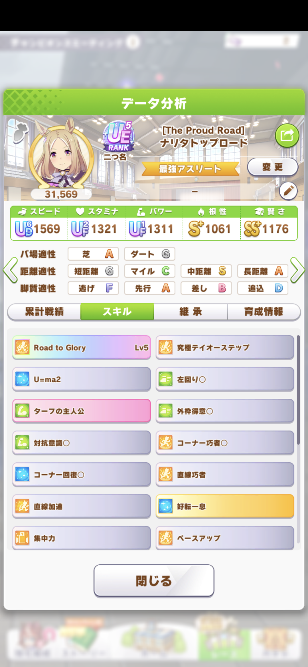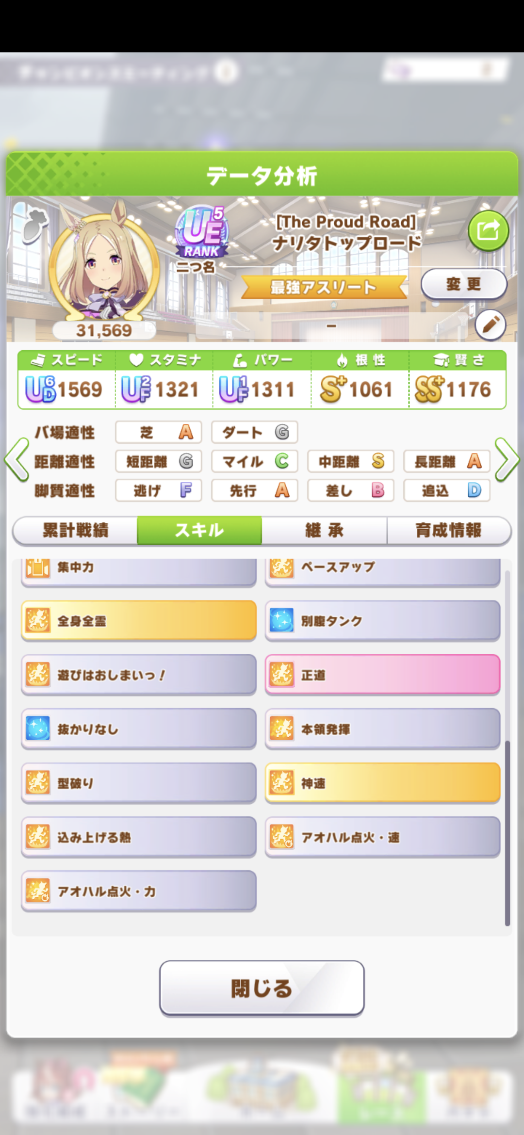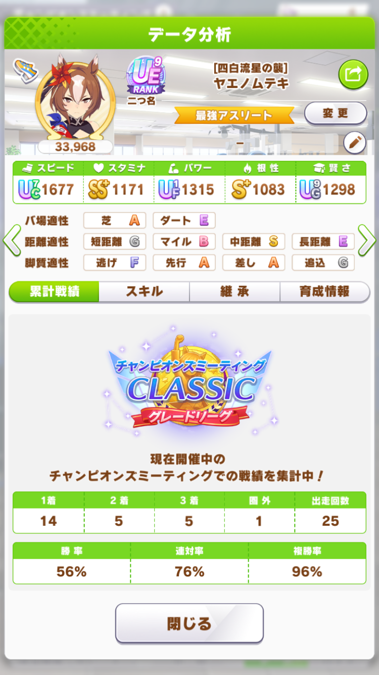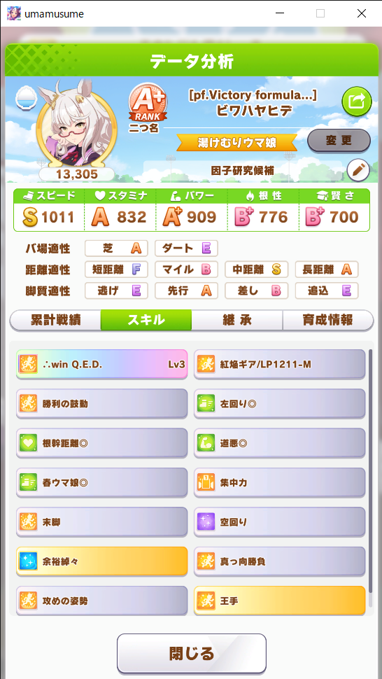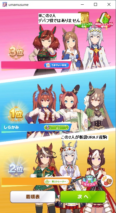 ワンチャンと王手の発動位置はあまり被らないけど無いよりはいいかなと思って、快速も折れない心もヒント貰えなかったから泣く泣く神速ネバギバ抜いてて中盤力皆無だったし(なお、一応ルムマで試走させたけど結局終盤5位突入すら無理だったという欠陥品)