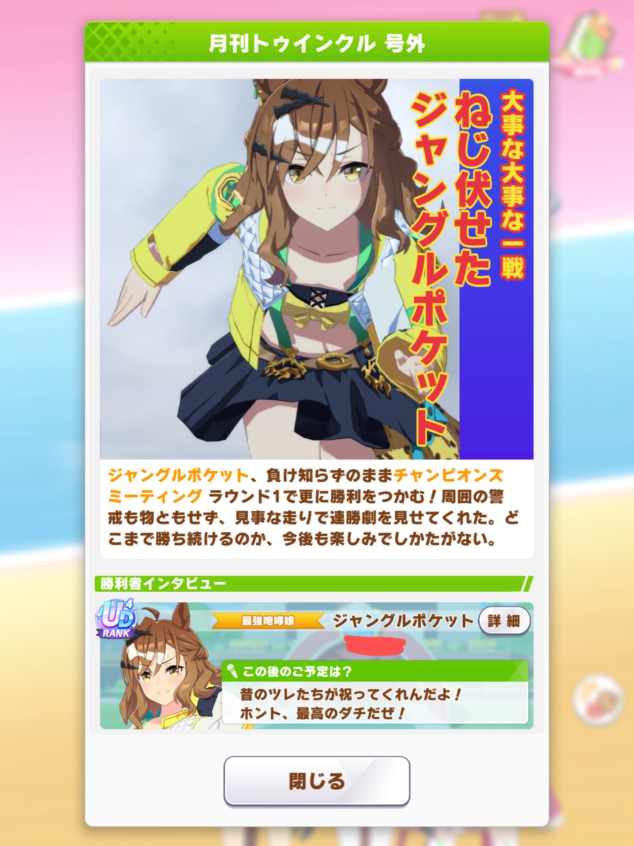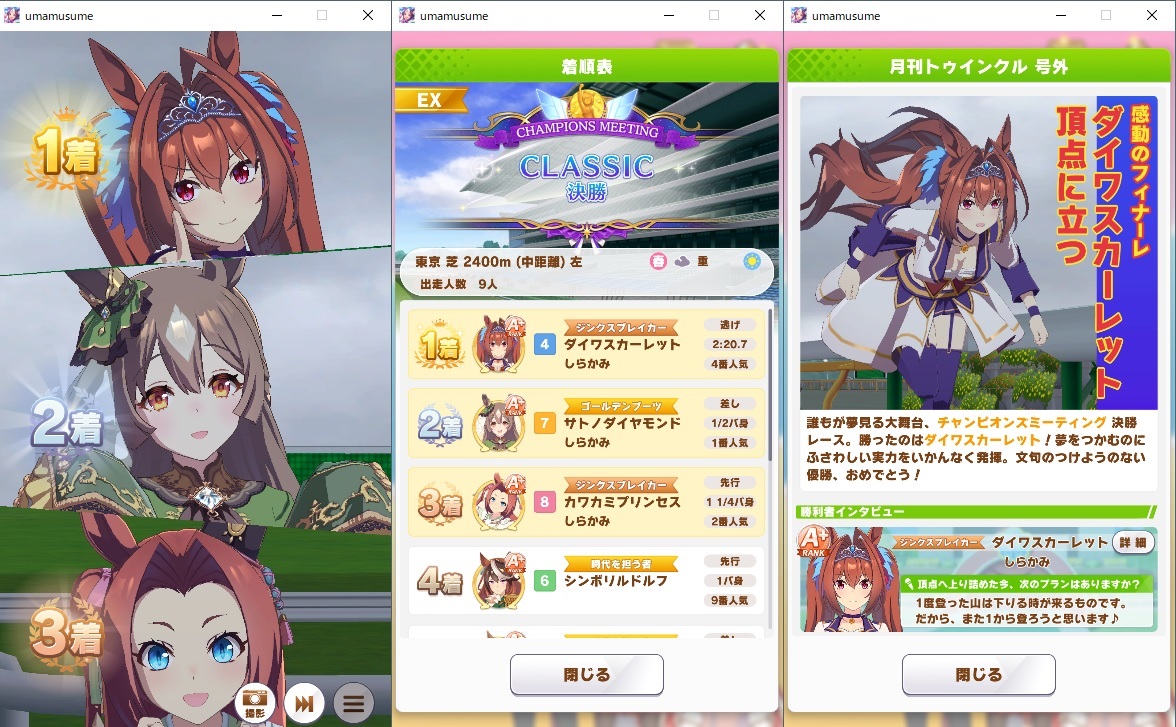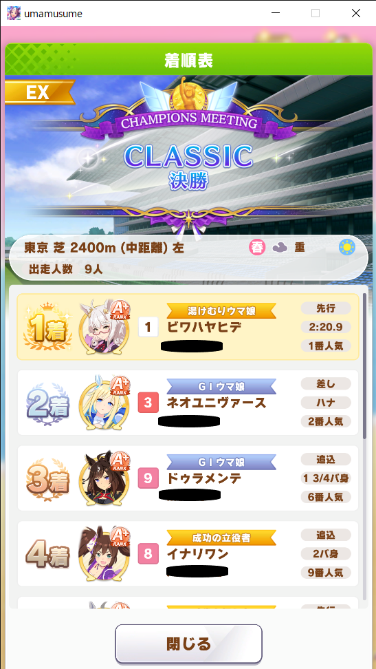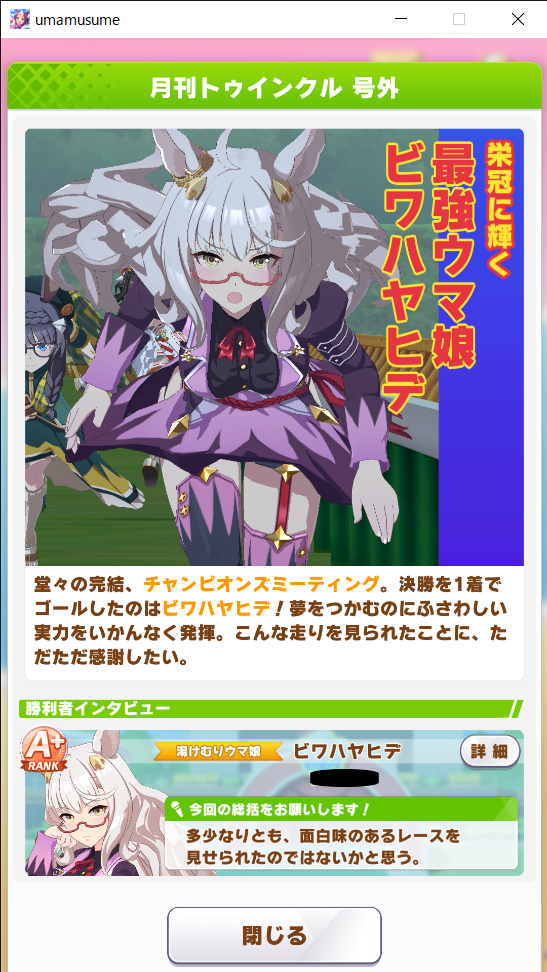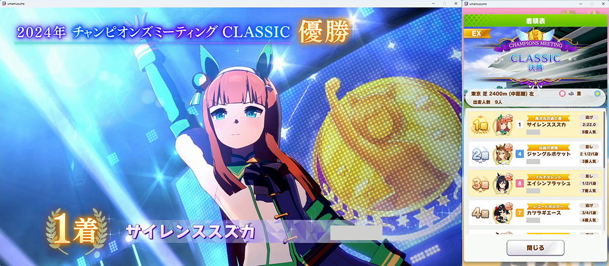 さて応援や祝福の言葉を掛けていただいた皆様ありがとうございました。今回のチャンミ19440のラスト200mで笑えるぐらいにぶっ飛んでいったヒシアマさんの雄姿…いや雌姿を最後に新シナリオと8月チャンミに移ろうと思います。それではありがとうございました。
