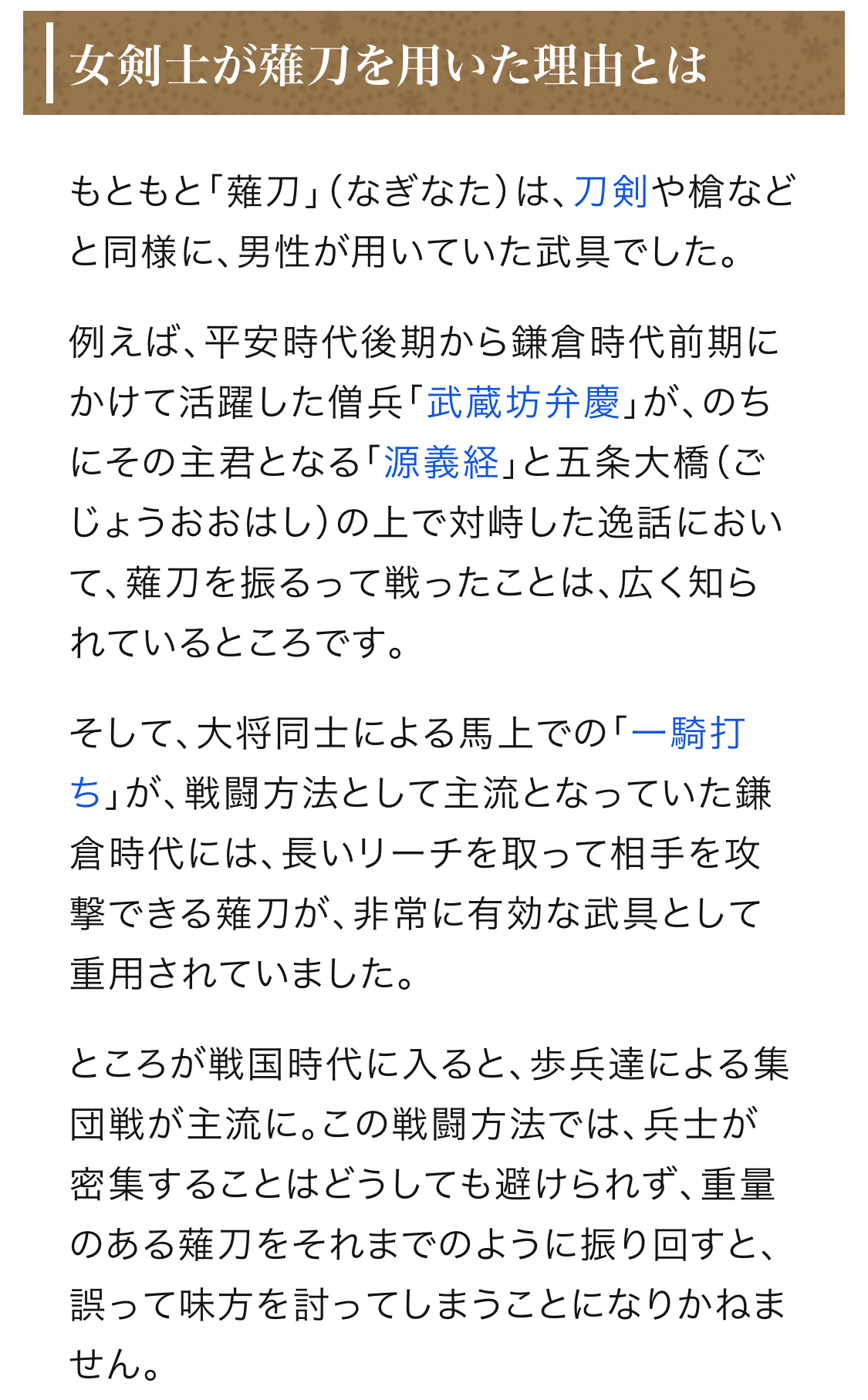 合戦だとナギナタは長いから使いにくそうだけど、1対1だったら刀より強そう まぁ持ち歩きが不便とか色々あるんだろうけど