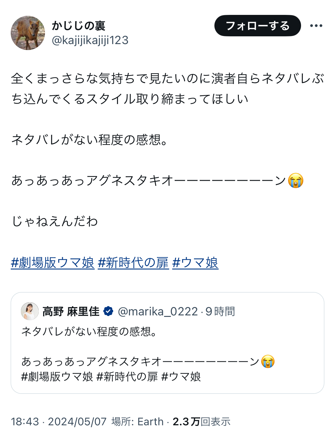 アグネスタキオンの名前を叫んだだけでネタバレになるらしい