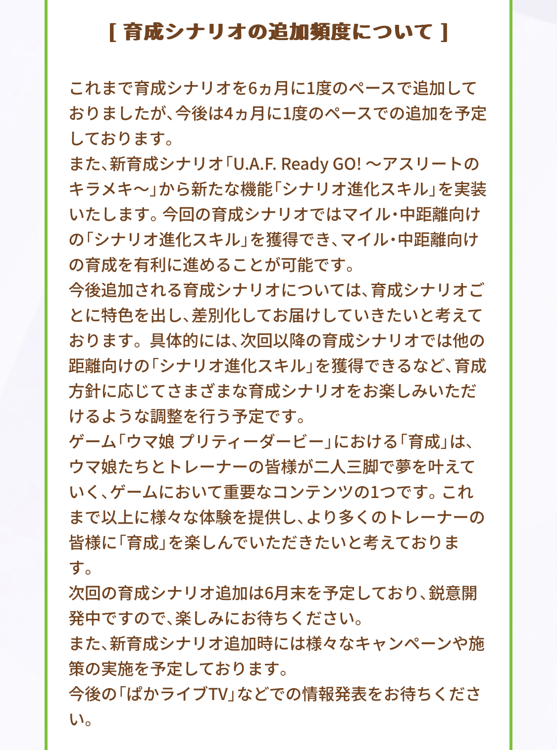 もし次の育成シナリオに切り替わる月にその前にシナリオ向け条件のチャンミorリグヒやる流れが今後も続くなら(来月中旬中距離チャンミ&シナリオ切り替わりタイミング)