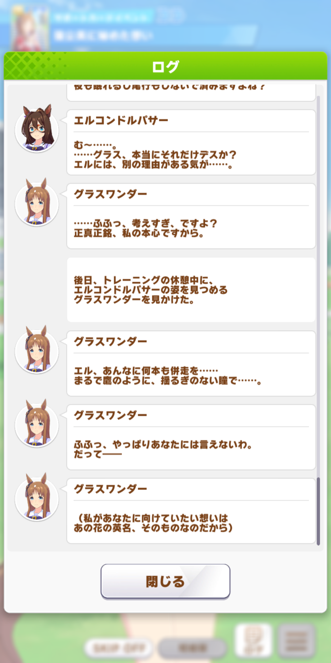 文章だけ読むとトレーナーからグラスへの想いっぽいけど、サポカイベントを見てから読むと、グラス→エルか、エル→グラスの、親友との他愛ない日常を愛おしんでいる想いにみえてくるよね