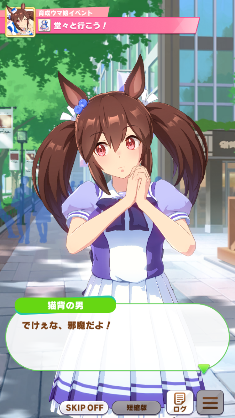 臆病で警戒心強くて、ガツガツいくようなタイプではないので。懐いてる感じではなくて、ほどよい()関係が持てるウマ娘かな。